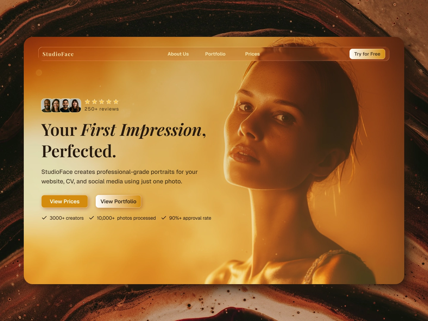 StudioFace’s hero section combines a clean, portrait-led design with a simple promise: professional headshots without the studio. A natural, soft-lit human portrait anchors the right side of the screen, leaving room for clear, benefit-driven copy on the left. Short bullet points outline the core features, and social proof adds credibility. The typography pairs elegance with approachability, aligning with the brand’s focus on personal branding and professional image-making.