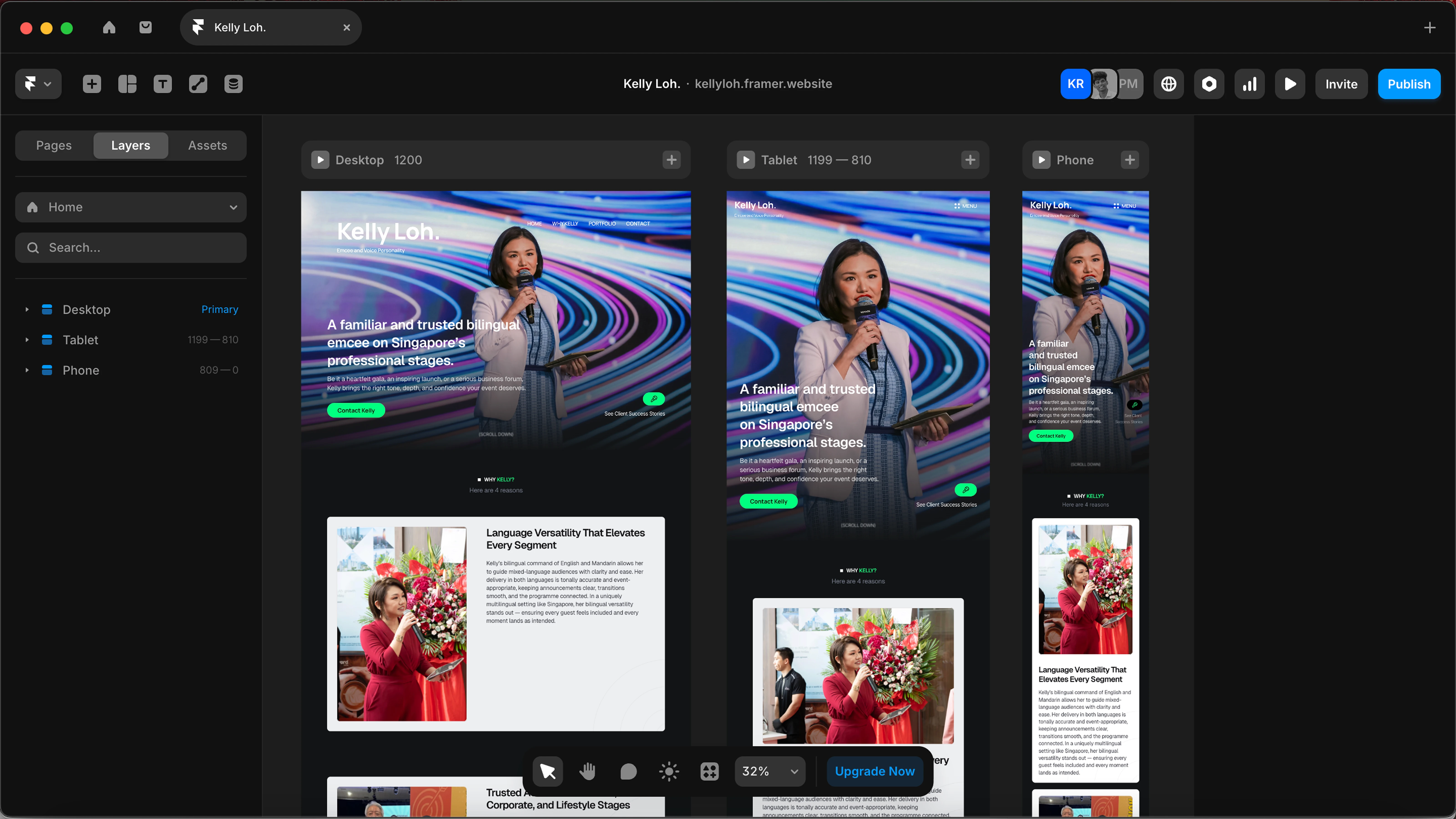 Designed and developed a professional portfolio in Framer for emcee Kelly Loh. The site showcases her hosting experience and builds trust with event organizers.