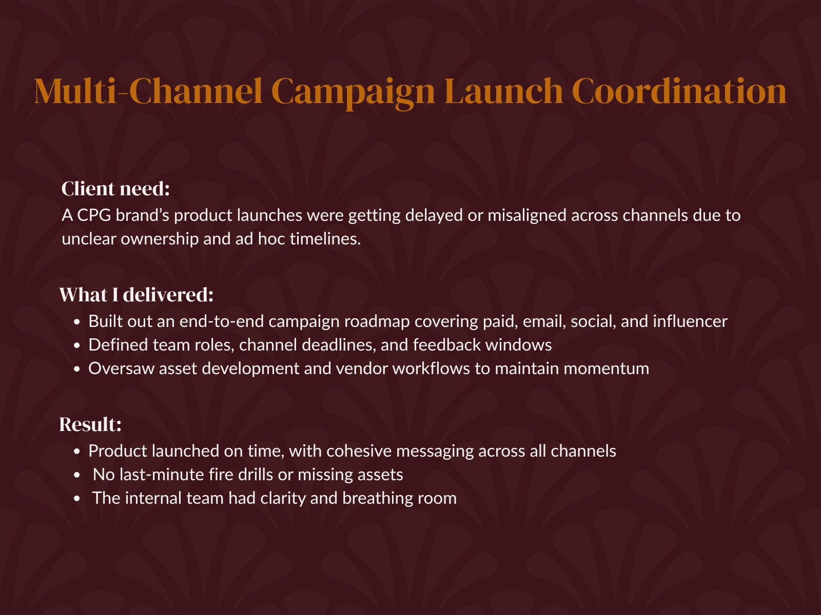 Led a multi-channel product launch across paid, email, and social—delivered on time, aligned across teams, and free of last-minute chaos.
