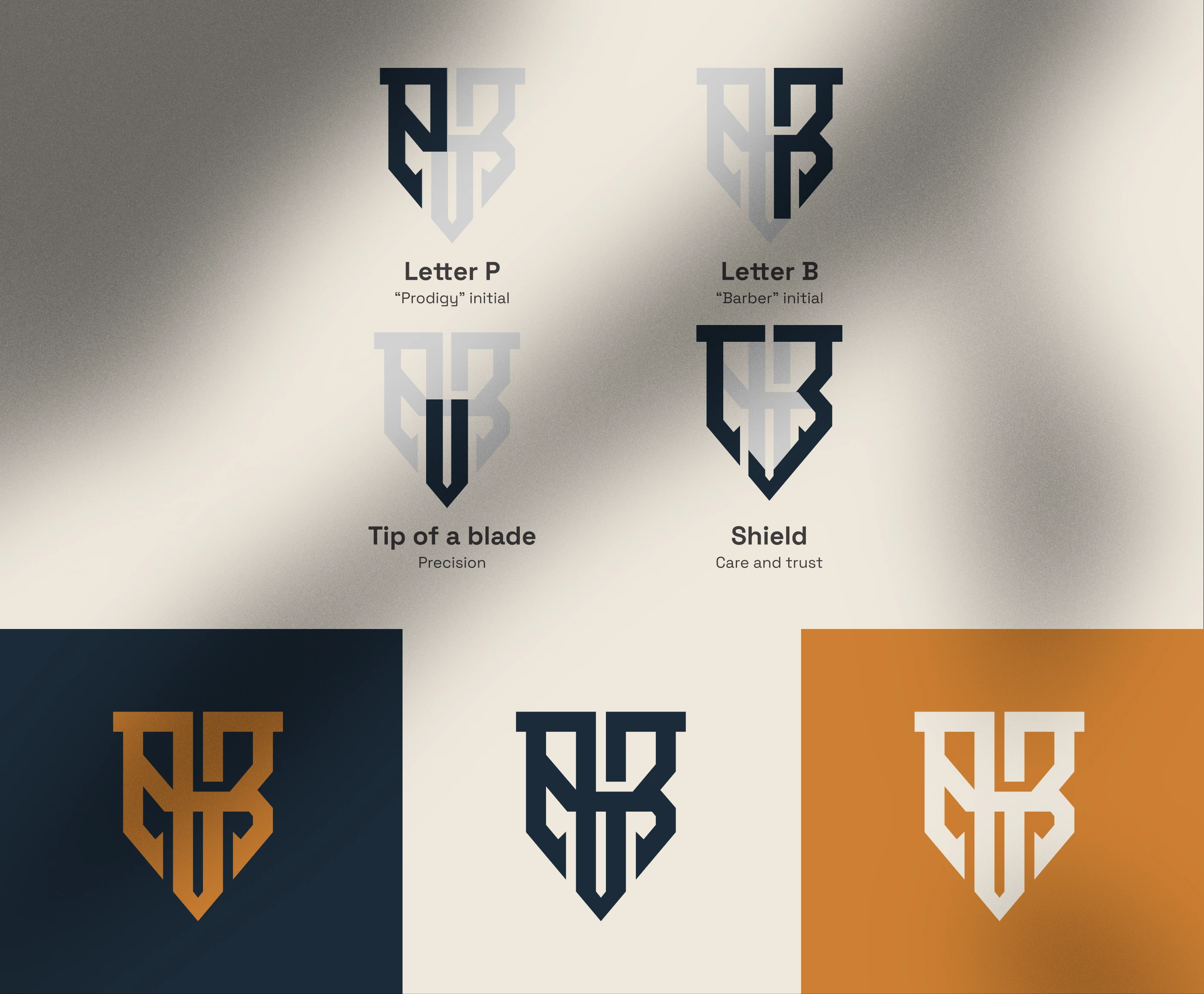 The logo symbol is a refined fusion of the initials "P" and "B", forming a bold, shield-like shape that conveys strength and confidence. At its core, a subtle blade emerges between the letters — representing precision, transformation, and the craft of barbering. The sharp, geometric lines at the top reflect sophistication and modernity. Altogether, the design expresses elegance, attention to detail, and professionalism — the pillars of the Prodigy experience.
