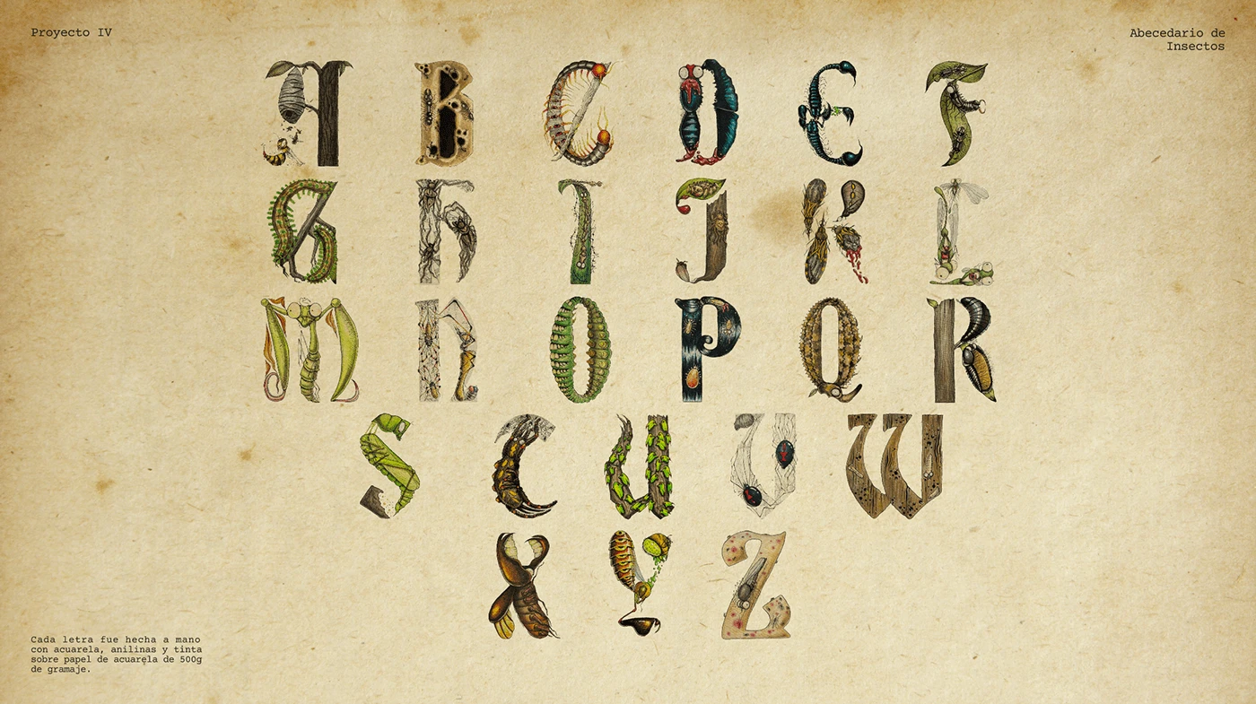 Created an illustrated alphabet with the prompt Horror and Animals, which was later reduced to Insects.