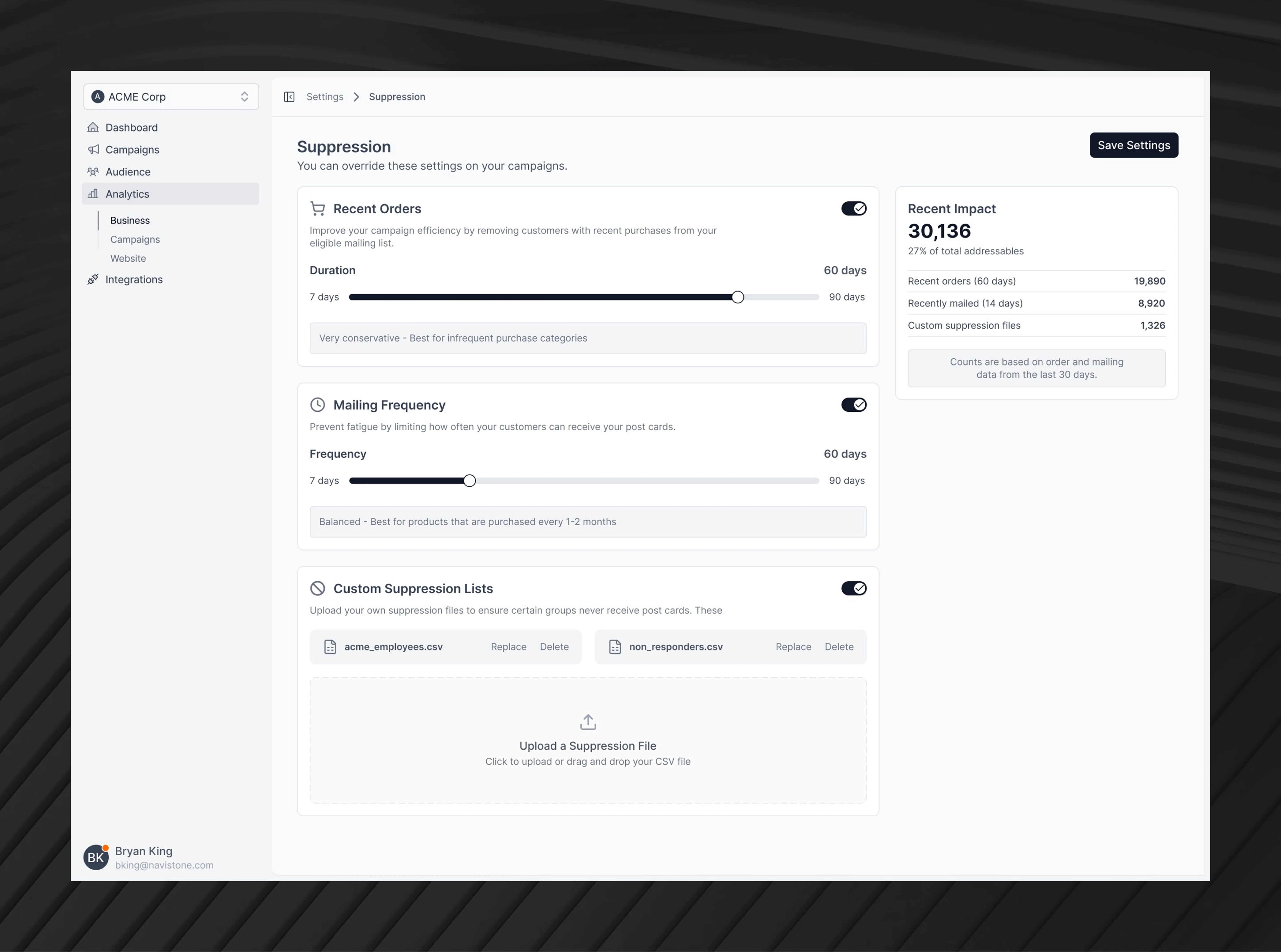 Advertisers can update their suppression settings, ensuring that they don't send campaigns to people who've recently made a purchased or received a post card.