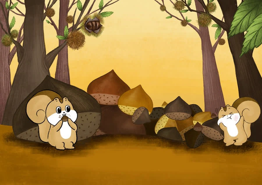 Picture book illustration of a squirrel eating chestnuts stacked on top of each other.