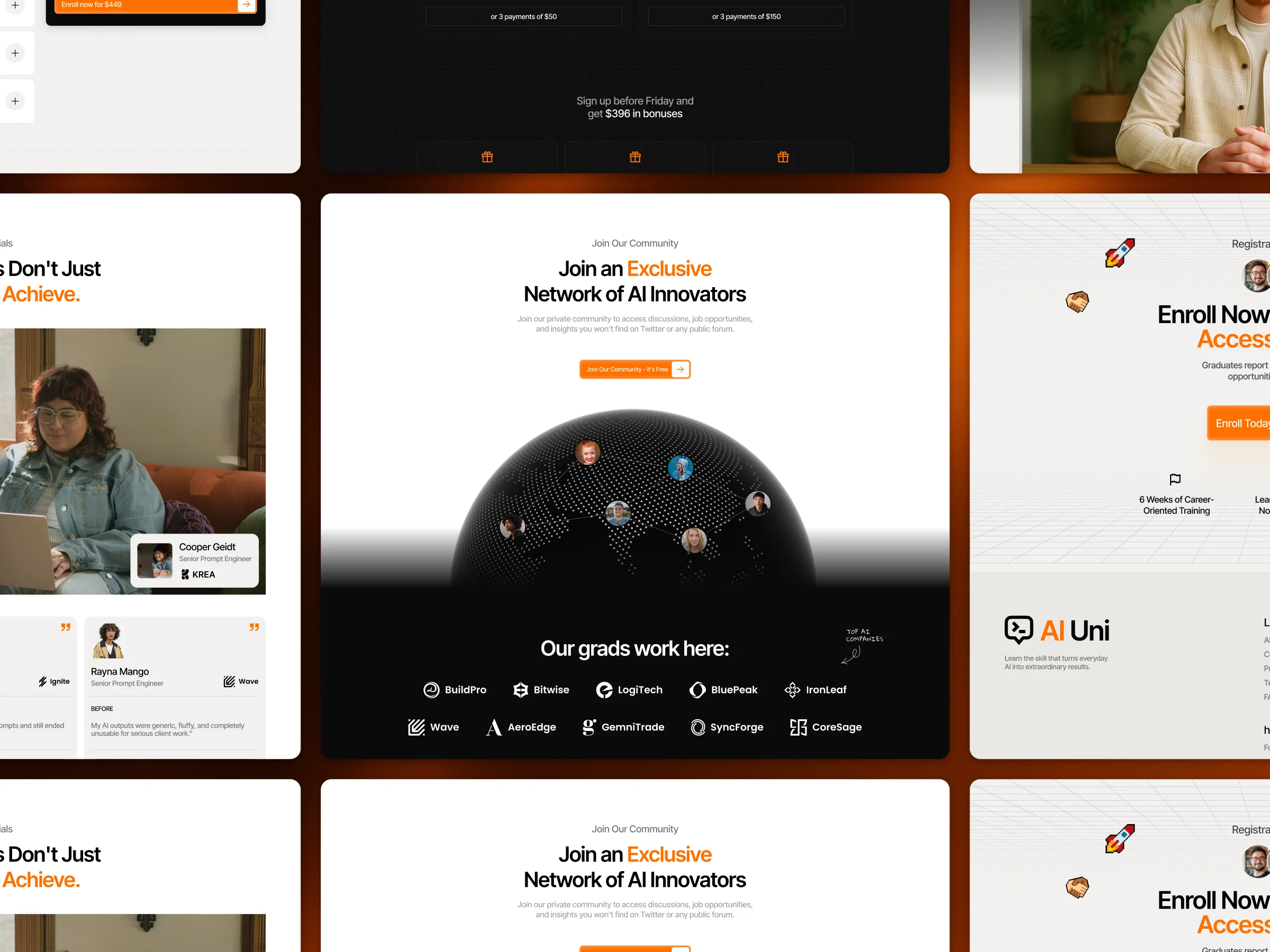 A high-converting course landing page template. Showcase your curriculum, build trust with testimonials, and drive sign-ups with clear CTAs.