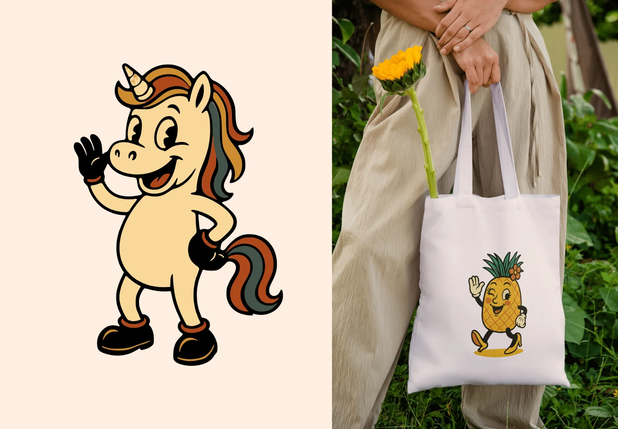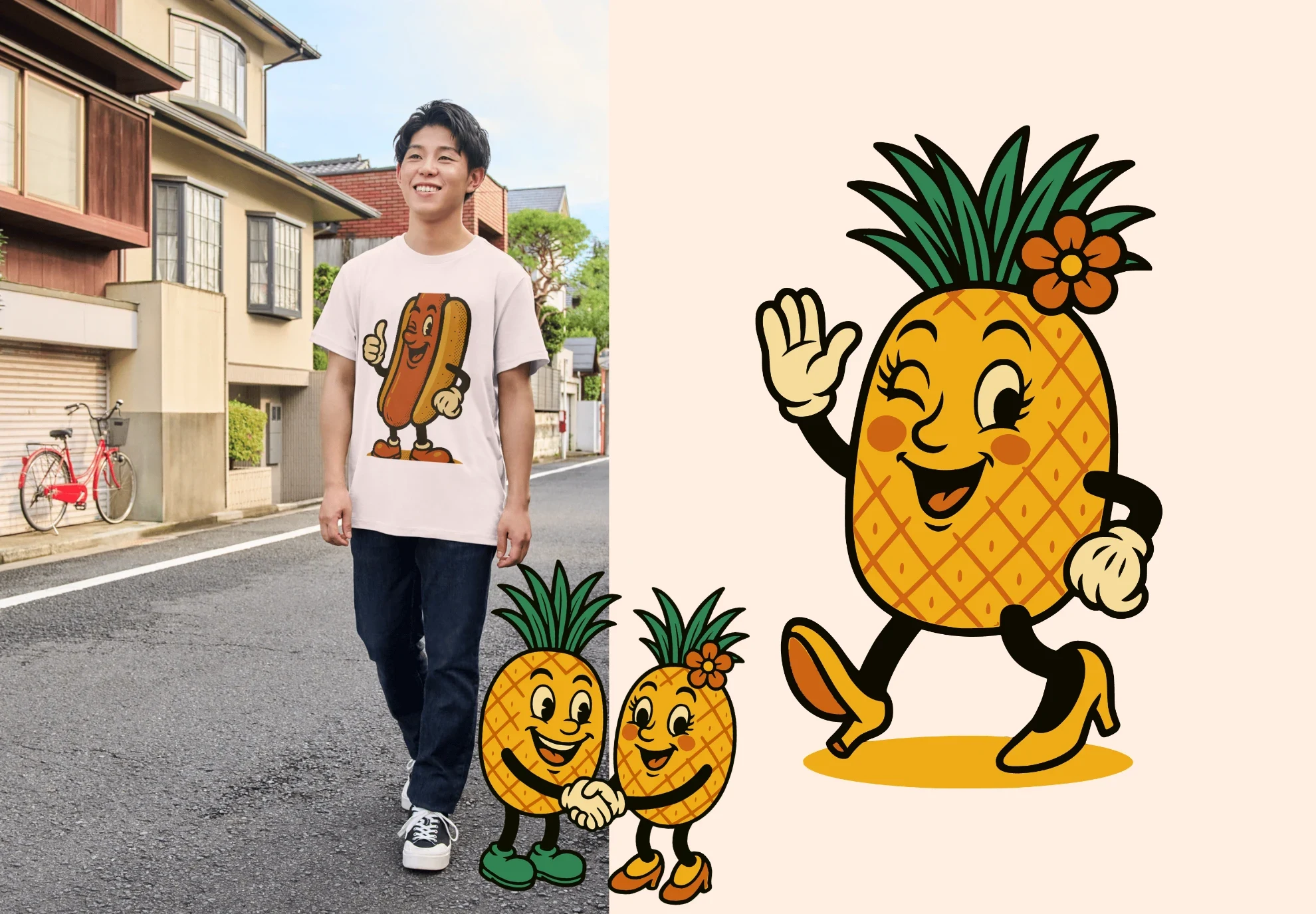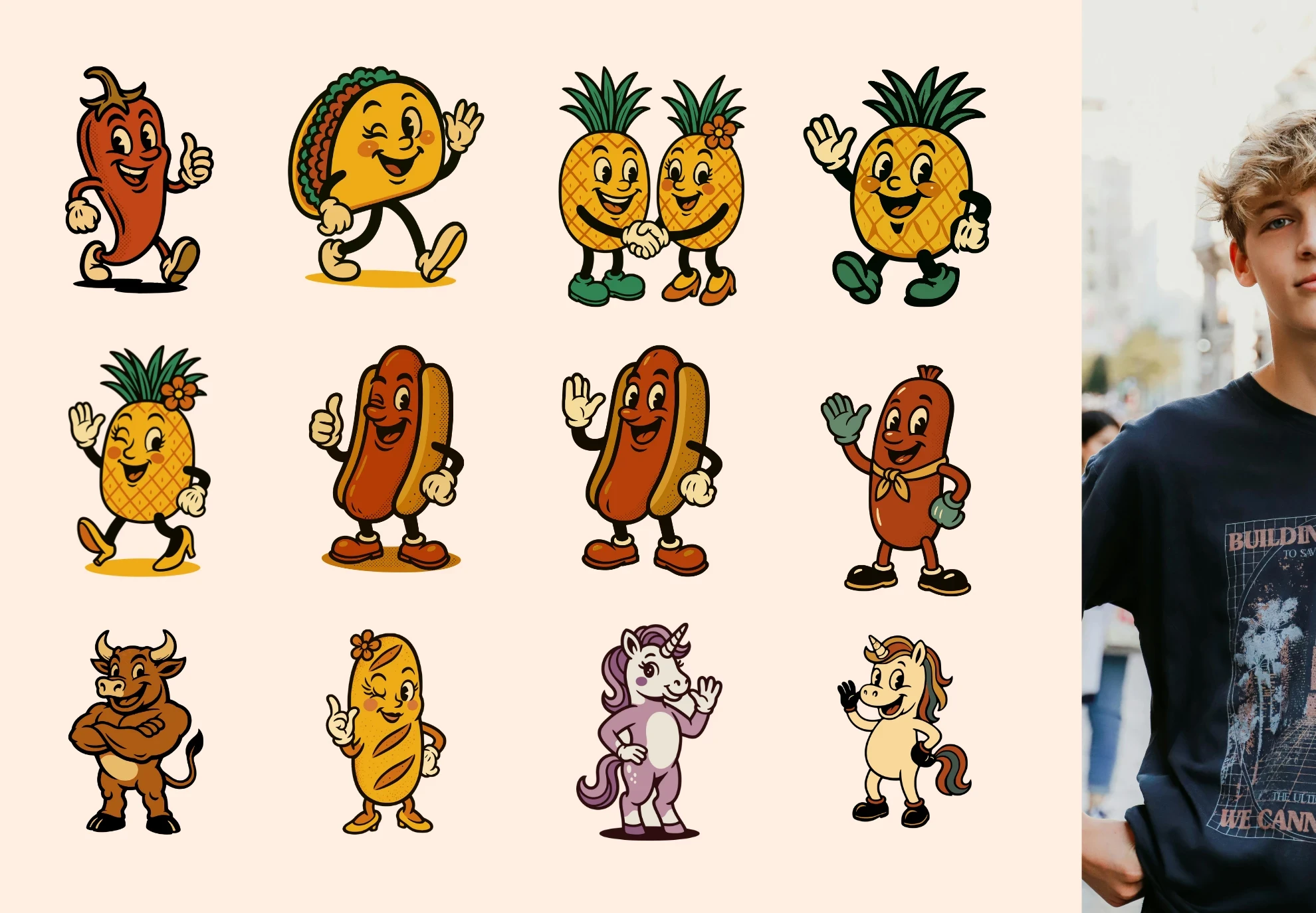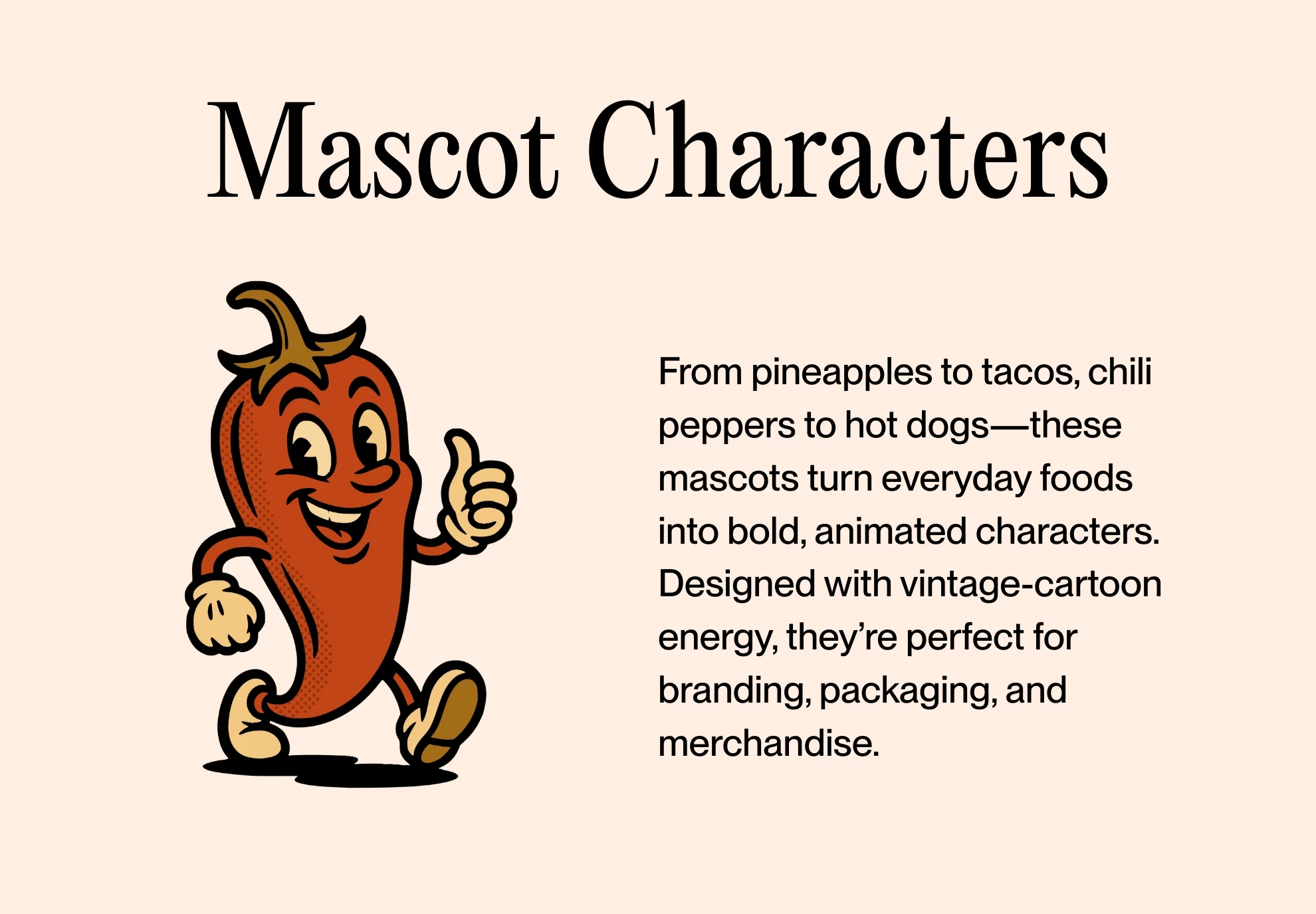 Food Mascots – bold, vintage-inspired characters like pineapples, tacos, chili peppers, and hot dogs, ideal for branding, packaging, and merchandise.