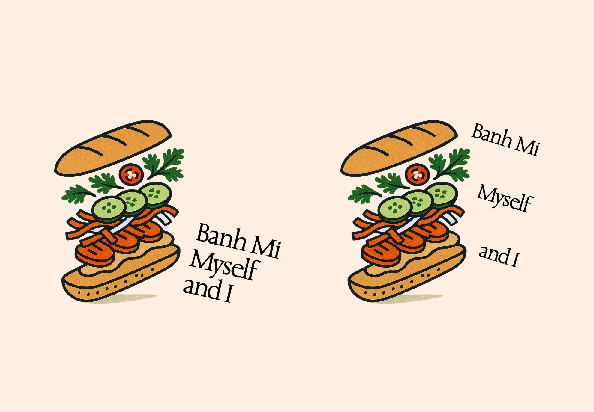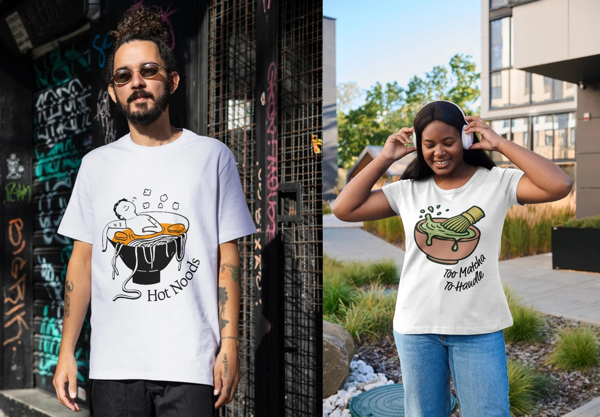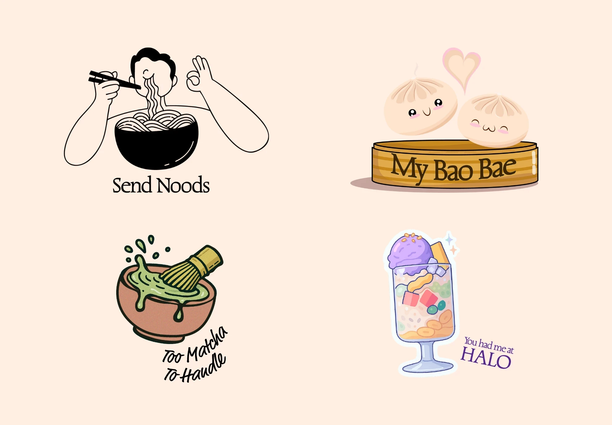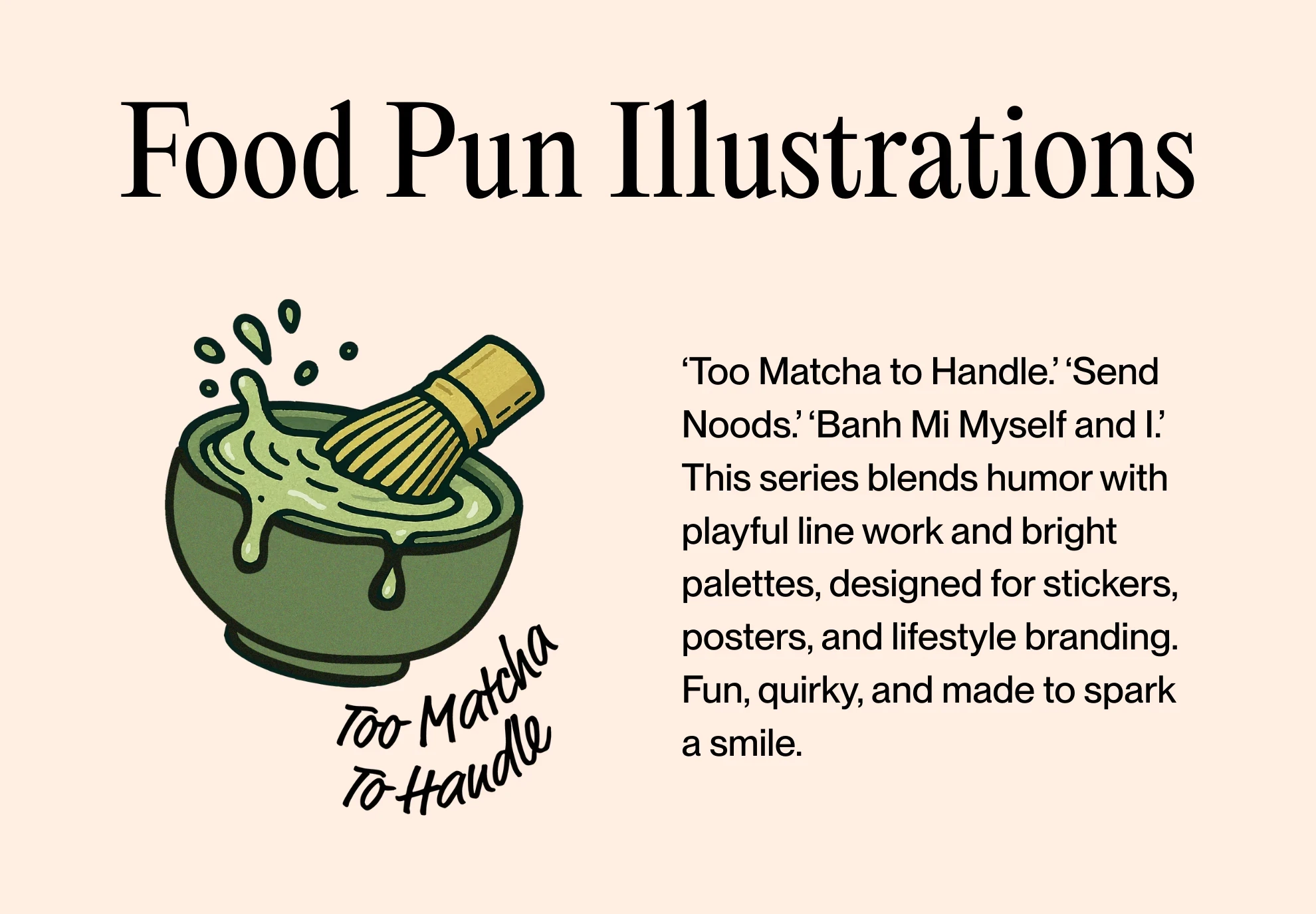 Food Pun Illustrations – witty concepts like ‘Send Noods,’ ‘Too Matcha to Handle,’ and ‘Banh Mi Myself and I,’ designed for playful branding, social media, and product design.