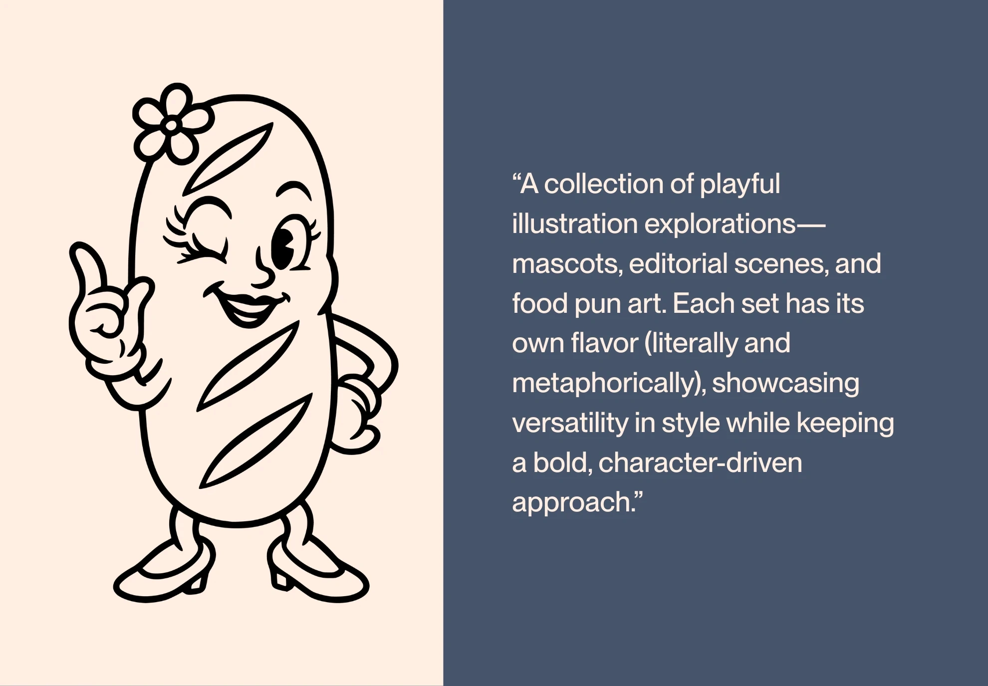 A versatile illustration portfolio showcasing character design, mascot creation, and editorial-style storytelling. This collection includes three series: