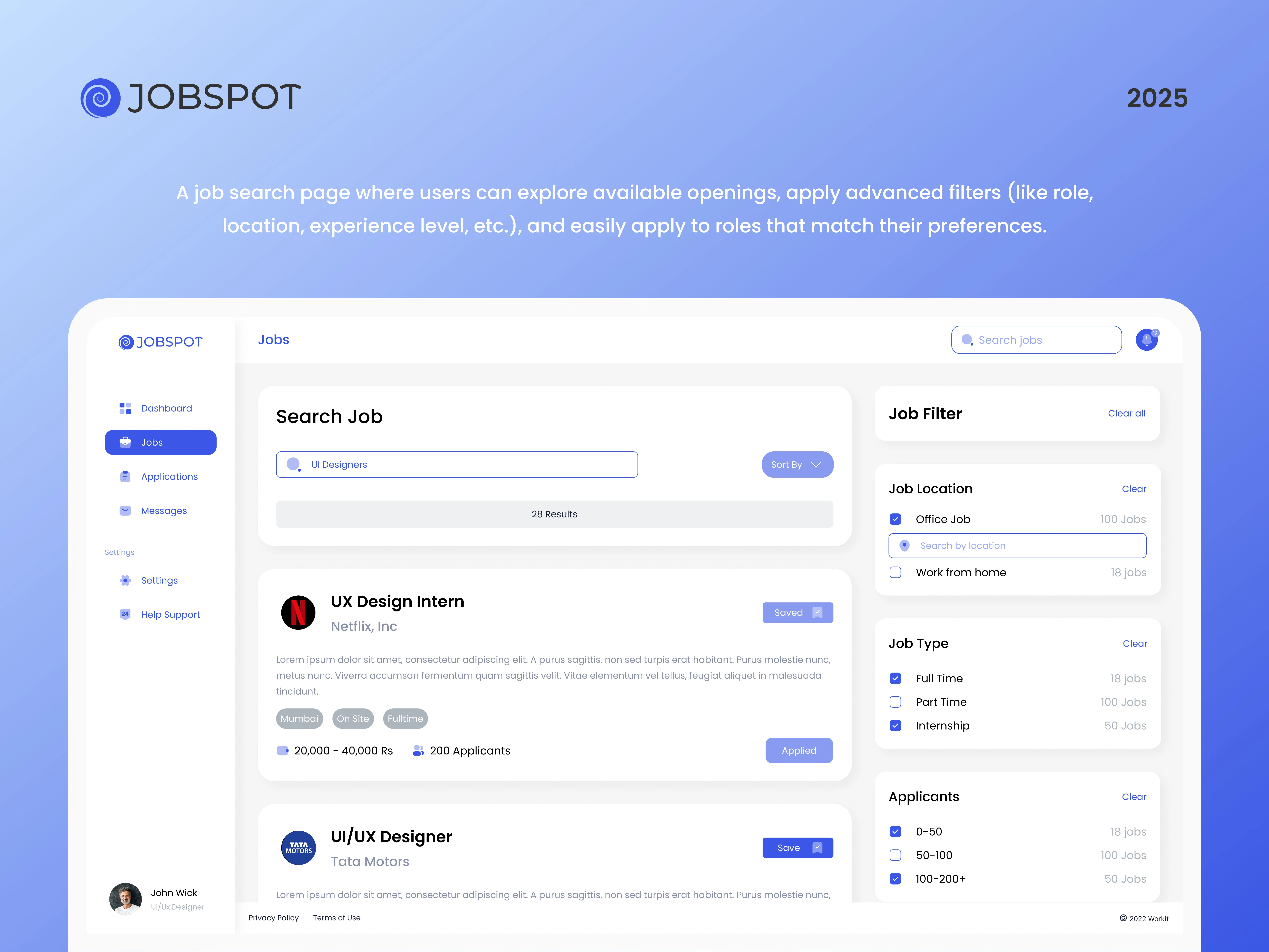 Excited to share a glimpse of my latest UI design for a Job Search & Application Platform! From a personalized dashboard to advanced job filtering, I’ve focused on creating a clean, intuitive experience that helps users land their next opportunity with ease.