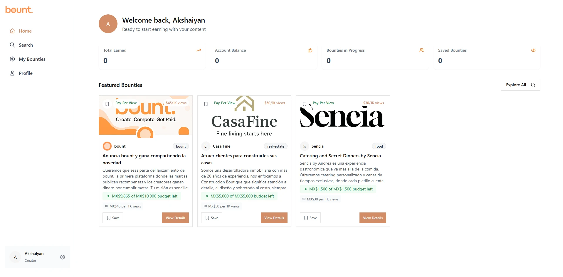 I am a lead developer of Bount, a social media bounty platform that connects businesses and content creators through performance-based paid campaigns. The app works as follows; businesses can post bounties and creators can seamlessly earn by submitting content and hitting engagement goals.