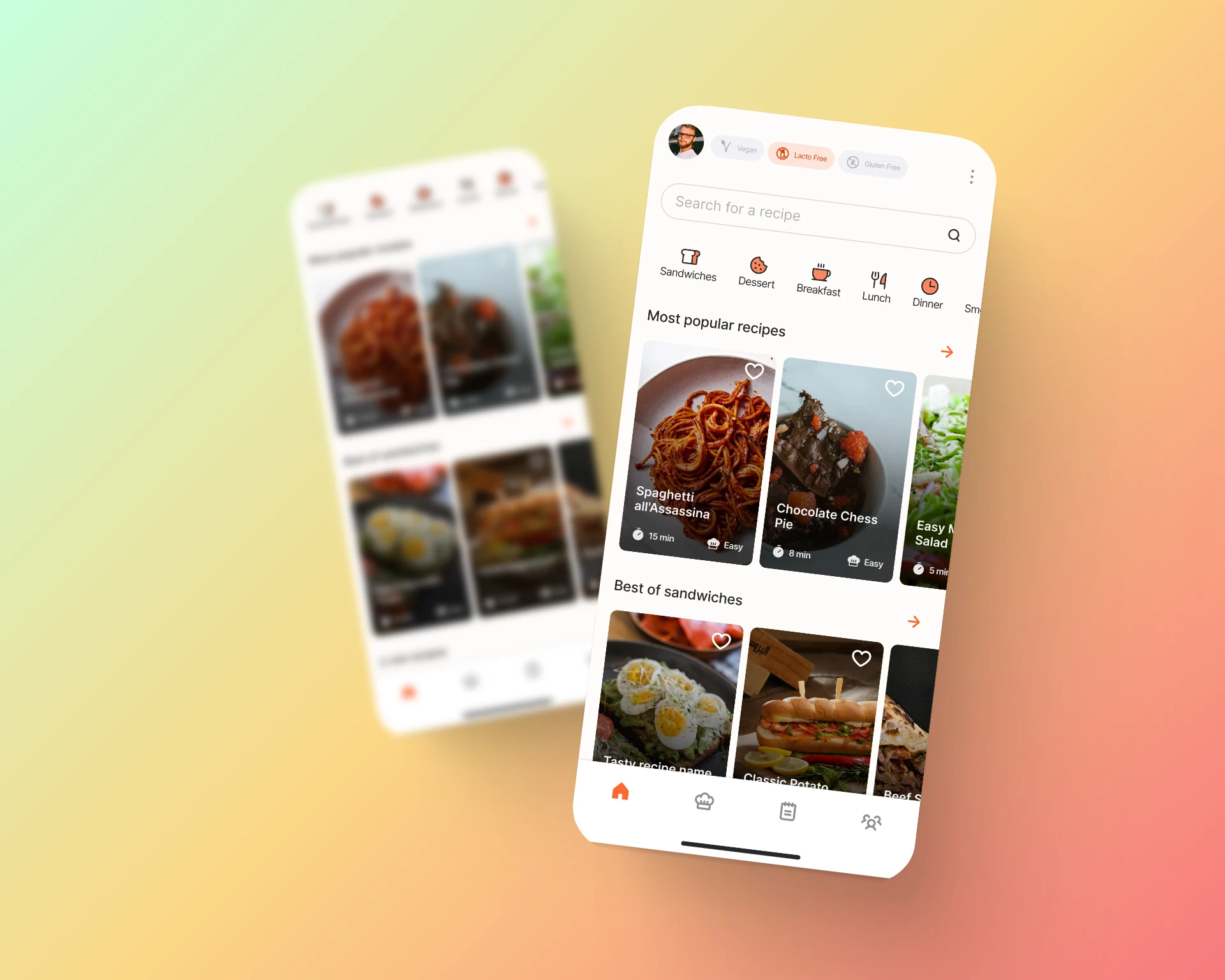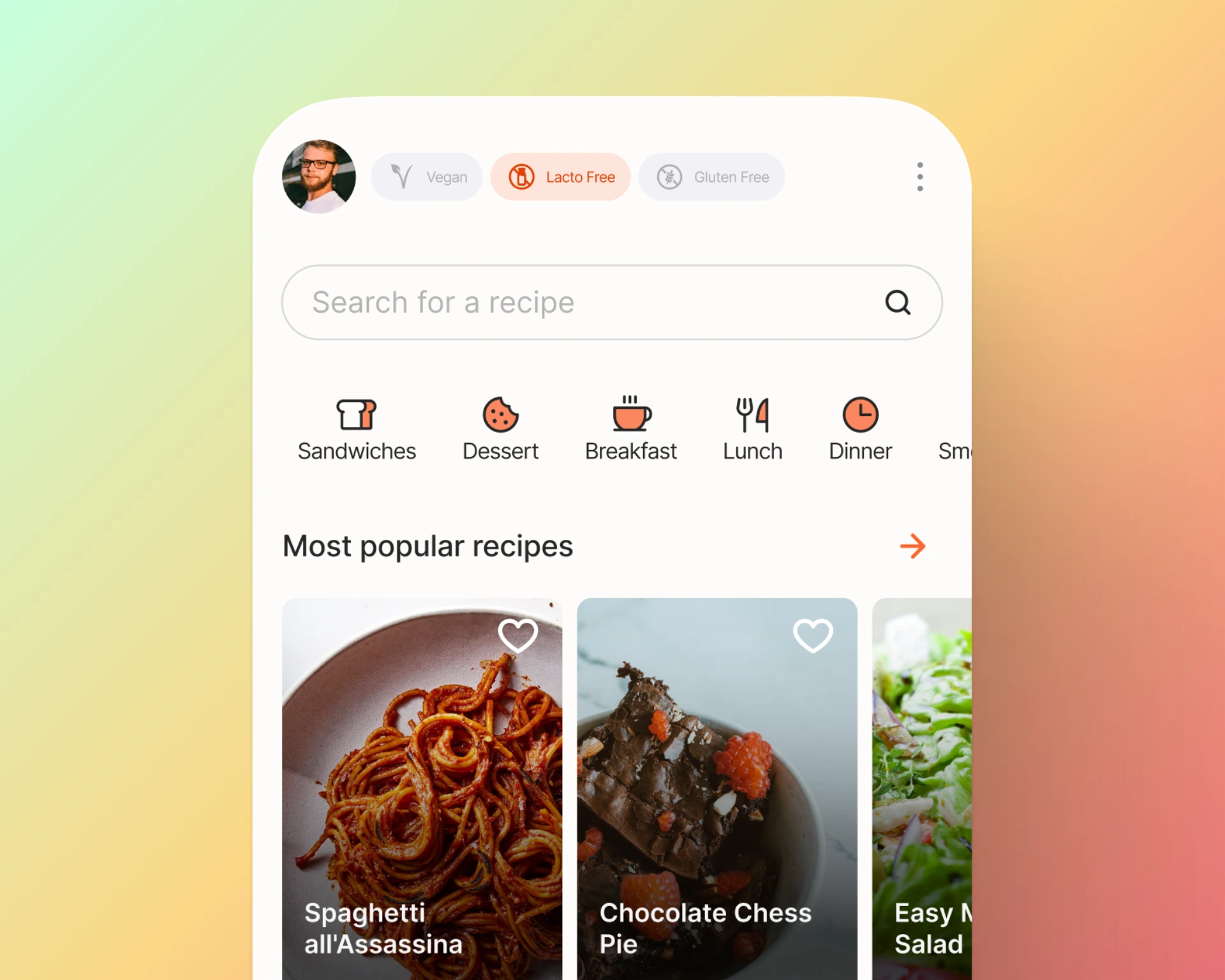User interface design for a recipe discovery app. Search for meals, filter by dietary needs (vegan, gluten-free).