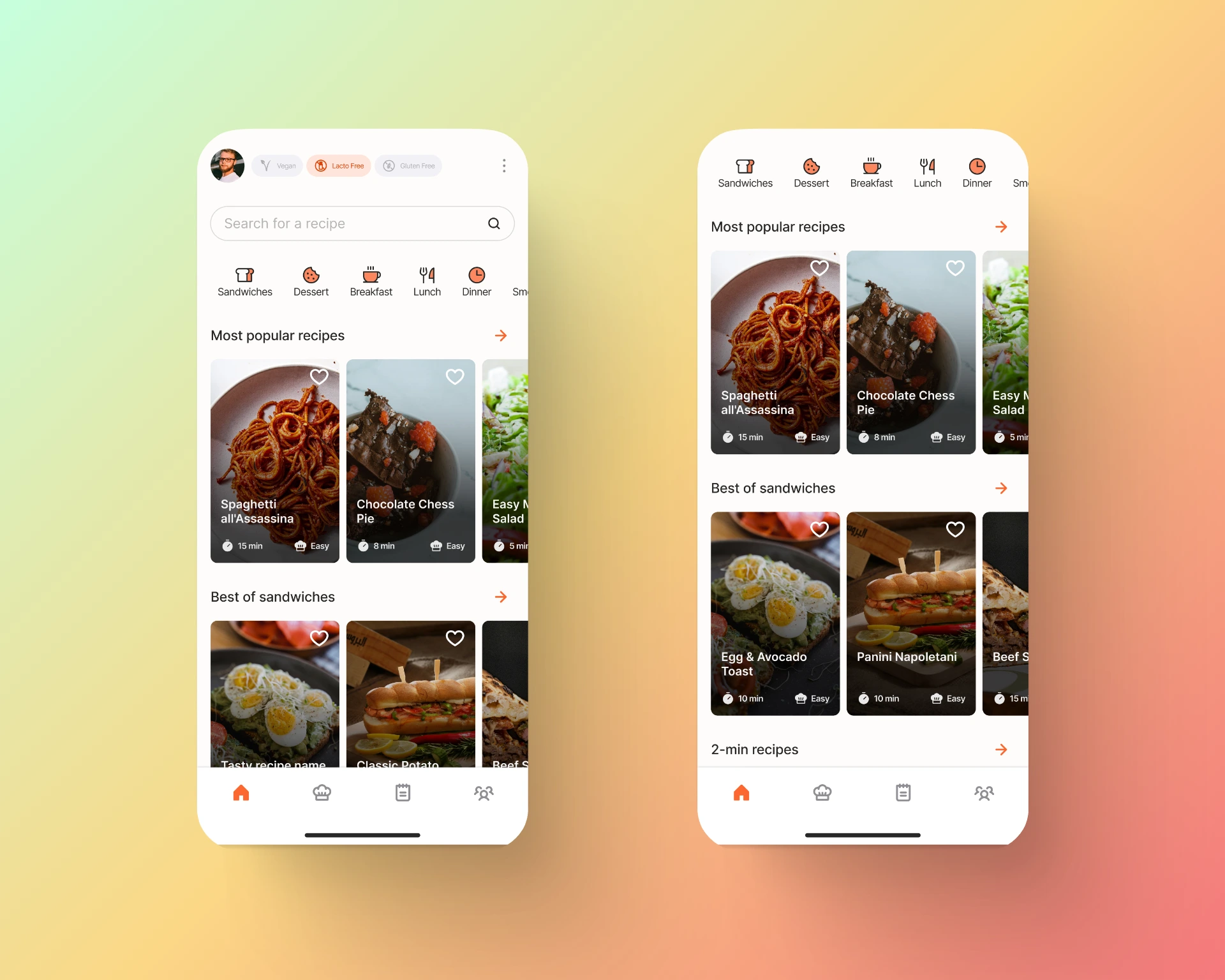 UI design for a recipe discovery app. Focused on dairy restrictions as a vegan, gluten-free, lactose-free diet to search, post, and review recipes.