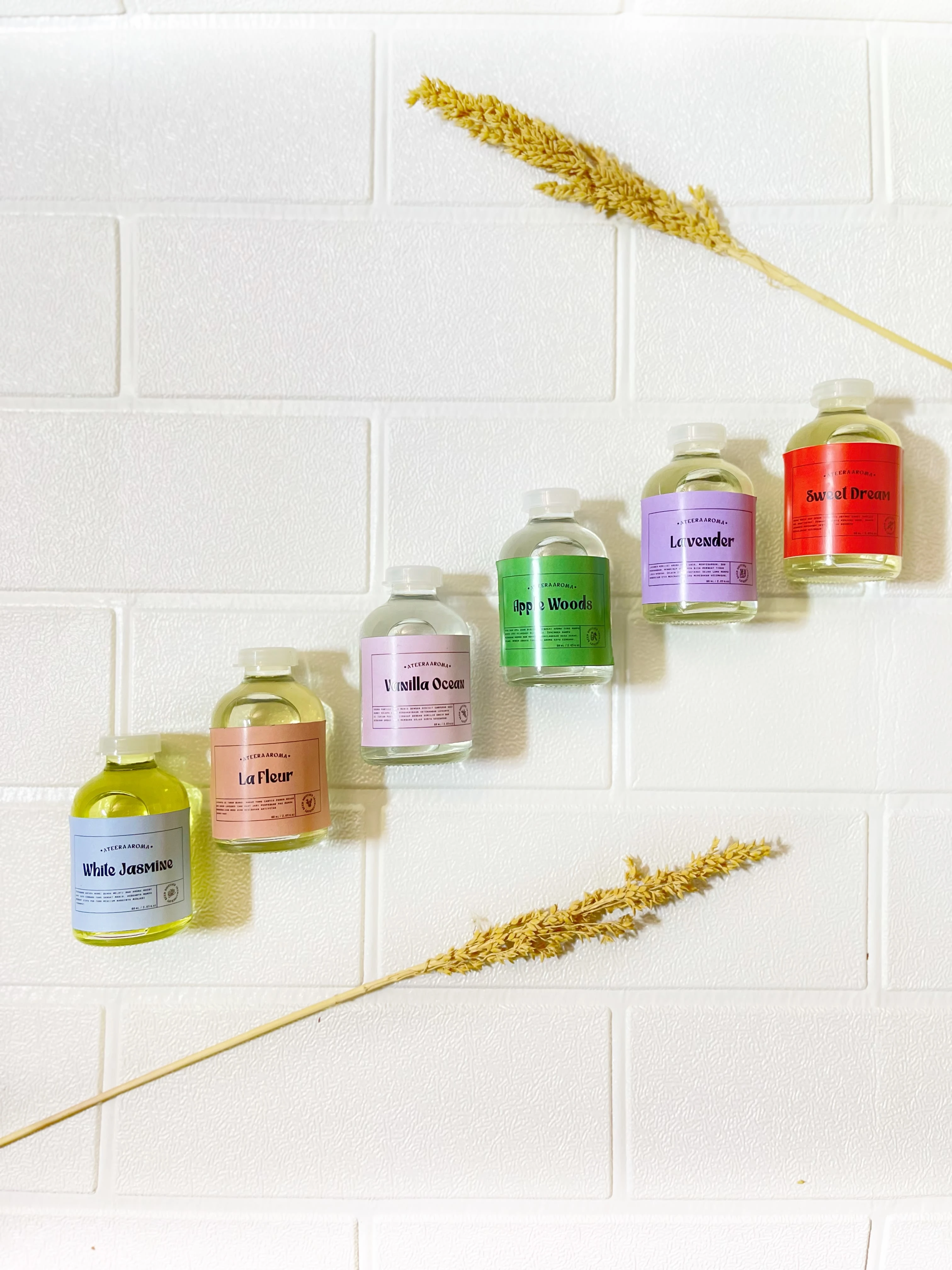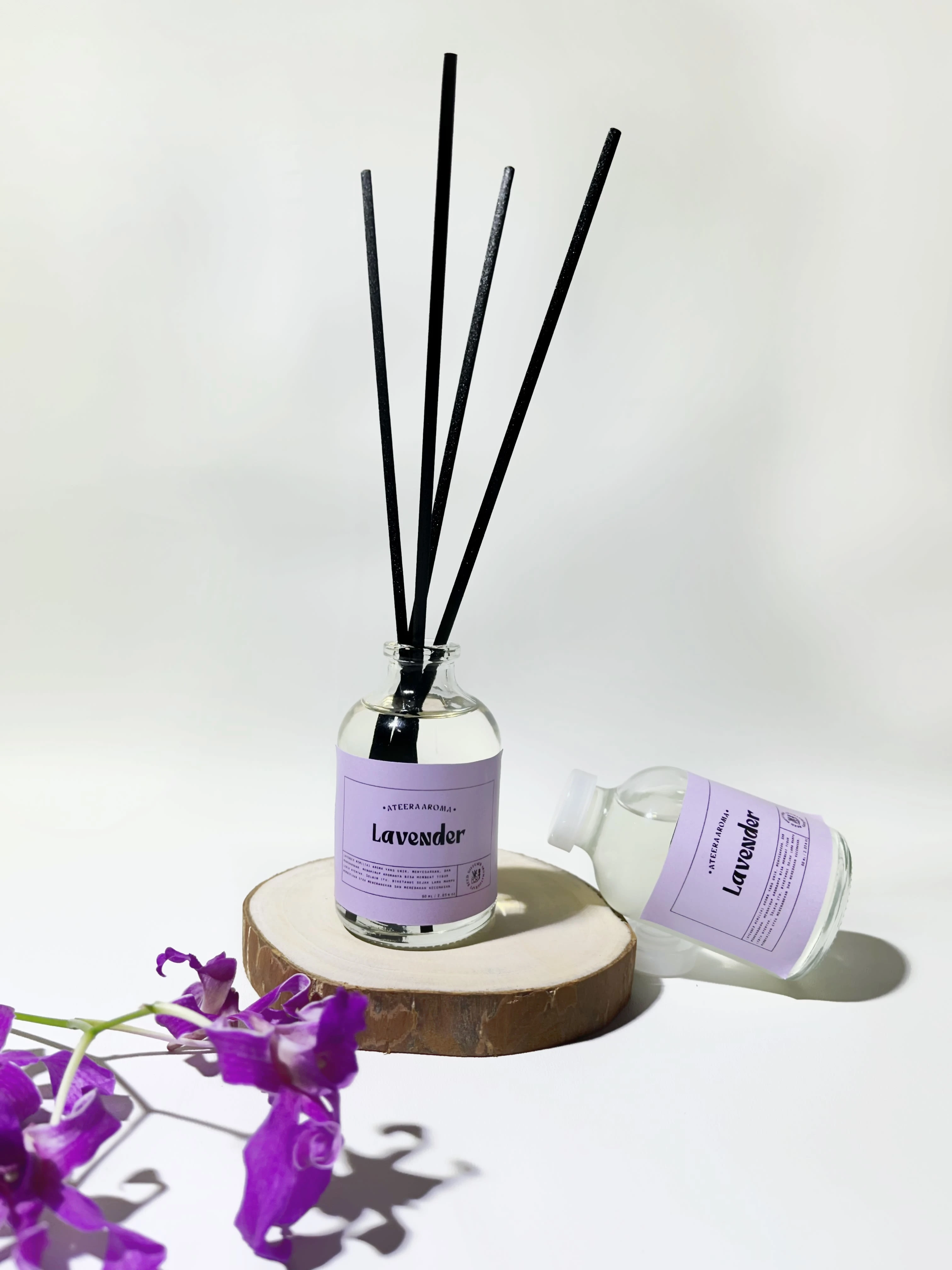 reed diffuser is aromateraphy for some room. in this photo, detailing about the functional and the type of product