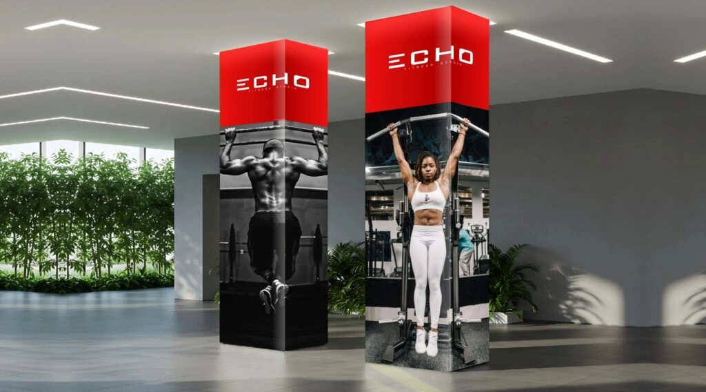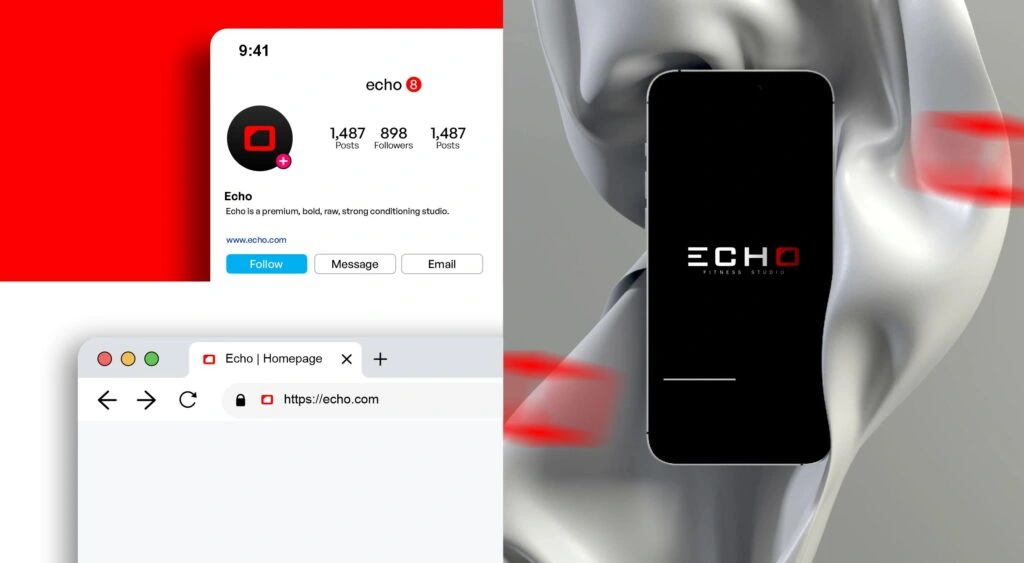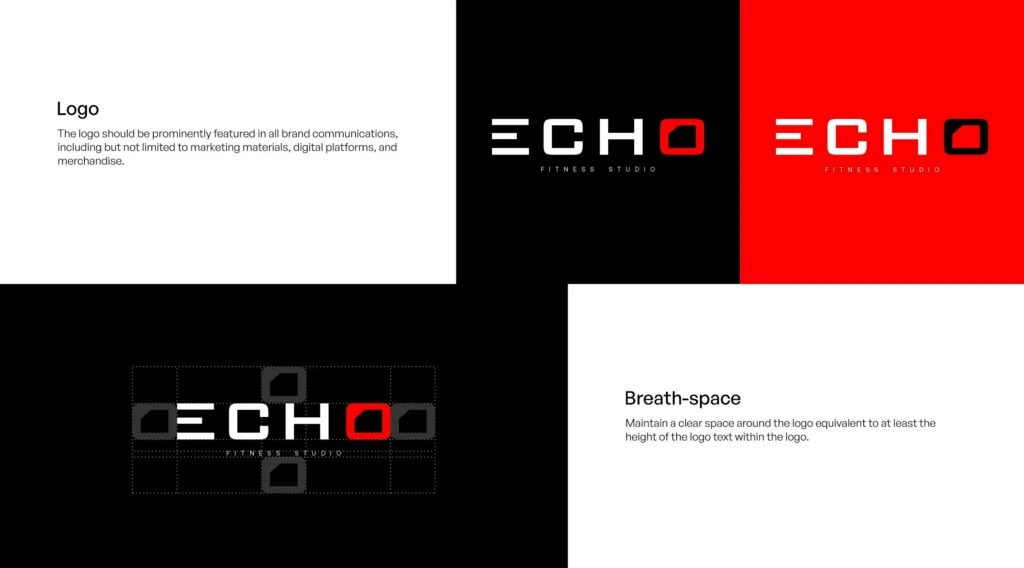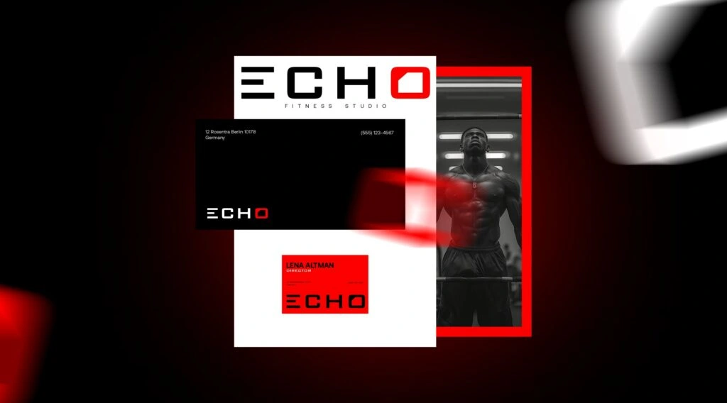 Visual identity design for Echo Fitness Studio, a modern fitness destination emphasizing discipline, style, and community.