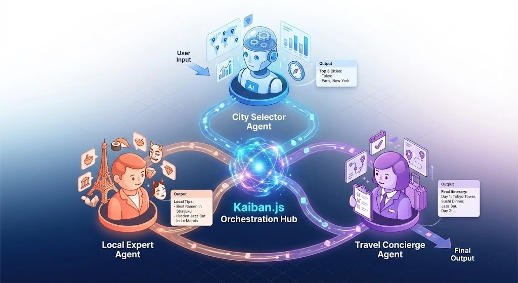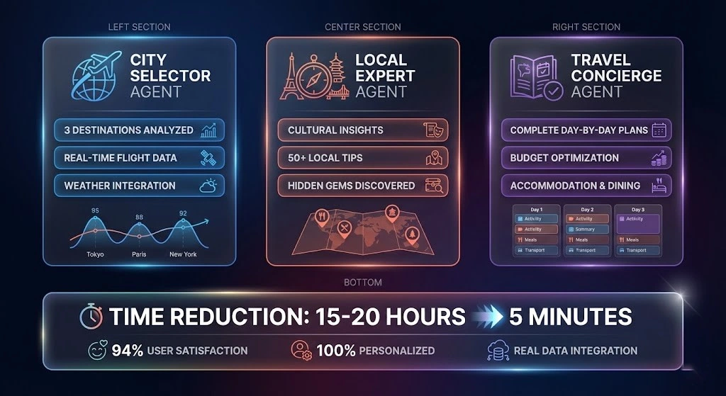As an AI Agent Developer, I architected and built a sophisticated multi-agent AI system that transforms travel planning from a tedious, hours-long research process into an intelligent, personalized experience delivered in minutes. This isn't a simple chatbot—it's a coordinated team of three specialized AI agents working together using Kaiban.js orchestration, each with distinct expertise, collaborating to create comprehensive, customized travel itineraries tailored to your preferences, budget, and schedule.