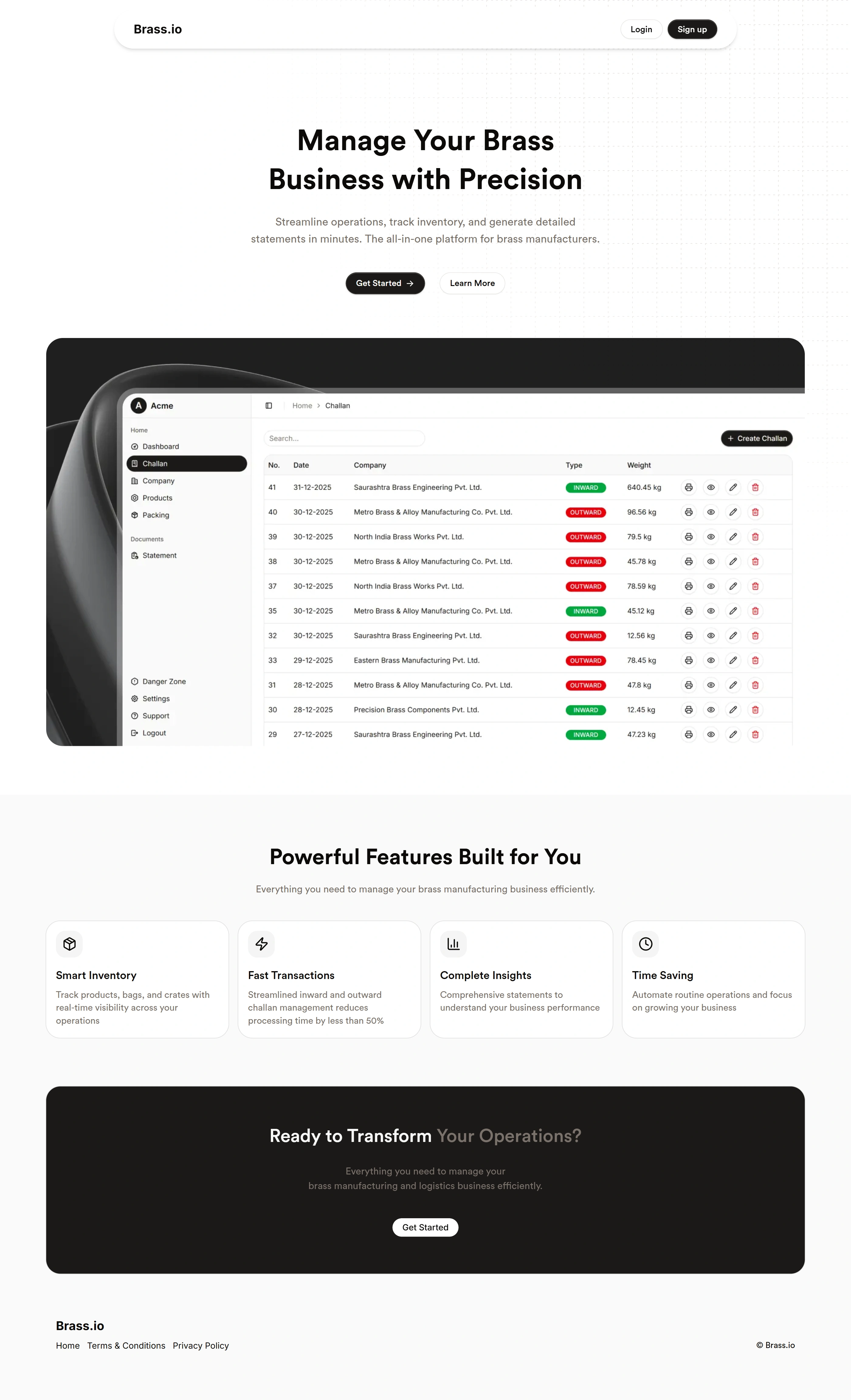 Streamline operations, track inventory, and generate detailed statements in minutes. The all-in-one platform for brass manufacturers.