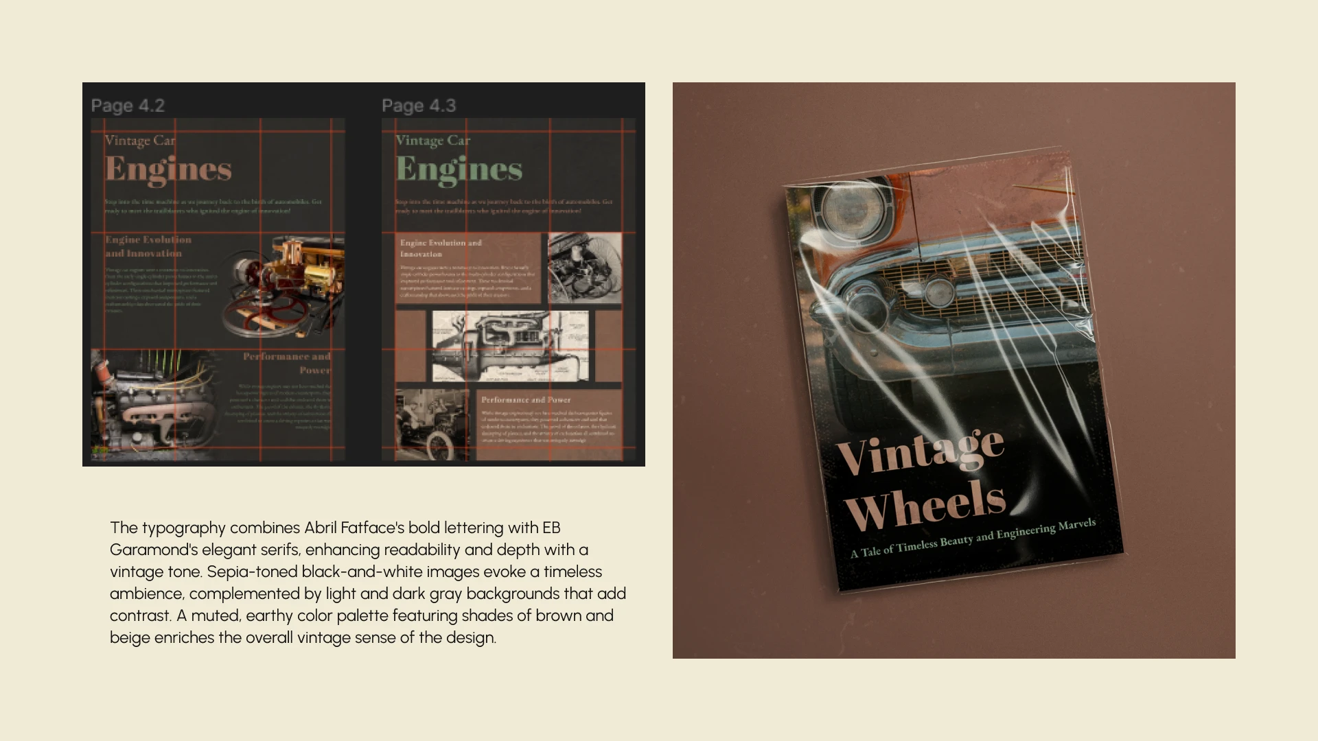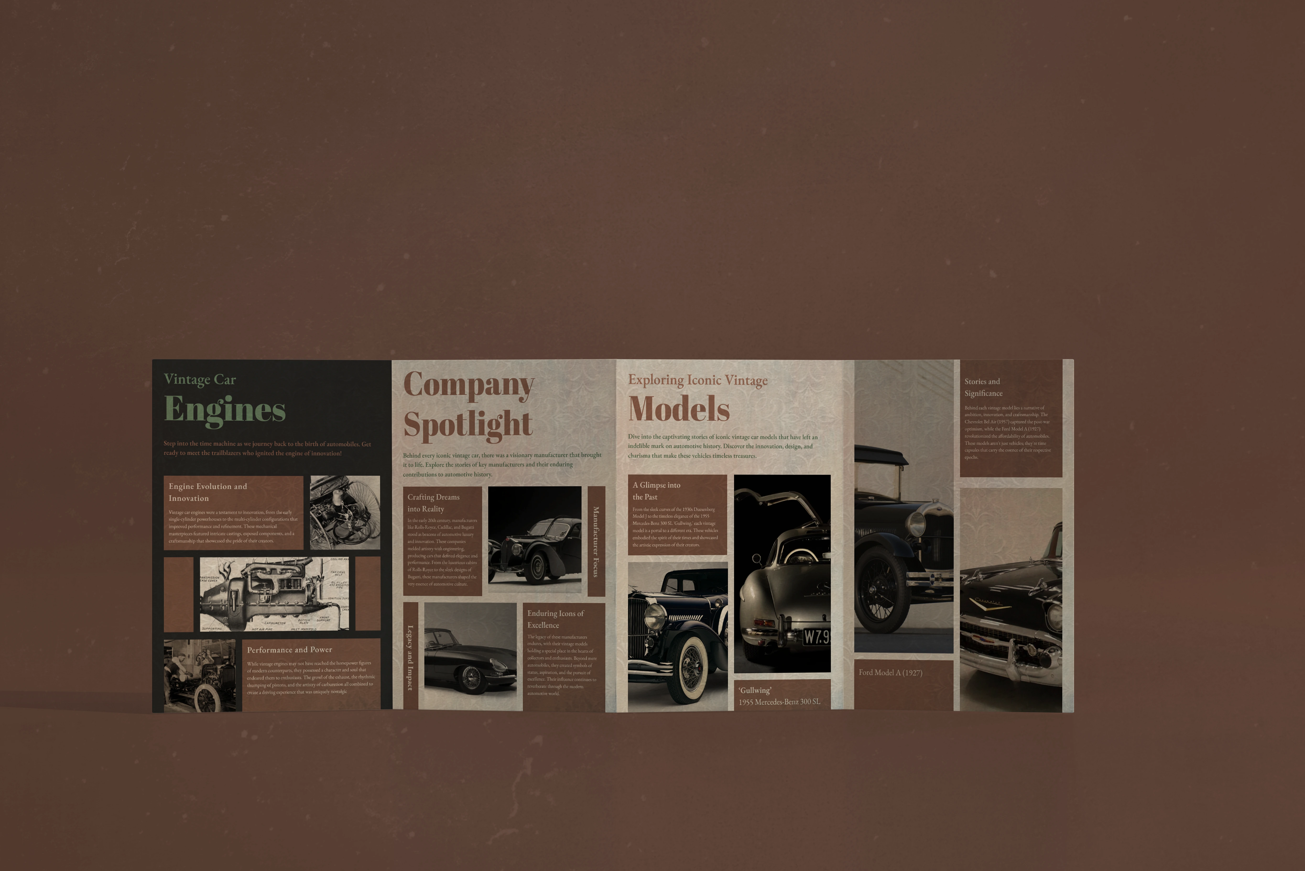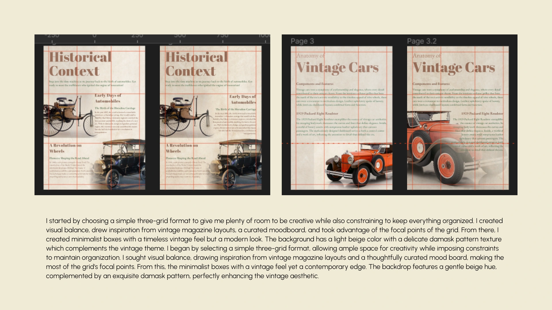 I designed a magazine spread exploring the evolution of vintage cars, using a structured three-column grid to focus on typography, hierarchy, and layout discipline.