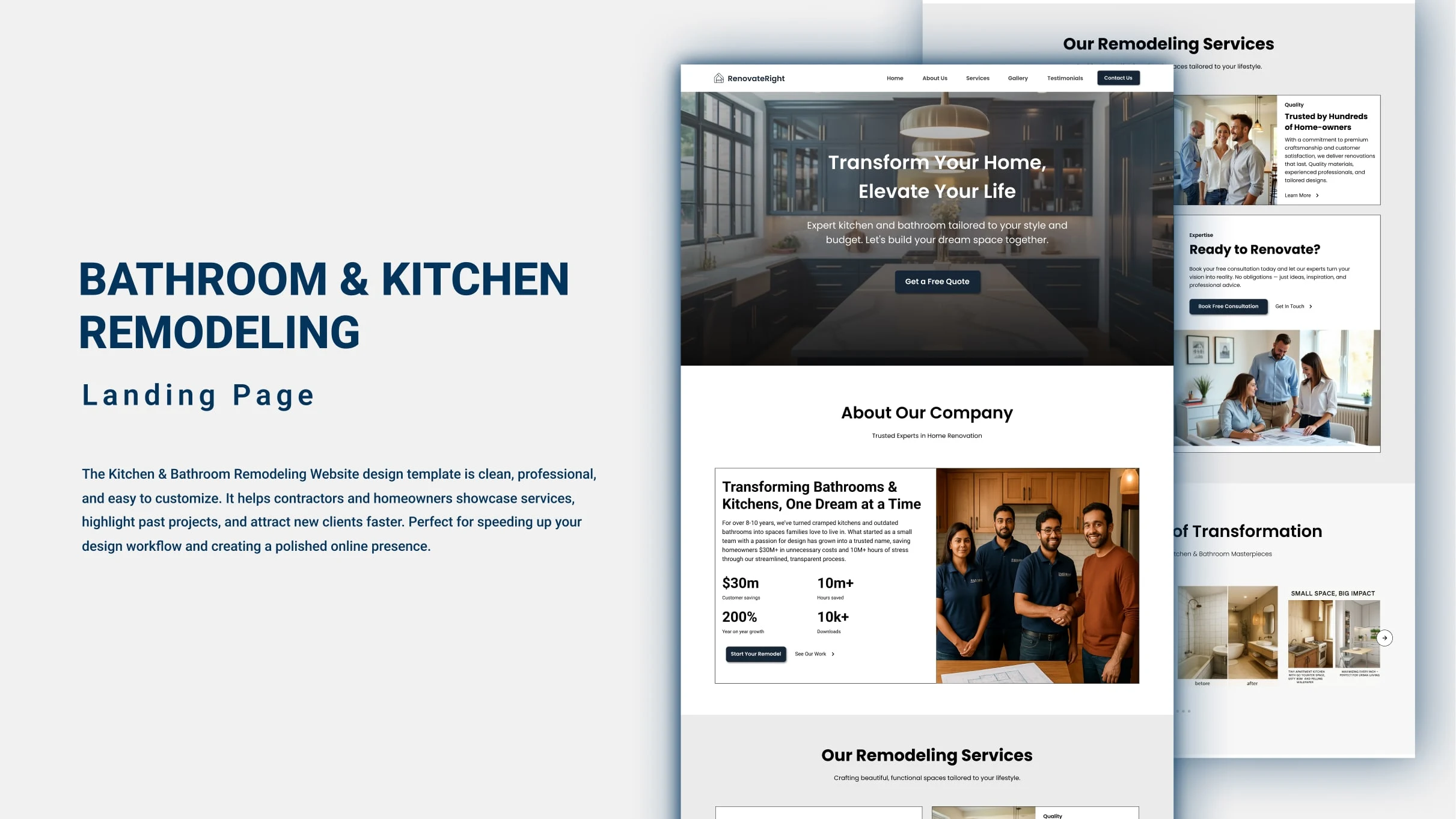 The landing page is designed for RenovateRight, a trusted home renovation brand specializing in kitchen and bathroom remodeling. The goal is to showcase the company’s expertise, highlight successful projects, and convert visitors into leads through consultation requests or quotes.