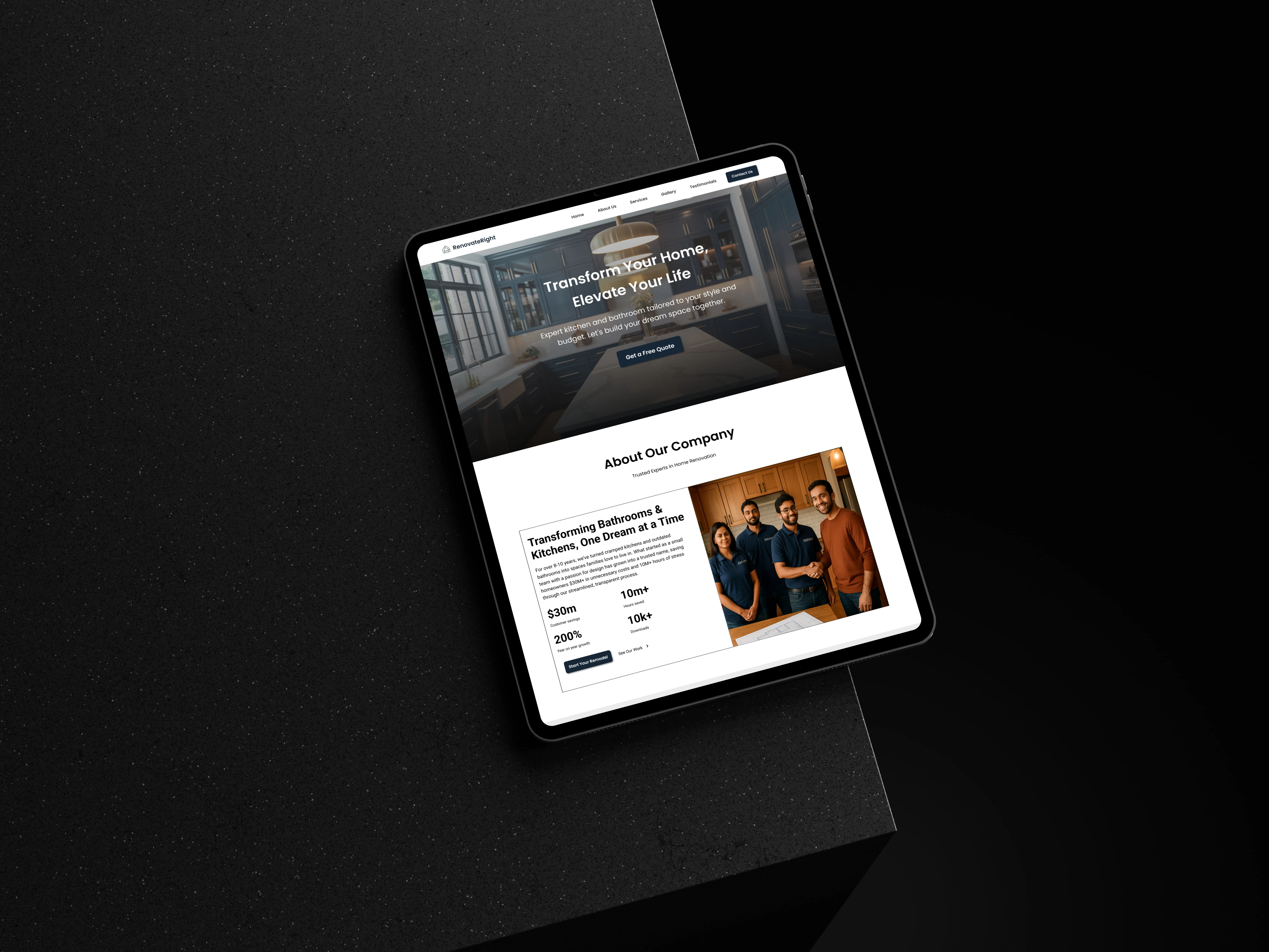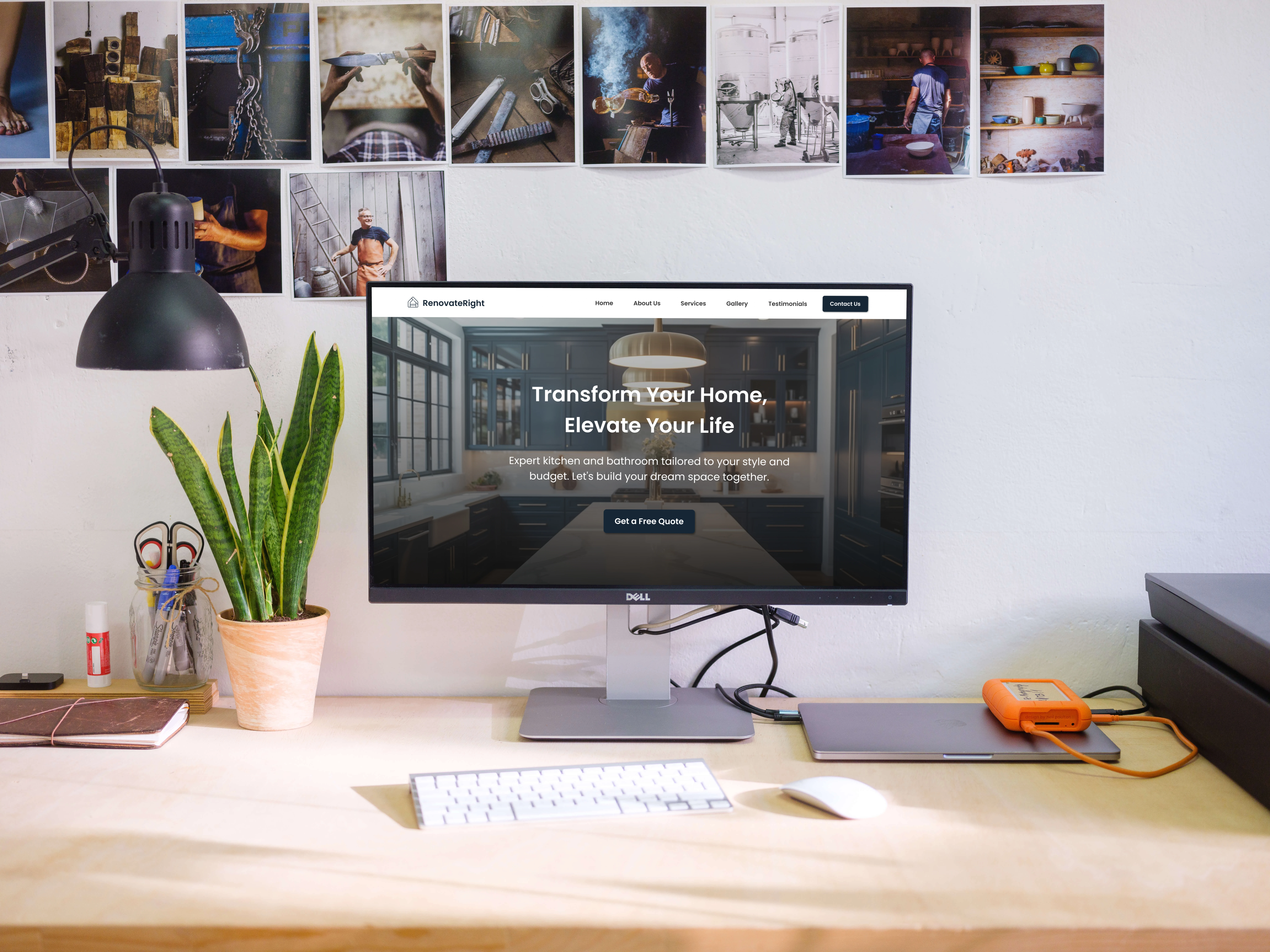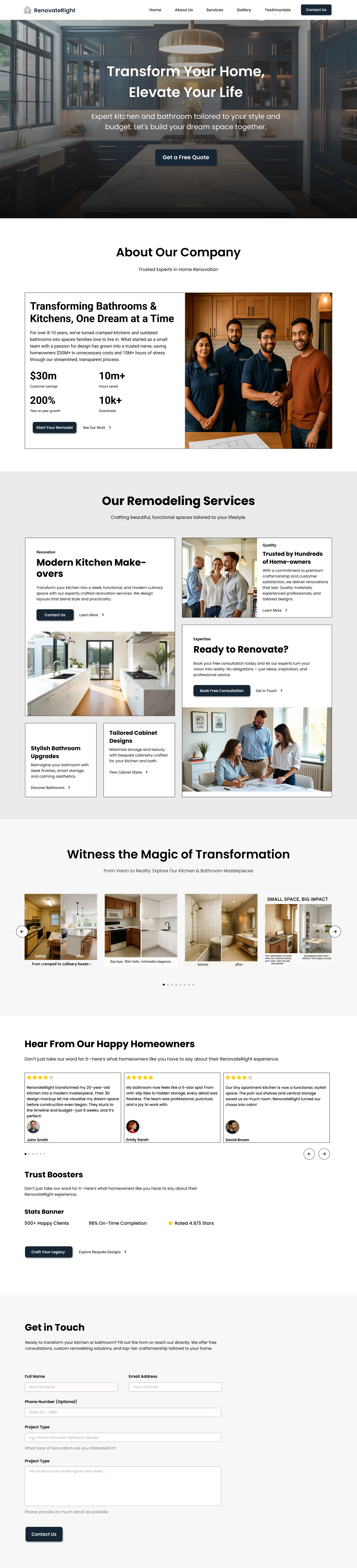 RenovateRight focuses on transforming kitchens and bathrooms into functional, stylish, and customized spaces, blending aesthetics with practicality to meet each client’s unique style, needs, and budget. The landing page communicates this by combining high-quality visuals, clear messaging, and a professional layout.