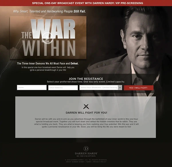 Designed and built a fully branded funnel for Darren Hardy’s War Within video series, centered around high-conversion storytelling and email capture.