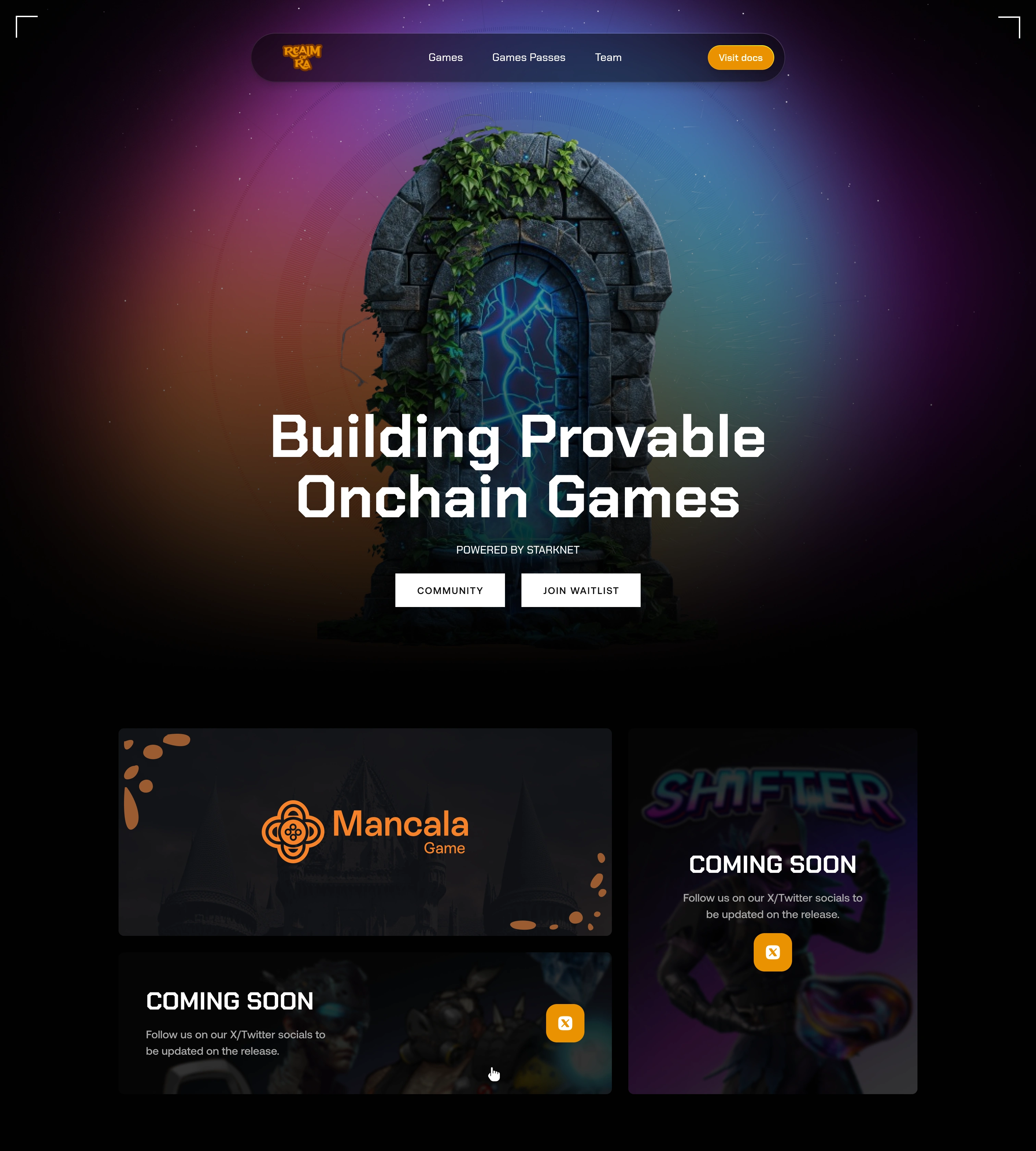 The hero section leads with "Building Provable Onchain Games" because that's exactly what sets them apart. Below that, clean CTAs for Community and Join Waitlist - because in gaming, community is everything.