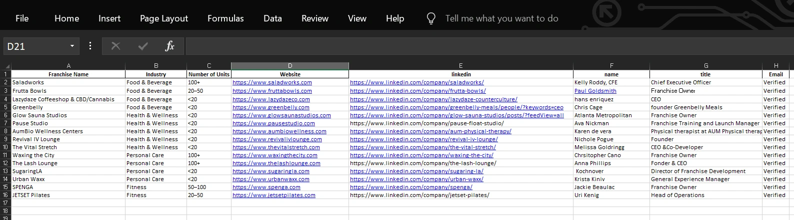 Identify and verify franchise growth decision-makers from US/Canada-based F&B, wellness, personal care & fitness brands with under 1500 locations.