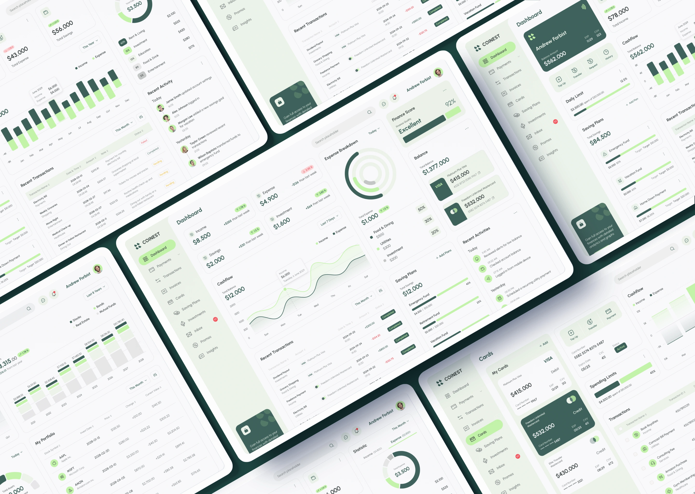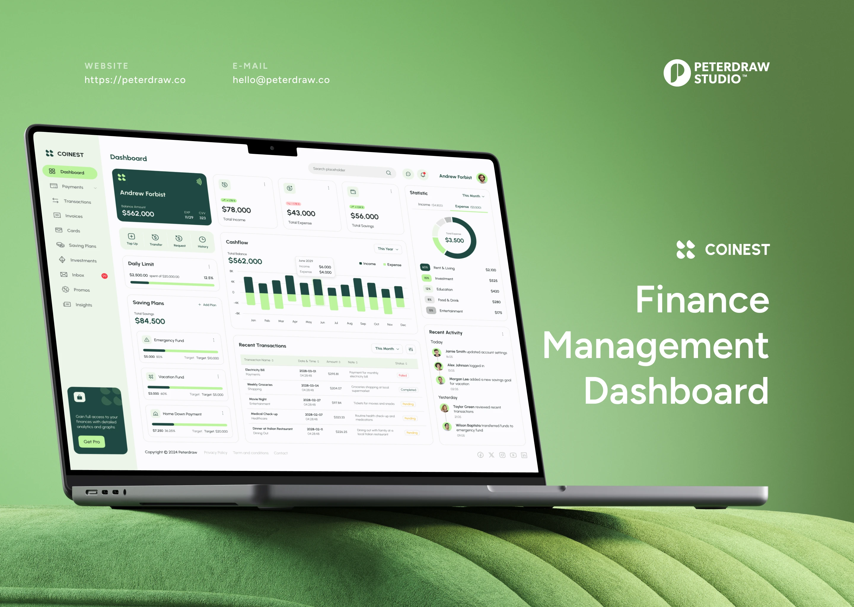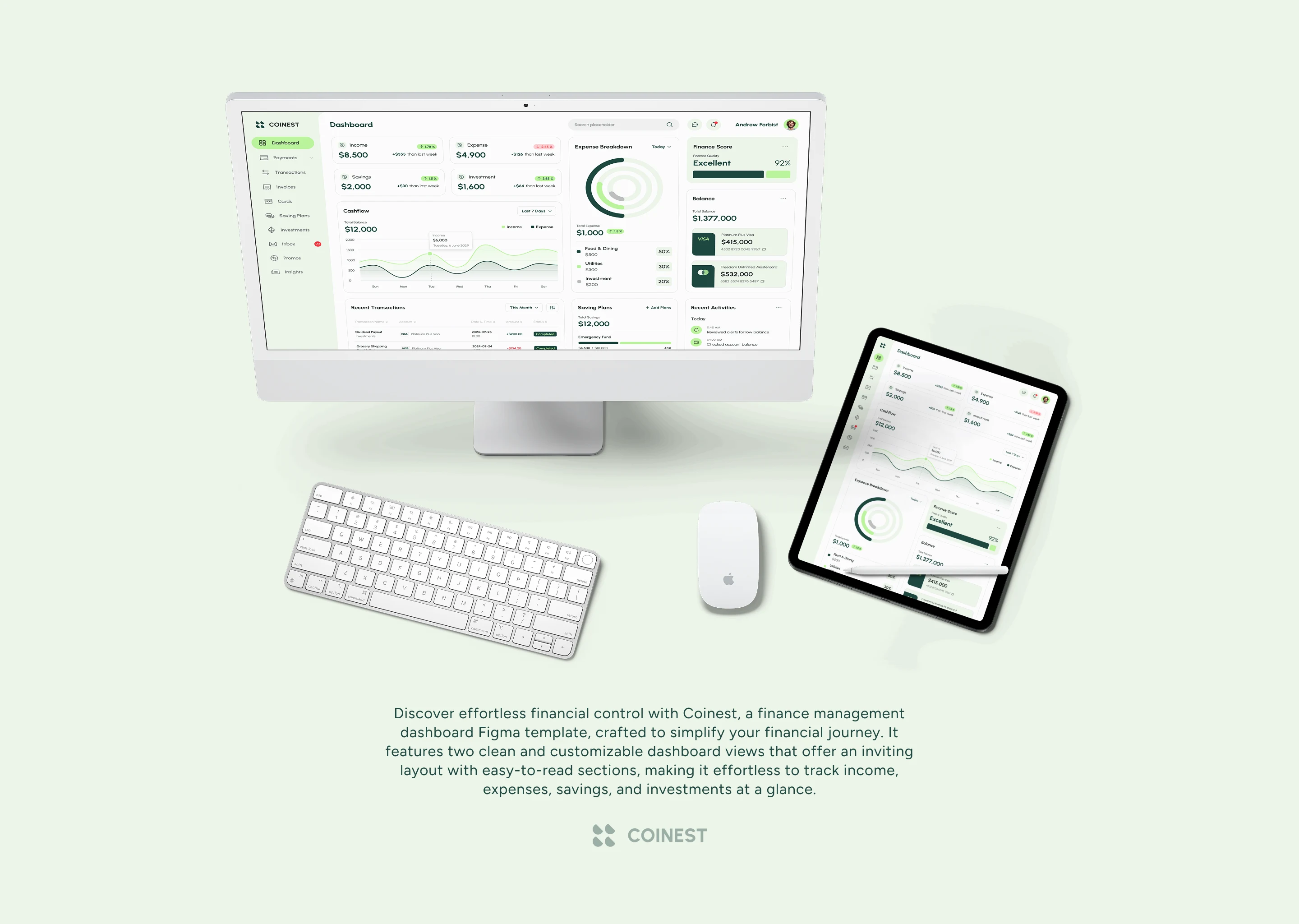 Discover effortless financial control with Coinest, a finance management dashboard Figma template, crafted to simplify your financial journey. It features two clean and customizable dashboard views that offer an inviting layout with easy-to-read sections, making it effortless to track income, expenses, savings, and investments at a glance.