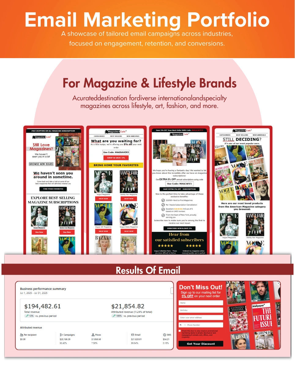 For a premium magazine store, boosted email revenue by optimizing segmentation & deliverability. Results: improved inbox placement, engagement, and revenue.
