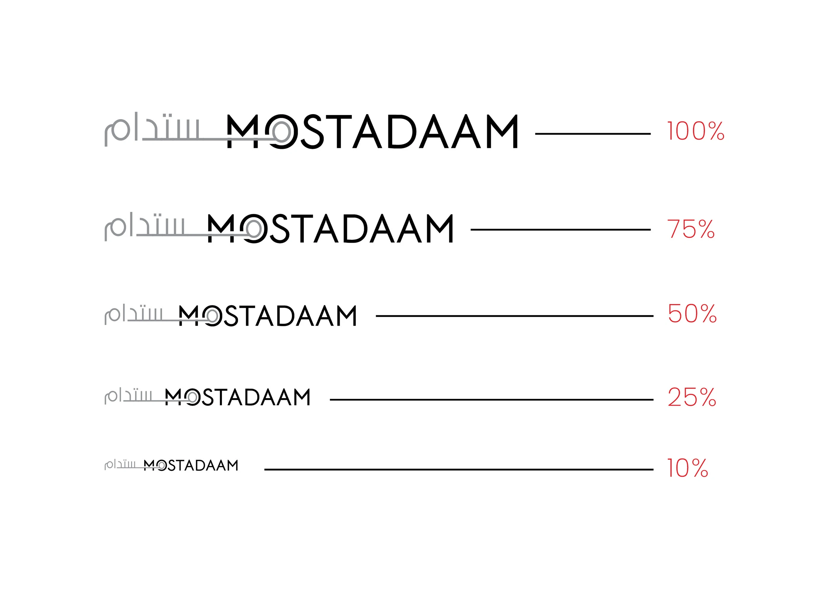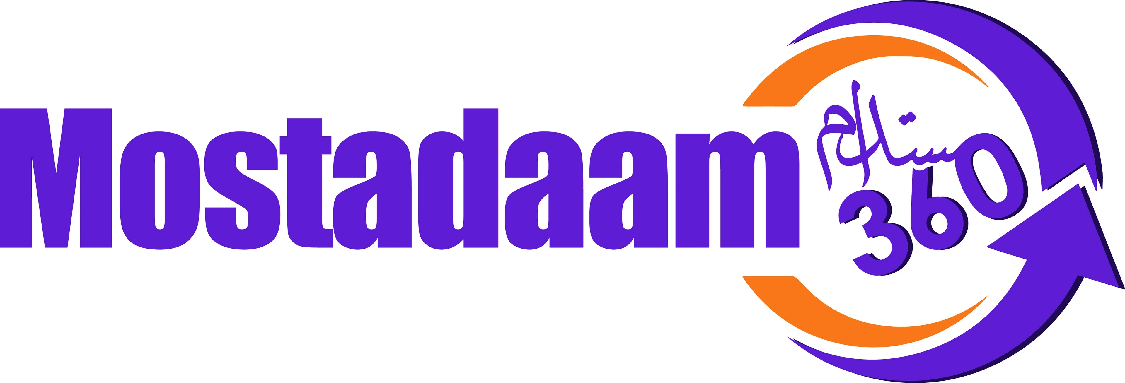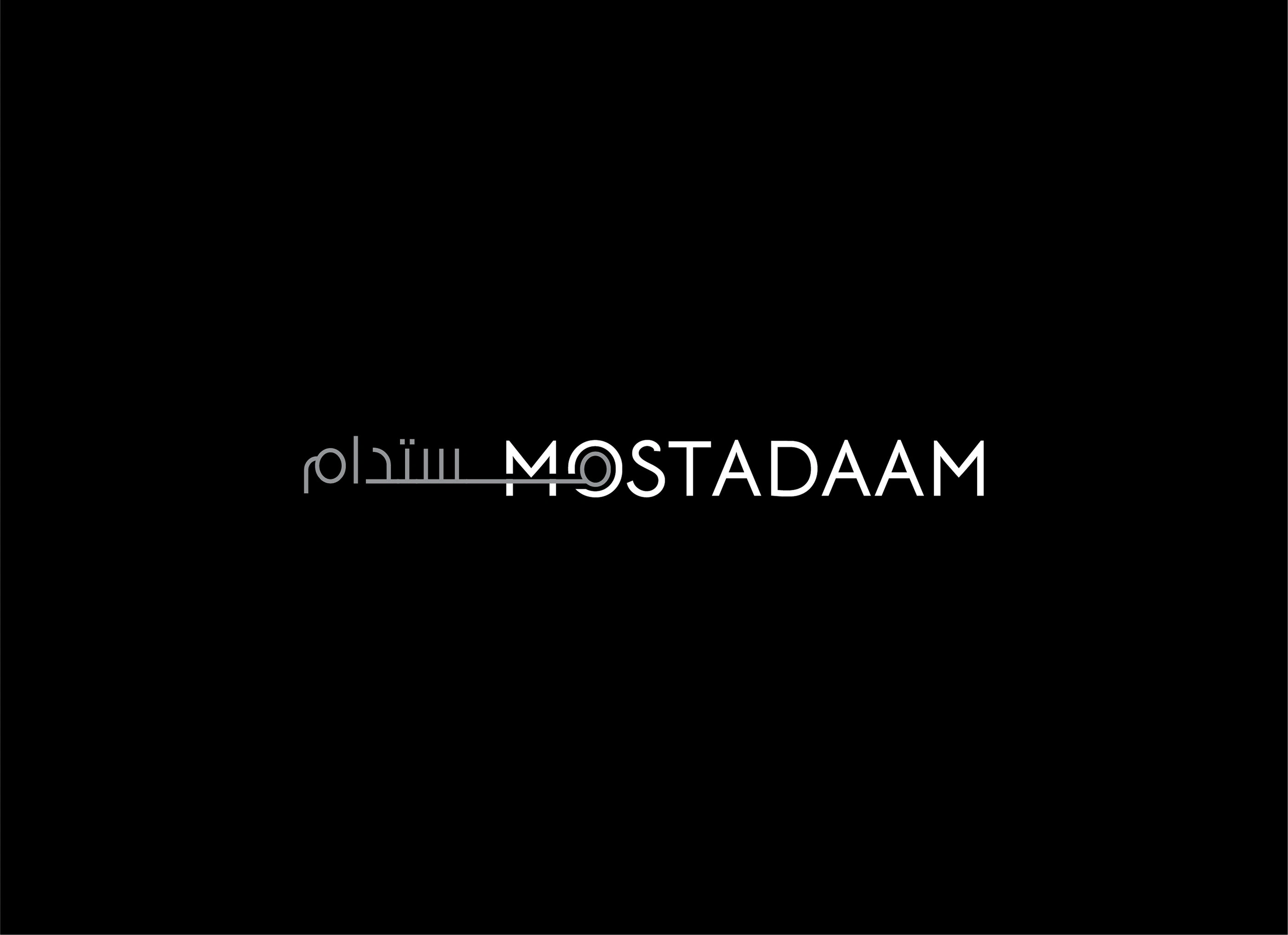 The English version features a clean, modern typeface for "Mostadaam," with a striking line bisecting the word. This line adds a dynamic element, suggesting movement and progress, while also subtly hinting at the concept of connection and bringing people together within the marketplace.