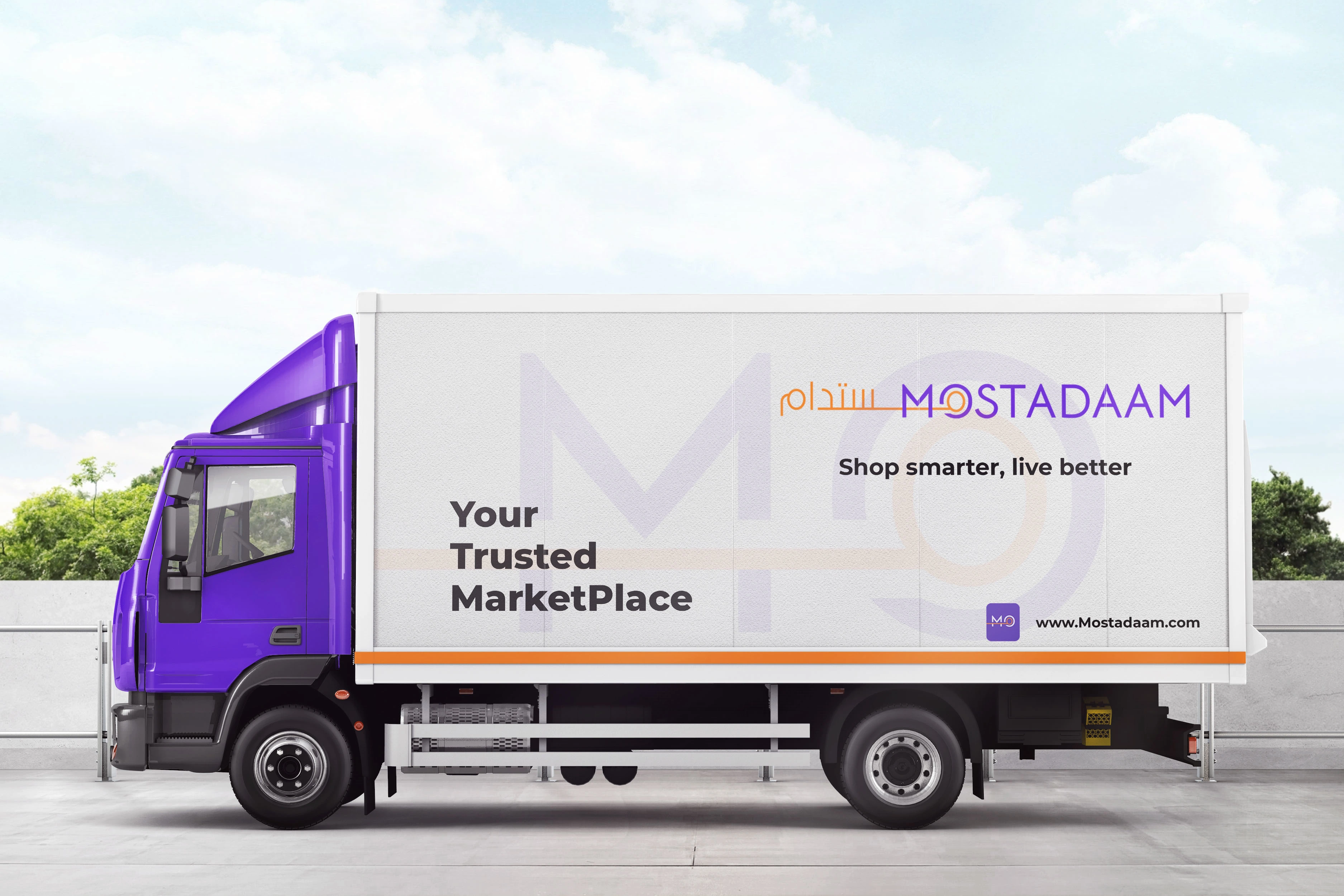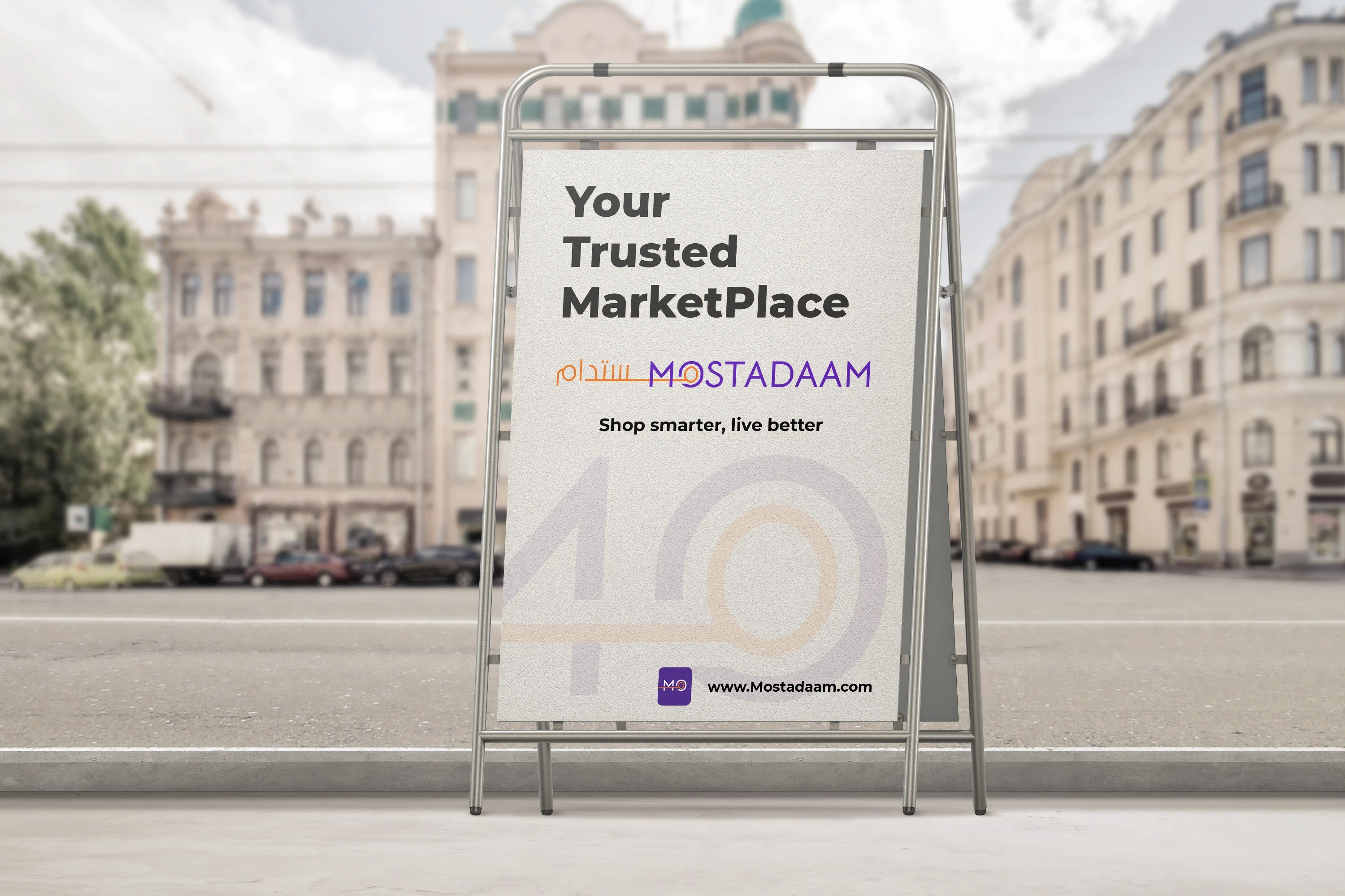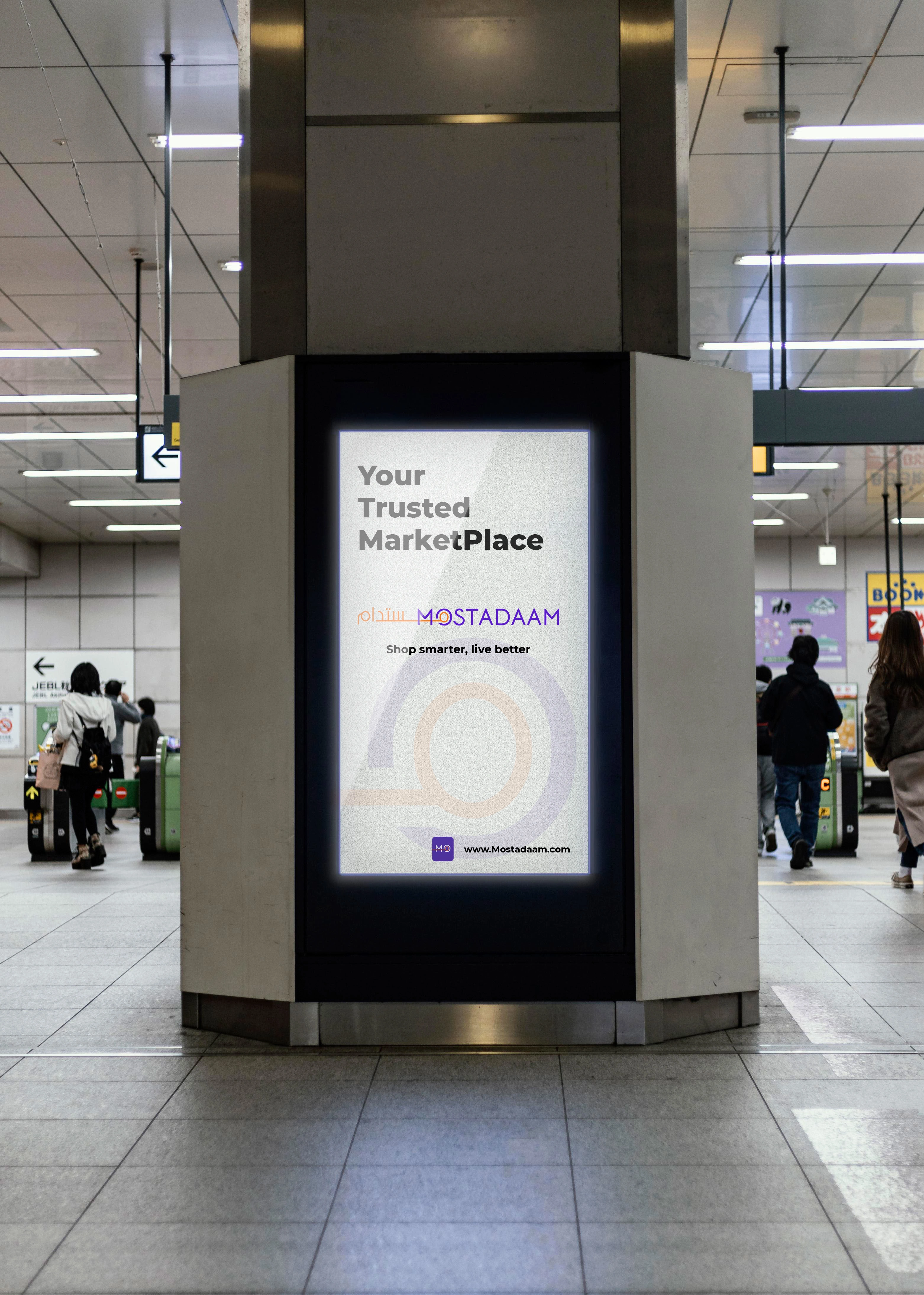 The English version features a clean, modern typeface for "Mostadaam," with a striking line bisecting the word. This line adds a dynamic element, suggesting movement and progress, while also subtly hinting at the concept of connection and bringing people together within the marketplace.