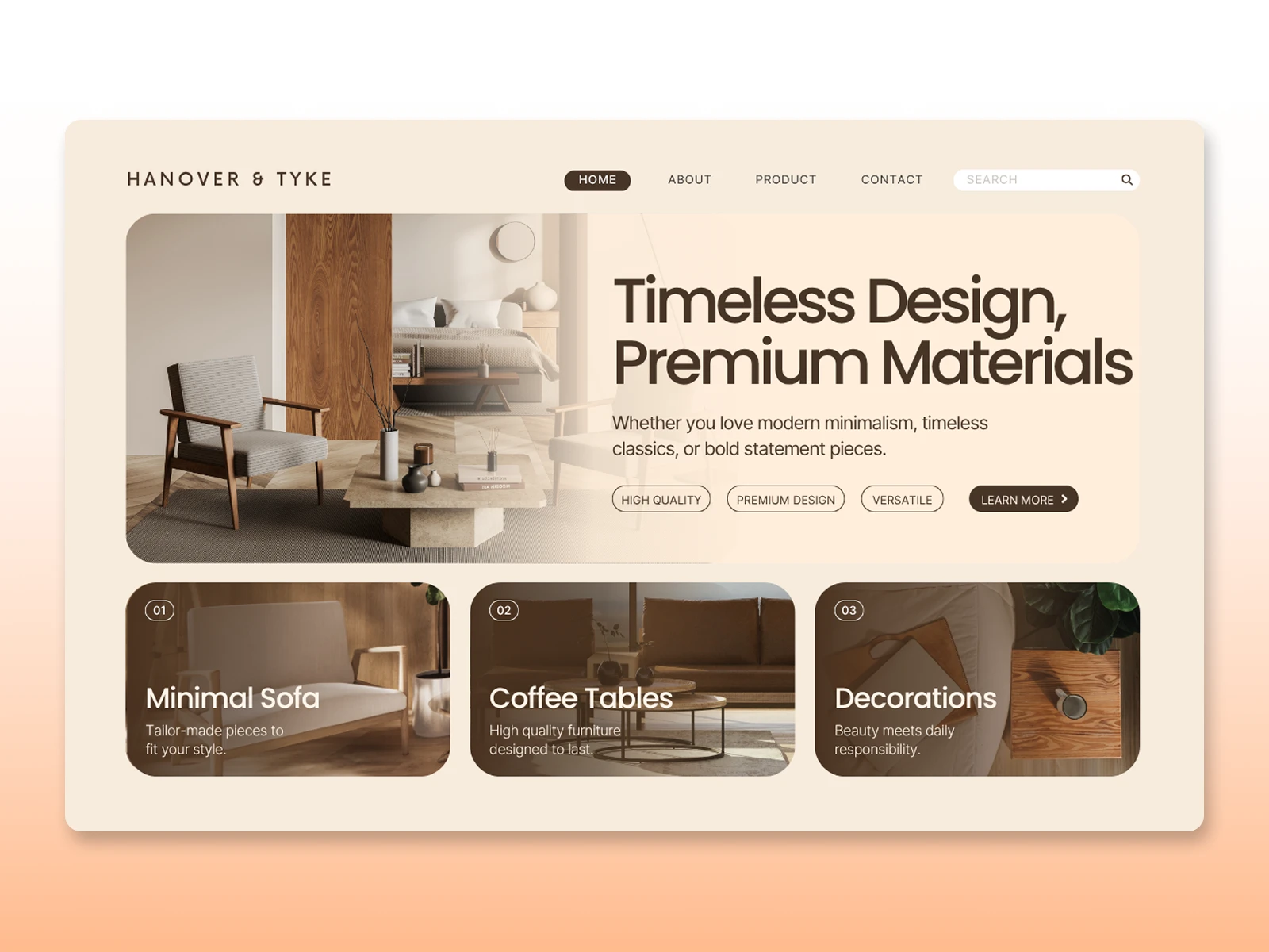 Hanover & Tyke aimed to position itself as a premium furniture brand that balances timeless design with modern appeal. The goal for the landing page was to create a warm, inviting, and sophisticated user experience that quickly communicates their commitment to quality materials and versatile styling.