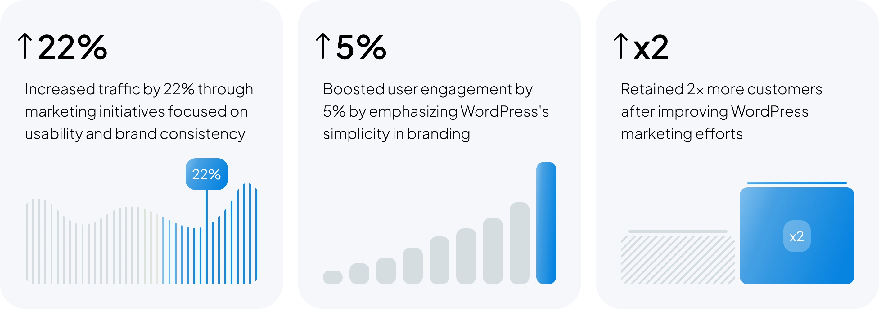 Enhanced WordPress branding and marketing, boosting traffic by 22% and engagement by 5%.