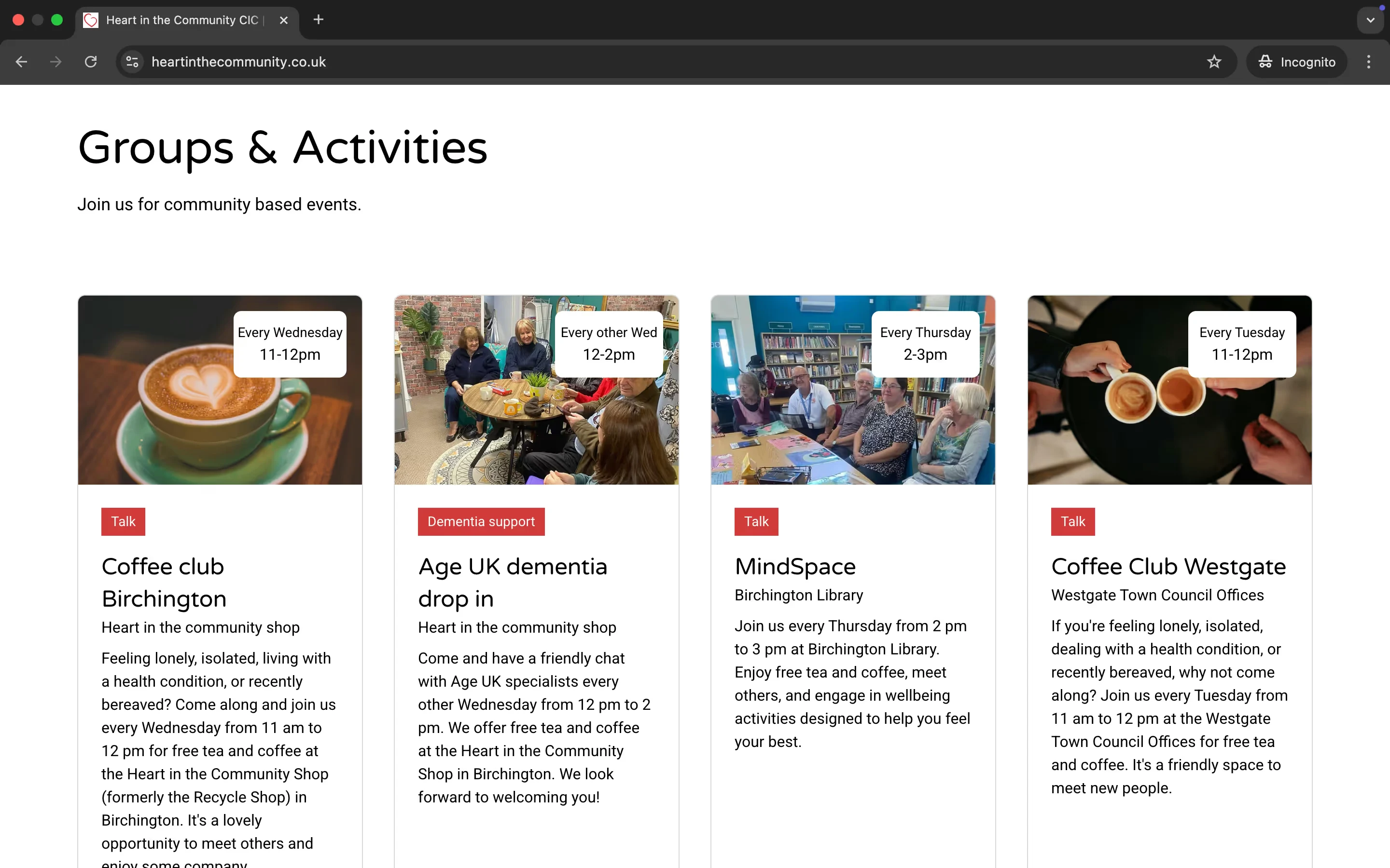 Heart in the Community came to me with a clear but simple need: they wanted a place to share information about their charity, highlight the many community services they offer, and give people an easy way to get in touch. Until this point, they’d only been active on Facebook — which meant a lot of people, especially those without social media, couldn’t access their support.