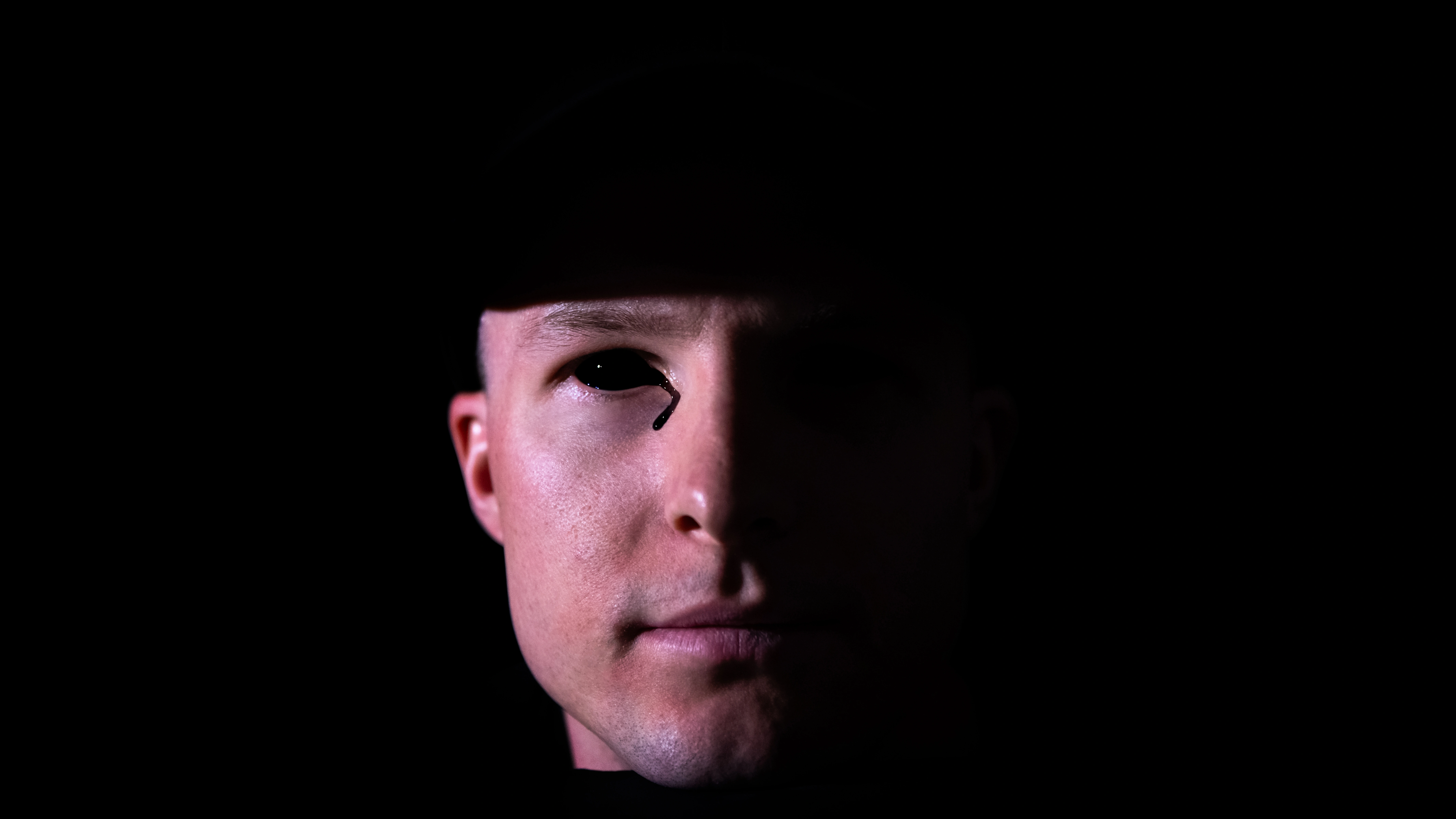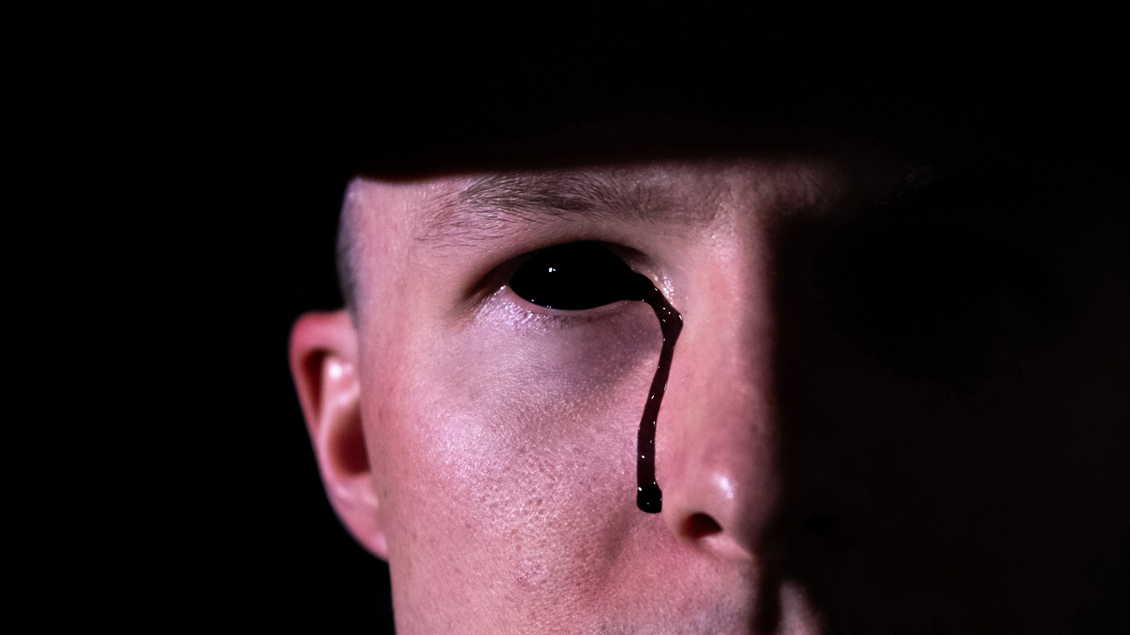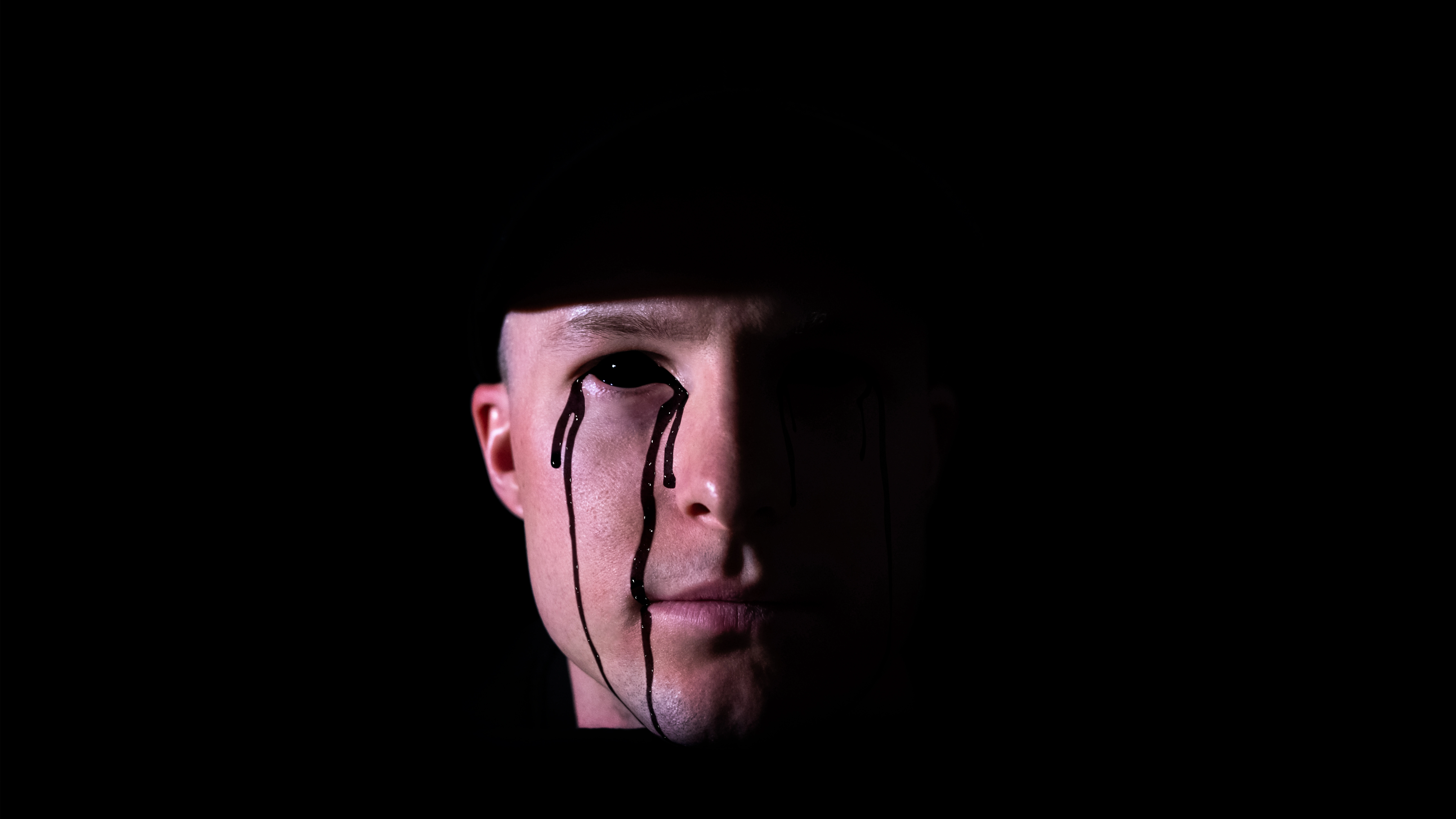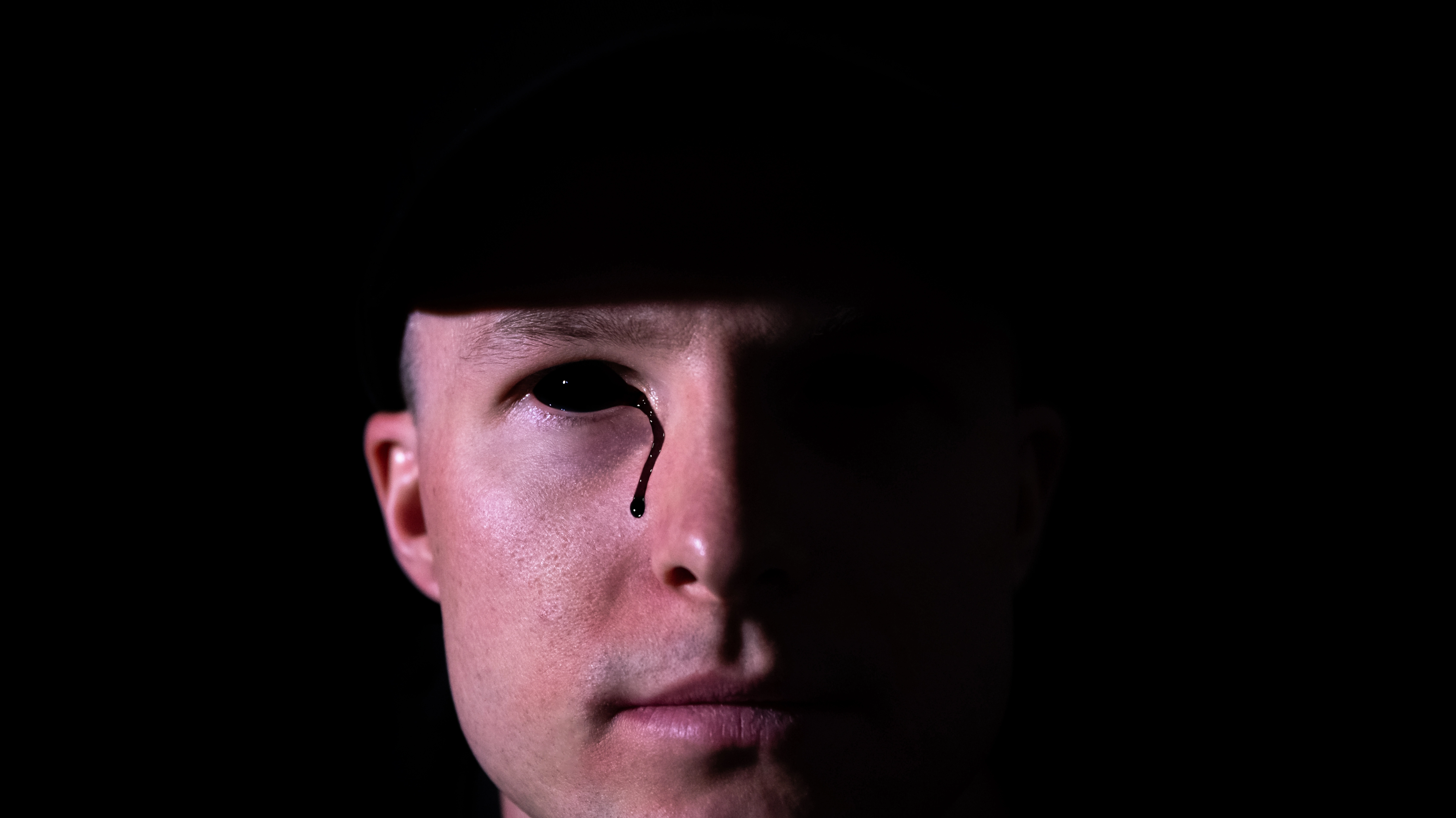 "Bleeding Soul" is a self-portrait of the artist, capturing his face in stillness, pierced by black tears.