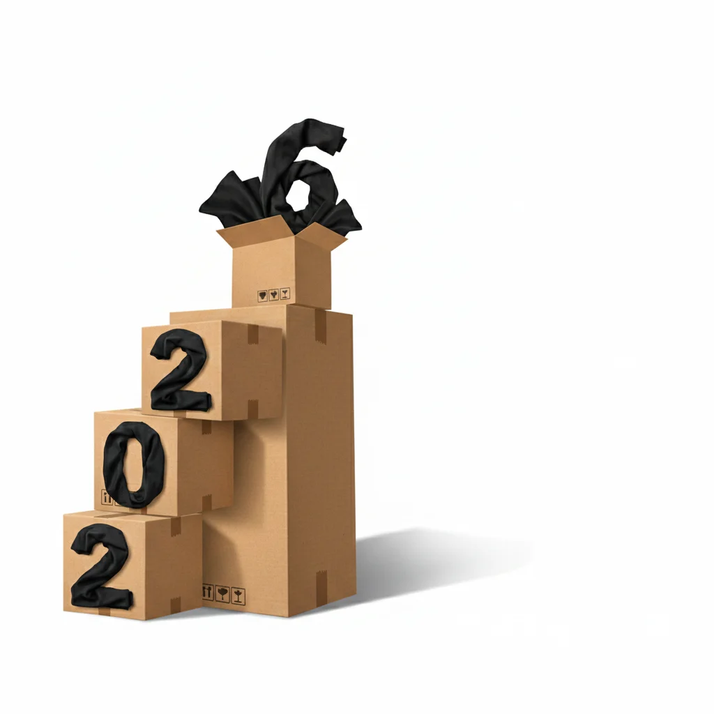 This asset focuses on the psychological "newness" of the New Year. By using vertical cardboard boxes to form the year "2026," the design symbolizes a fresh start and the arrival of new inventory. It is a minimalist approach designed to build curiosity and highlight the physical product delivery aspect of the brand.