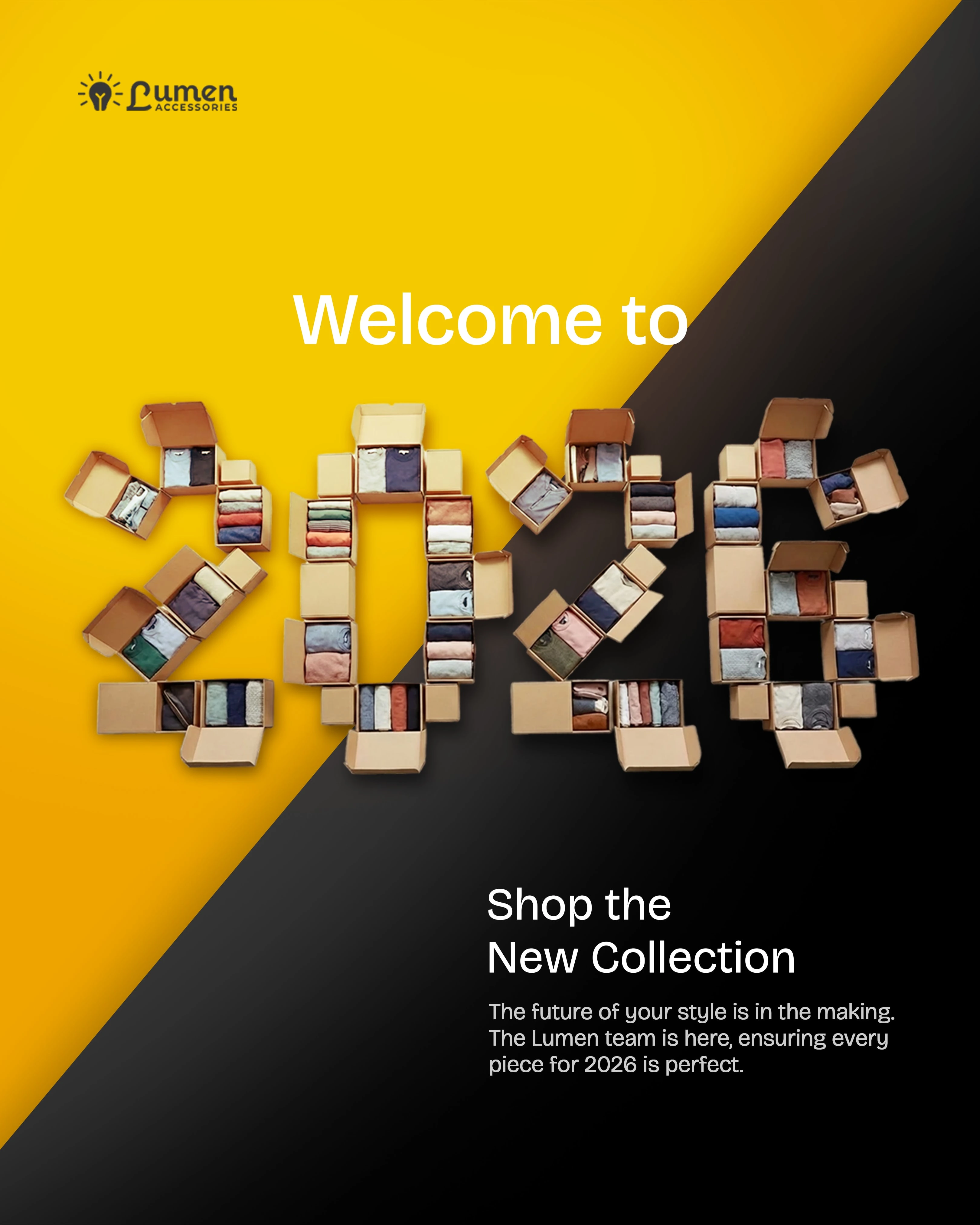 This is the primary "Top-of-Funnel" asset. I used a diagonal, high-contrast yellow-and-black split to create immediate visual tension and stop users from scrolling on social media. The "Welcome to 2026" headline is positioned in the clean space to ensure the brand message is received before the user even looks at the products.