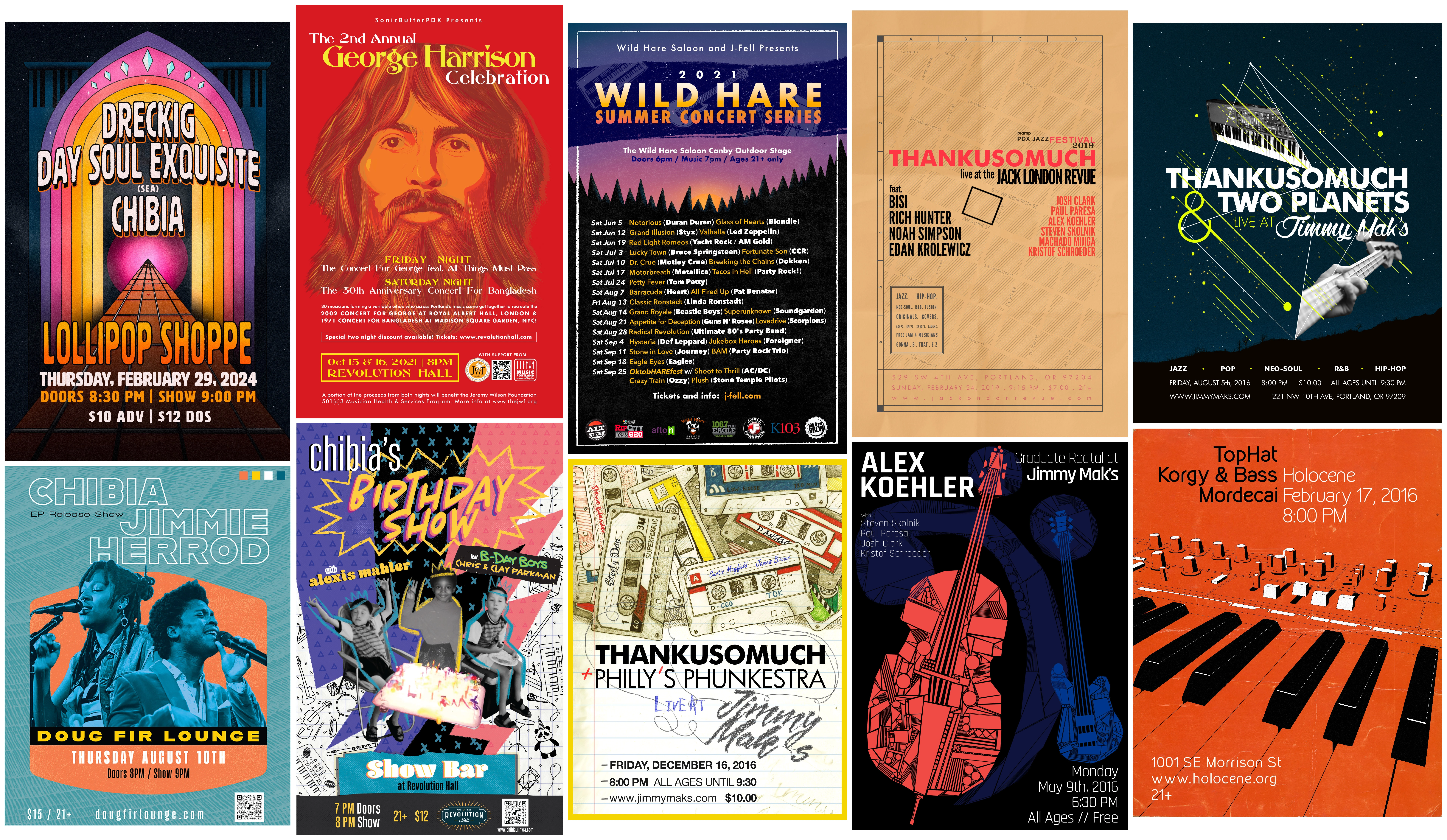 A selection of my favorite concert posters for PDX based bands and musicians. These posters merge custom illustration, cool type pairings, and fun colors.
