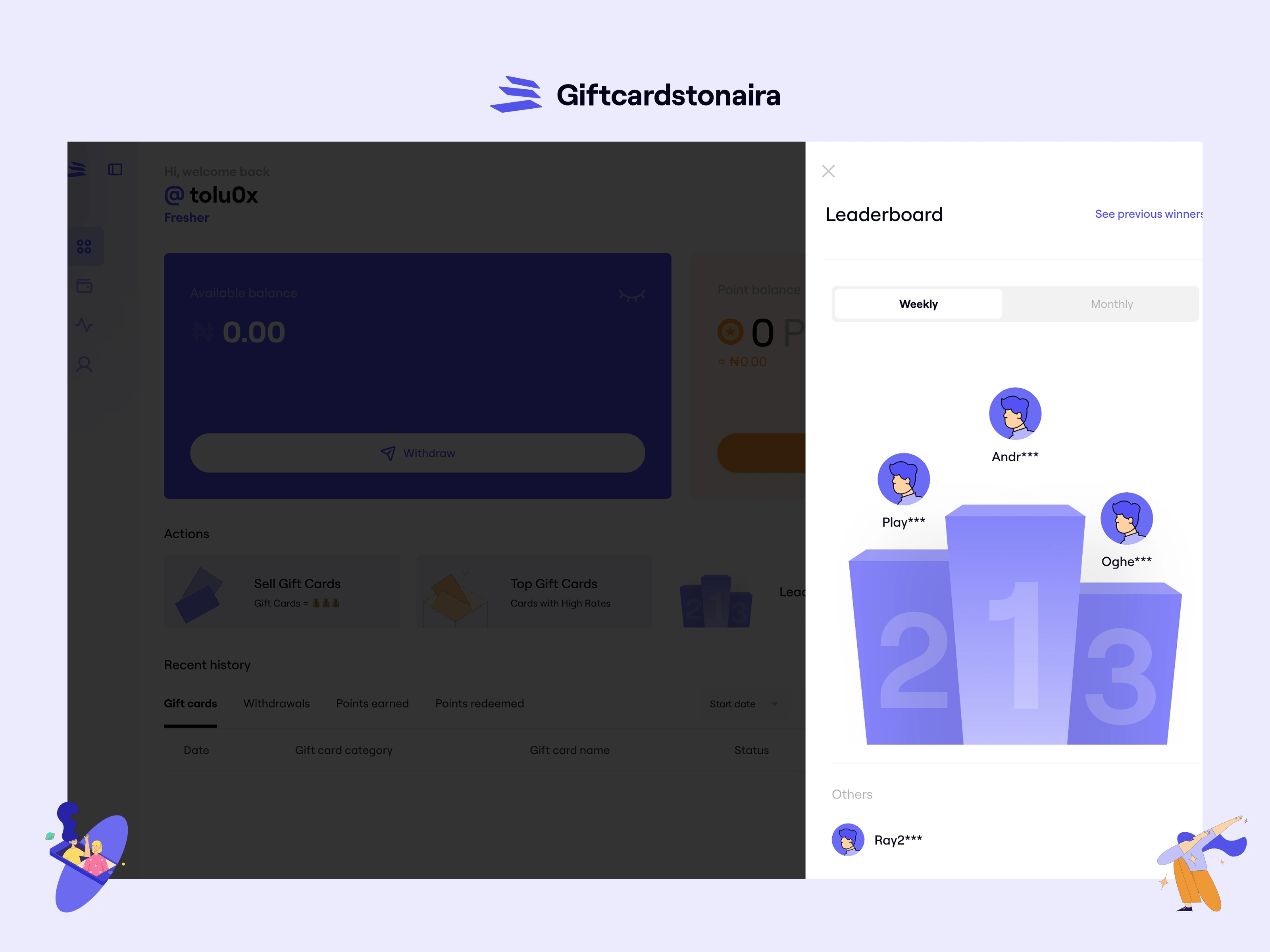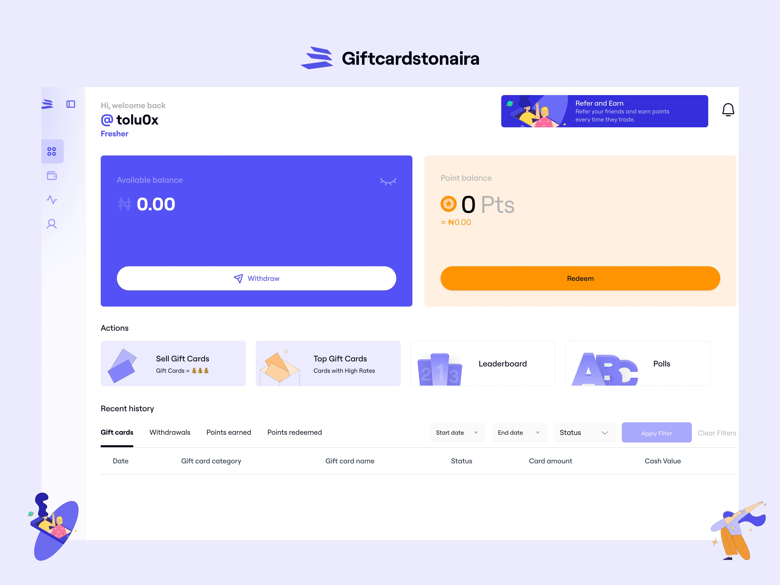 GiftCardsToNaira is a fintech platform operating in Nigeria and Ghana, allowing users to redeem gift cards for fiat currency (Naira or Cedis), pay utility bills, and manage digital wallets.