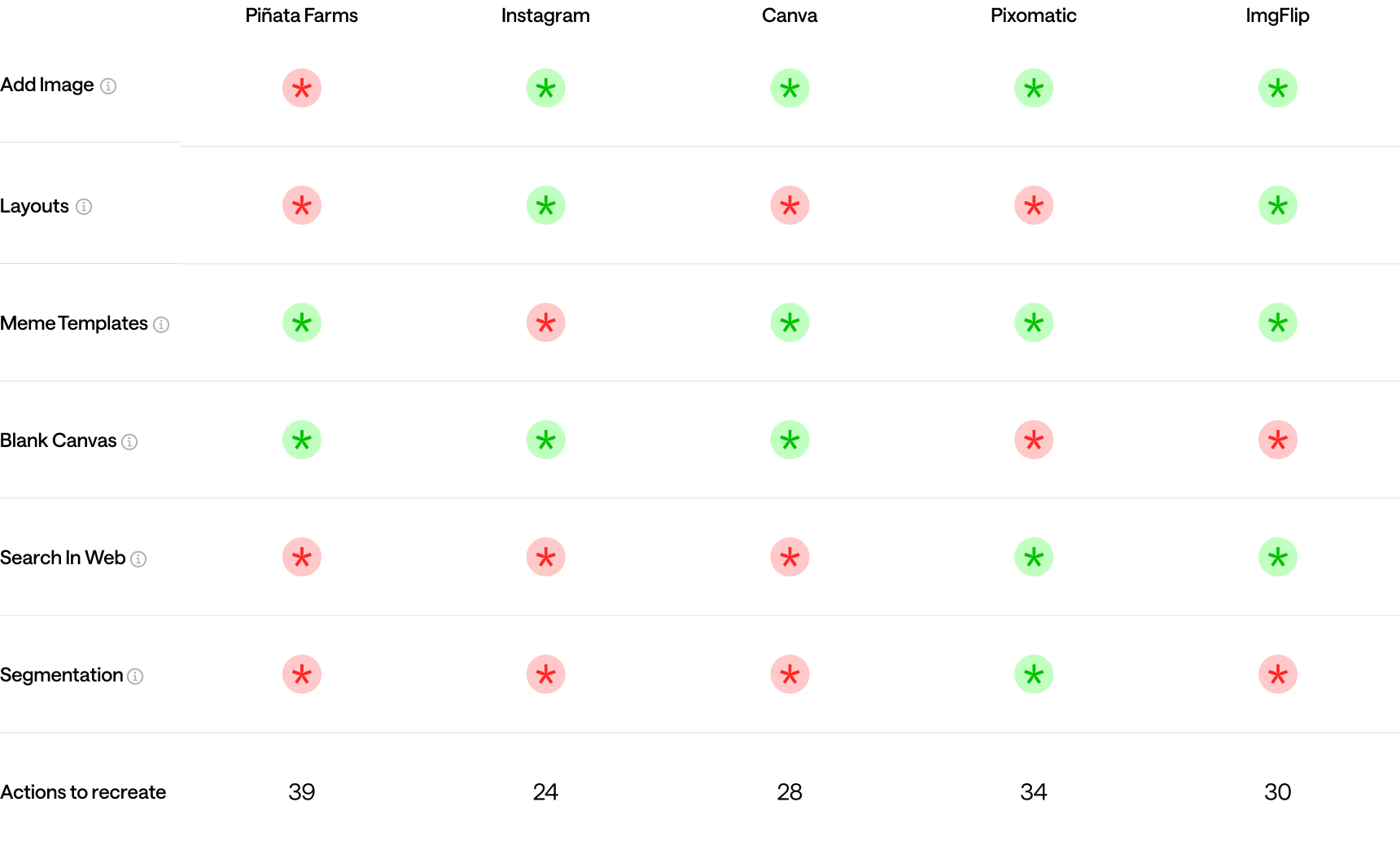 The current version of the app falls short in competition, as Piñata Farms doesn’t support adding full images to the canvas directly. However, this functionality can still be achieved through complex manual workarounds and adjustments.