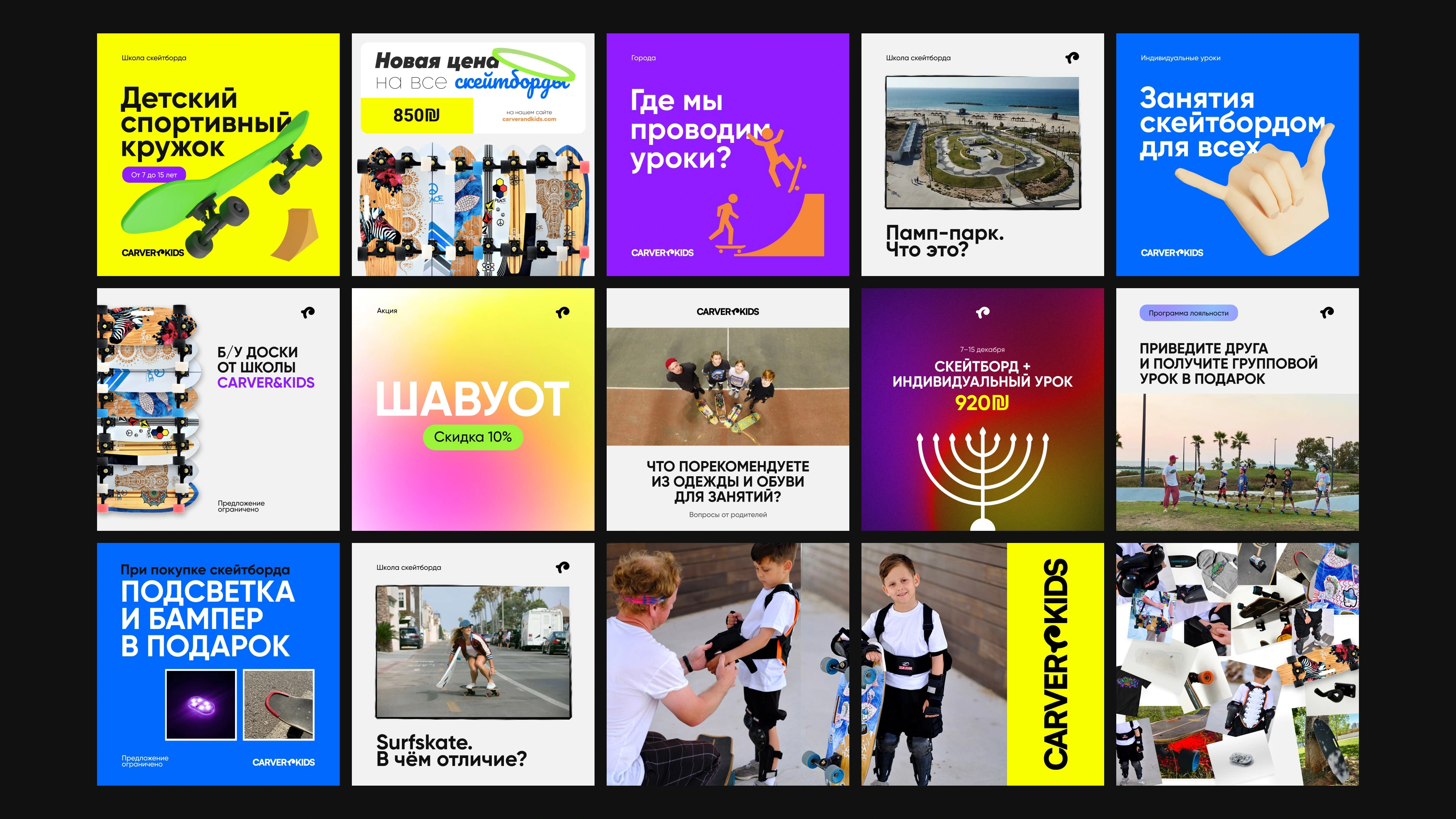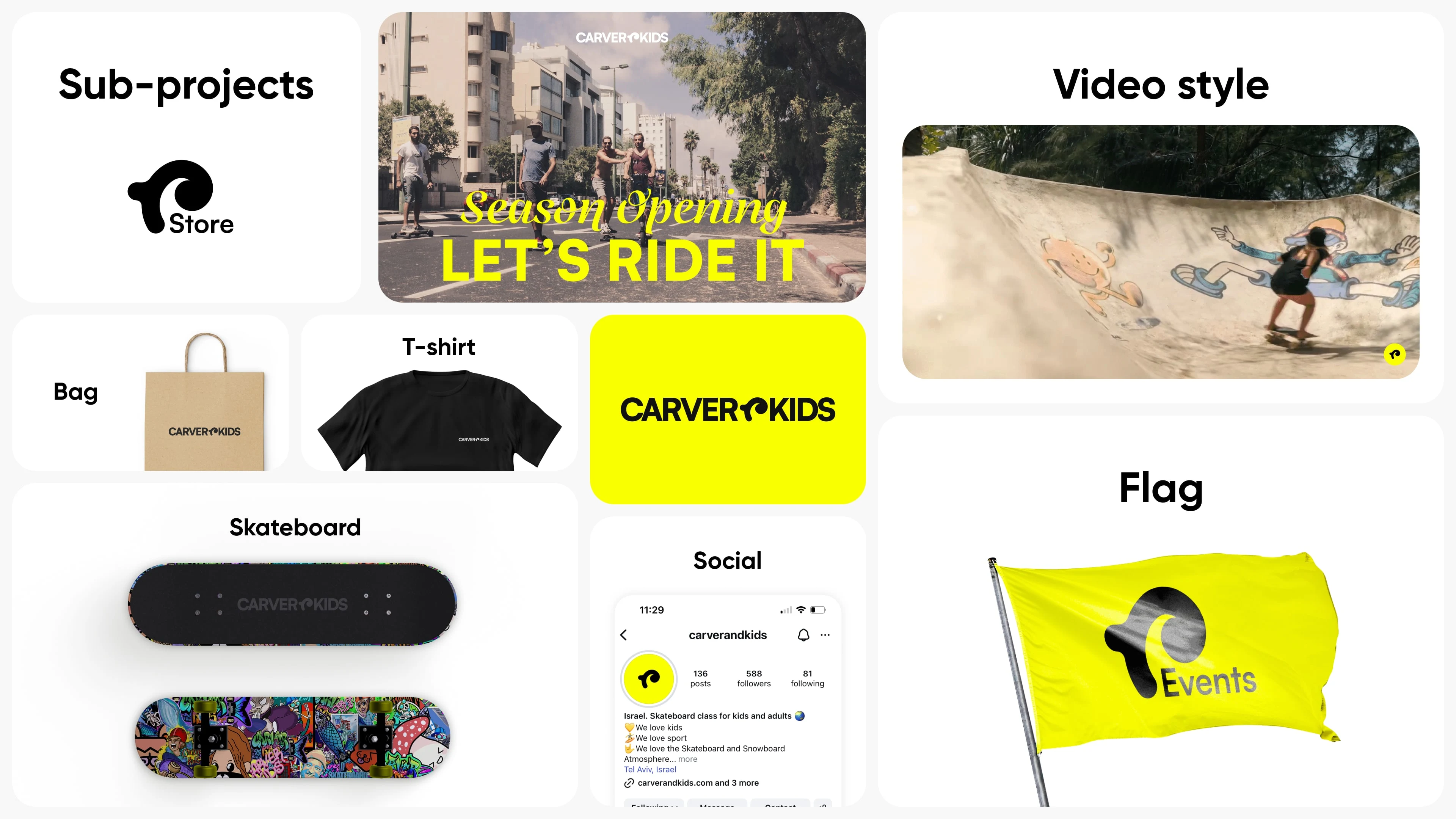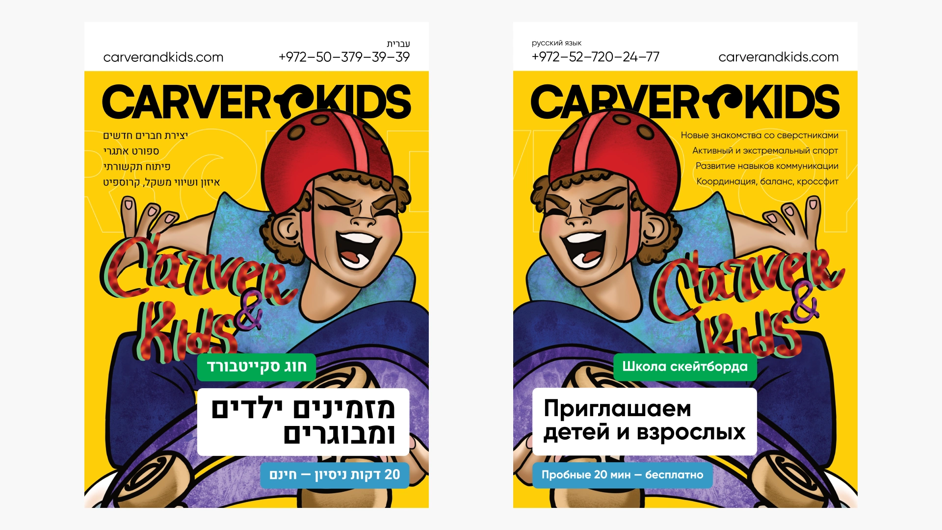 The design system was extended to physical applications, where various experiments were conducted to attract new clients using bright, expressive visuals. All materials were adapted for multilingual use, including left-to-right and right-to-left languages, requiring careful layout and typographic adjustments to maintain clarity and consistency. Products were branded with unique, eye-catching designs — for example, custom graphics on skateboards — to reinforce the brand identity and create memorable experiences. This approach ensured that both physical and digital touchpoints were visually engaging, versatile, and aligned with the school’s playful yet professional character.