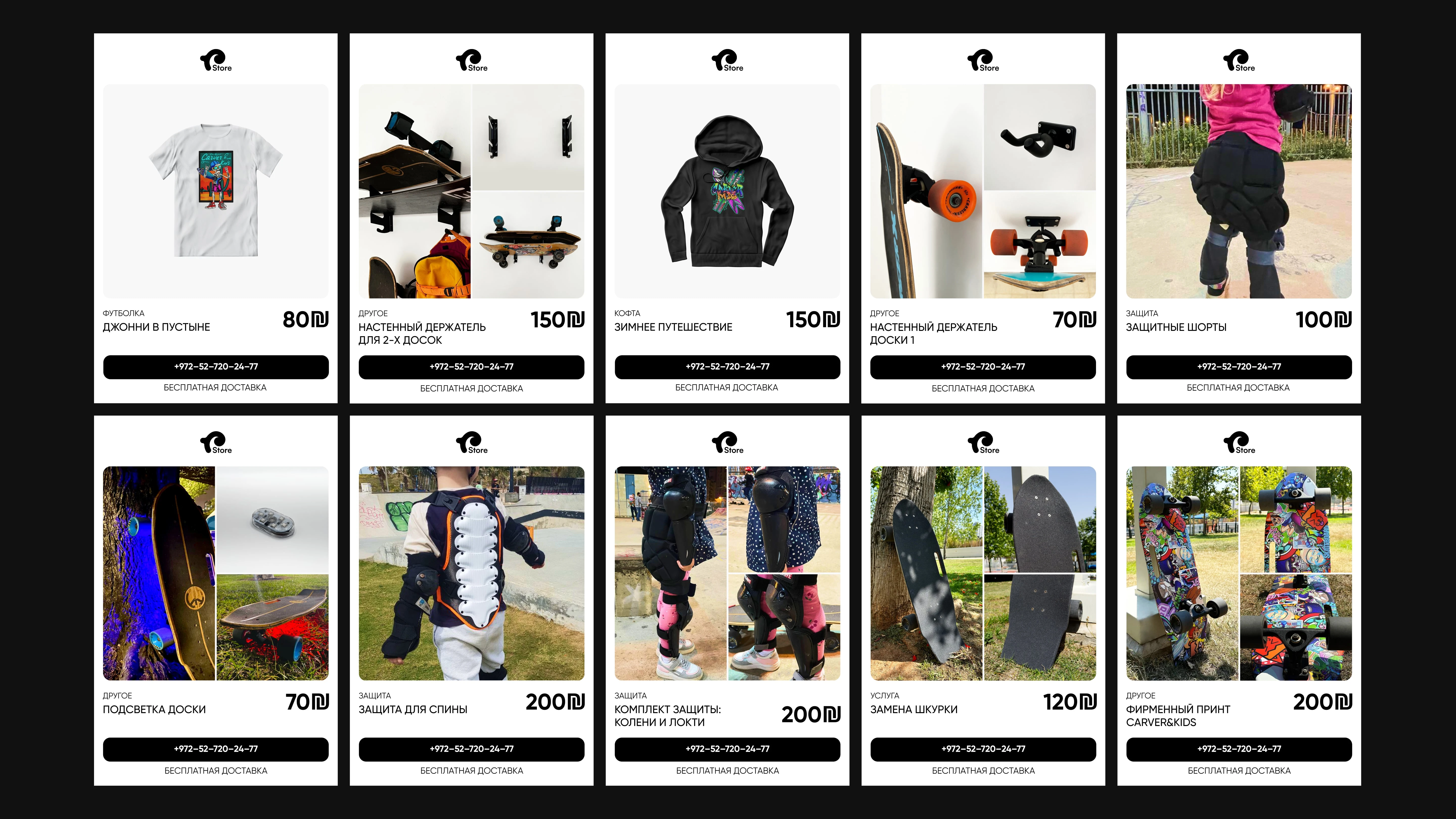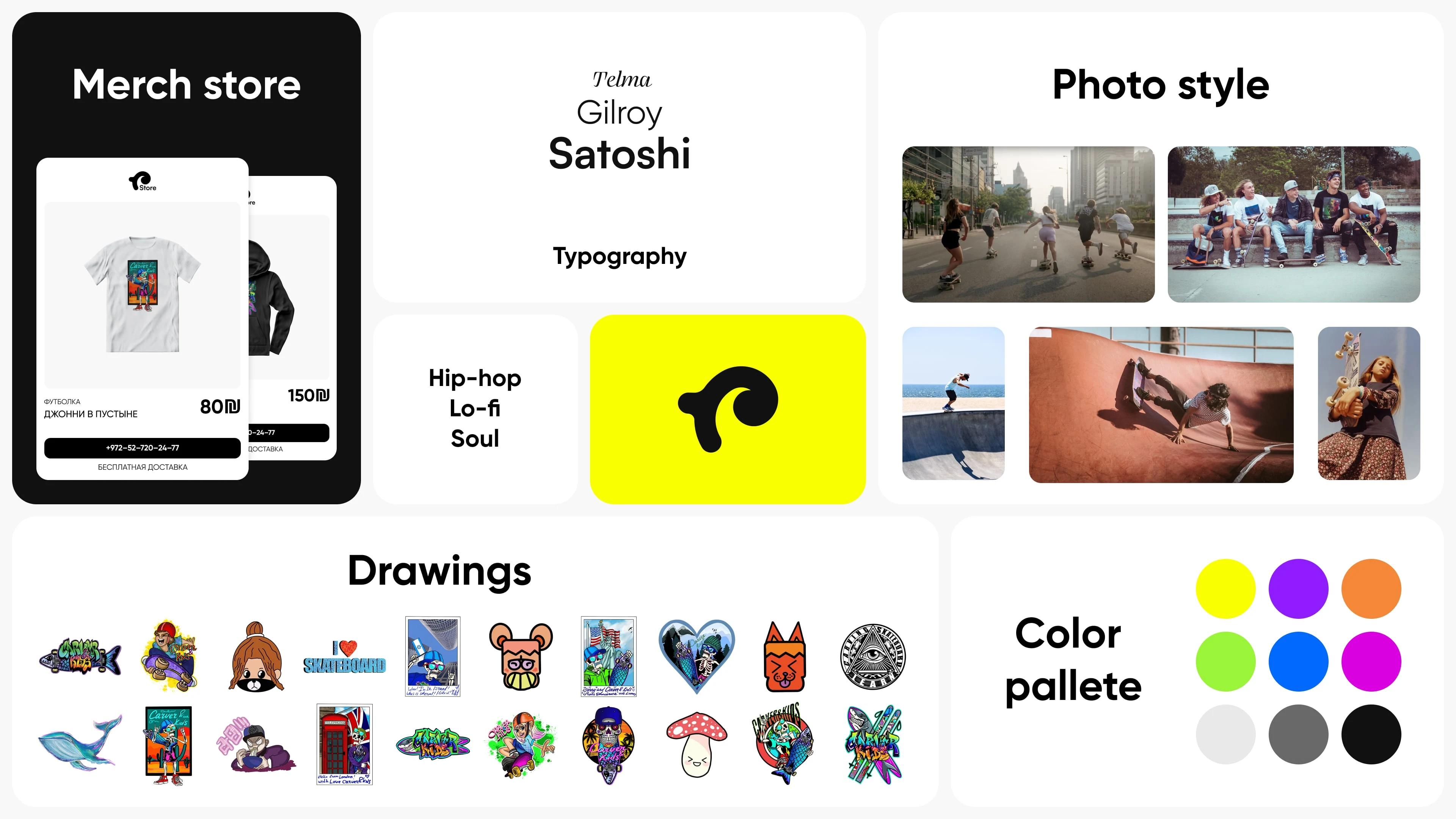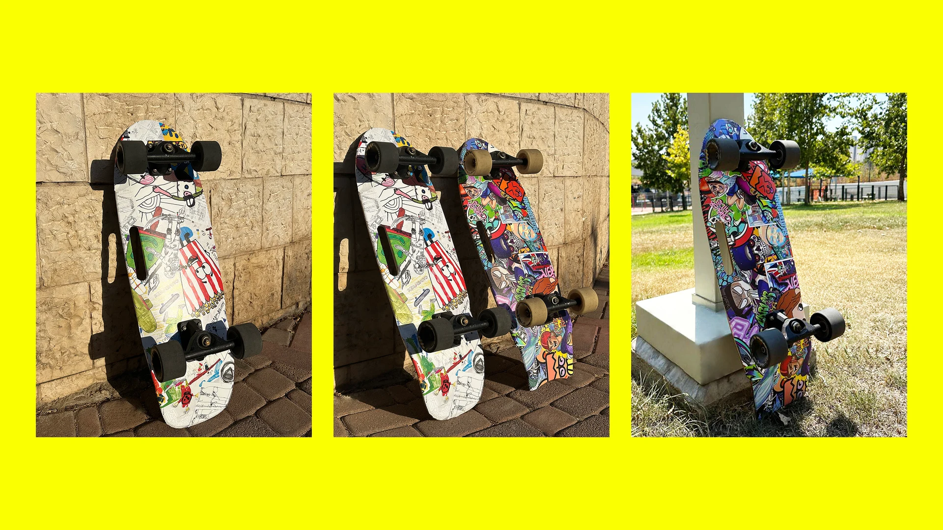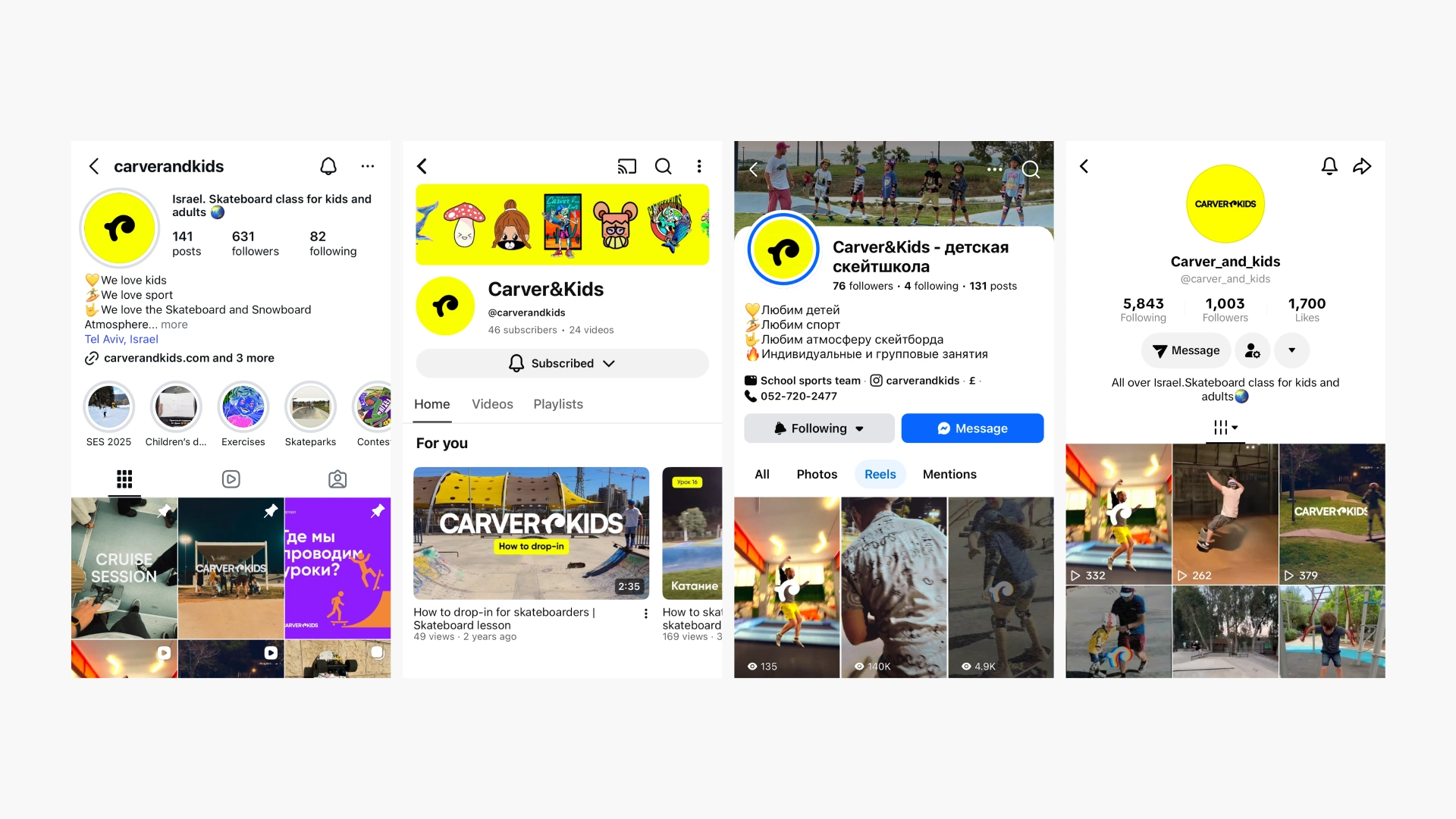 The design system was extended to physical applications, where various experiments were conducted to attract new clients using bright, expressive visuals. All materials were adapted for multilingual use, including left-to-right and right-to-left languages, requiring careful layout and typographic adjustments to maintain clarity and consistency. Products were branded with unique, eye-catching designs — for example, custom graphics on skateboards — to reinforce the brand identity and create memorable experiences. This approach ensured that both physical and digital touchpoints were visually engaging, versatile, and aligned with the school’s playful yet professional character.