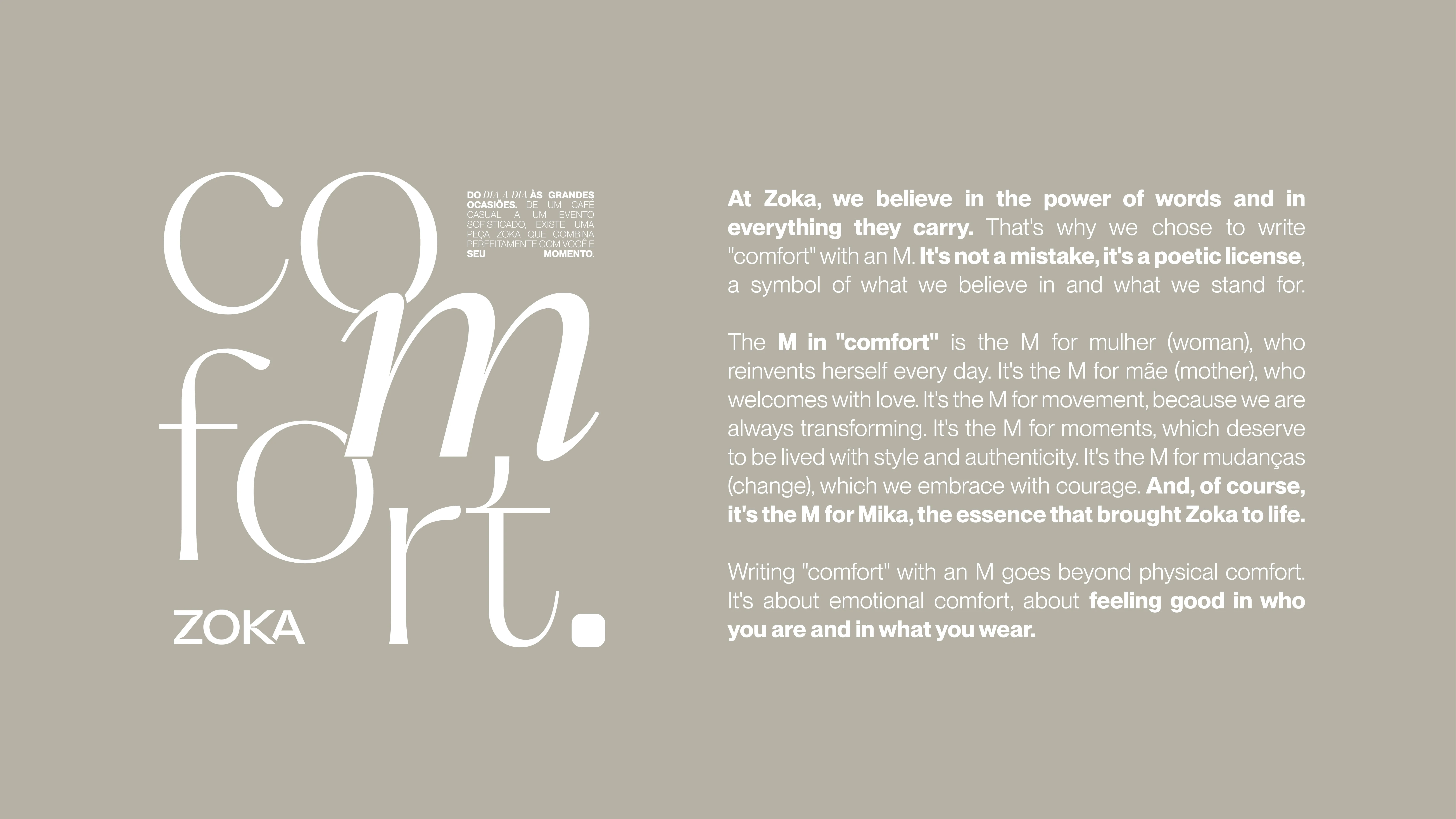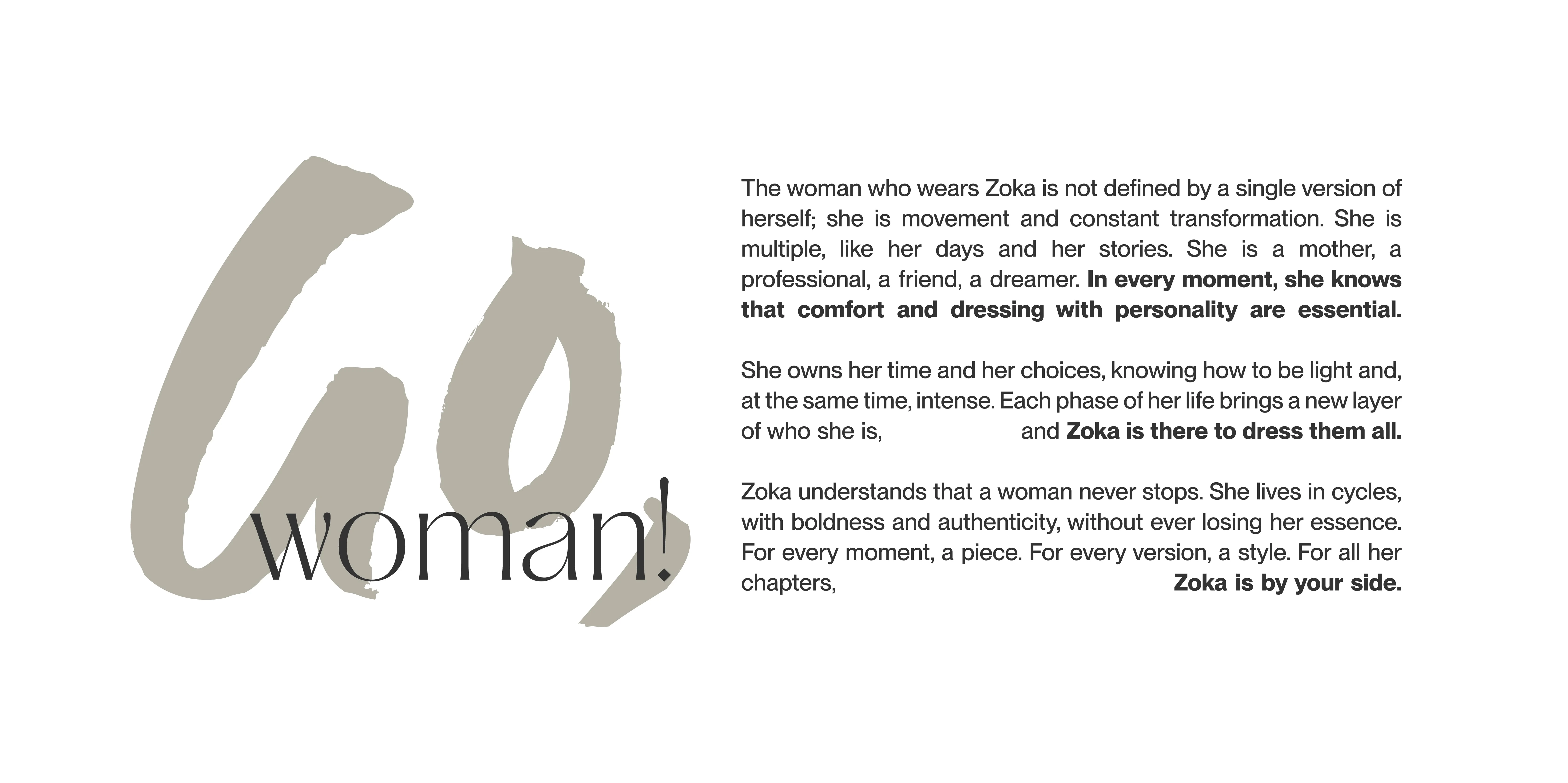 The challenge was twofold. First, to preserve the emotional equity already built with customers, including elements like the signature comfort com M, while giving them strategic meaning, aesthetic clarity, and visual coherence. Second, to translate the real complexity of the Zoka woman: professionals, mothers, students, women with different routines and lifestyles, but united by the same desire to feel good, elegant, and authentically themselves.
