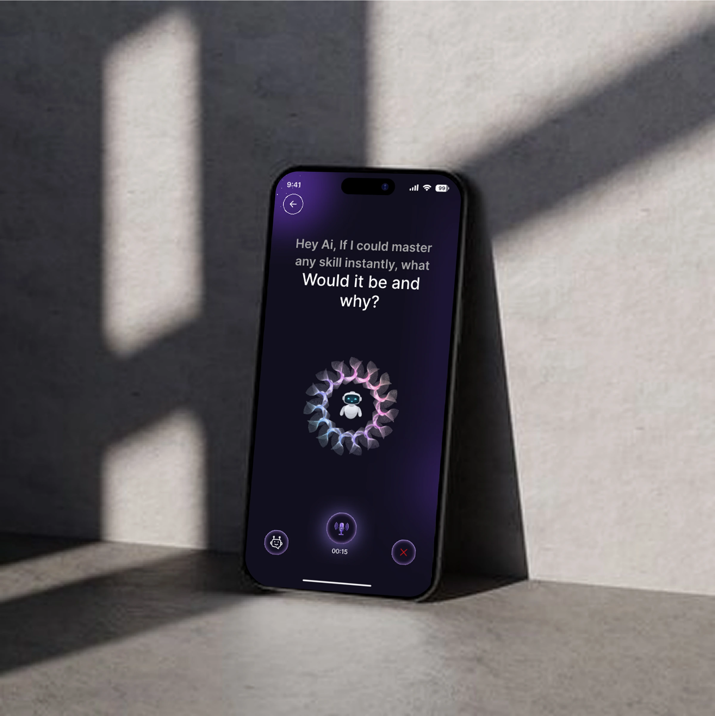 This concept explores a futuristic voice interface that encourages users to reflect on personal growth by asking: “If you could master any skill instantly, what would it be and why?”