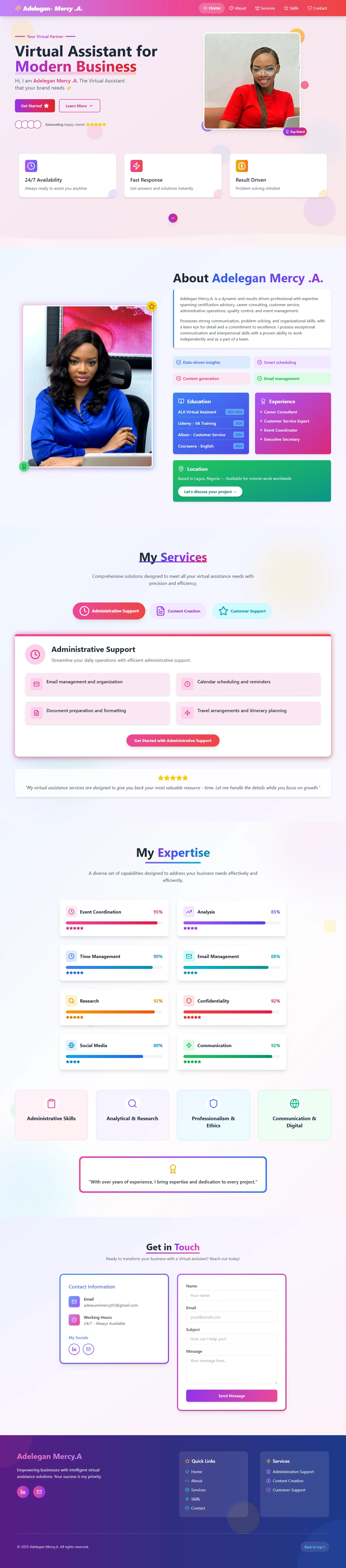 This project involved designing and developing a responsive portfolio website for a professional Virtual Assistant. The aim was to create a digital space that could effectively showcase the VA’s services, experience, and contact channels while reflecting a clean, professional brand image. The site was built using React and Tailwind CSS, incorporating modern design principles, smooth animations, and performance optimization techniques to ensure an engaging user experience.