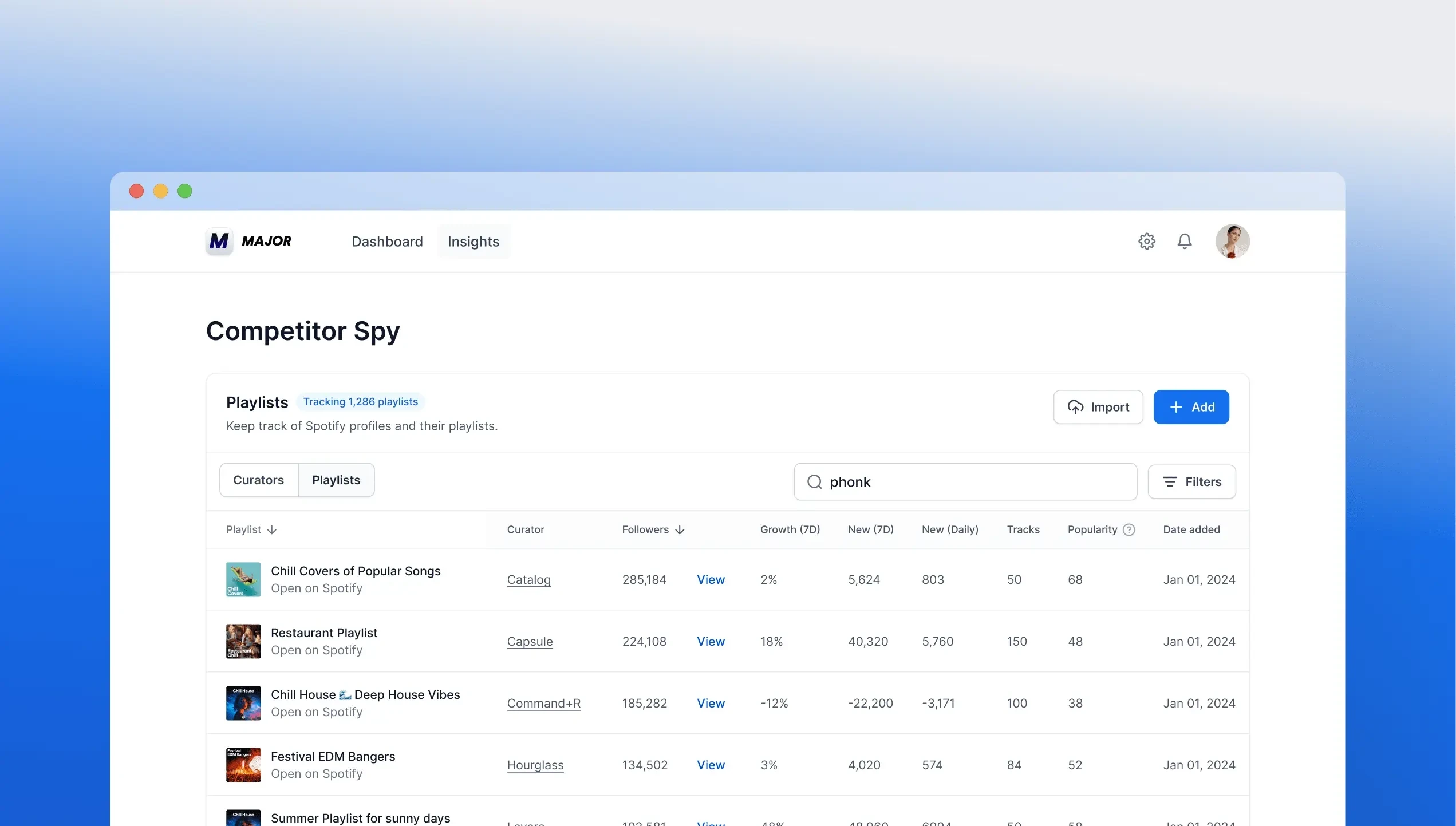 We automated playlist tracking, keyword analysis, and competitor monitoring. For the frontend, we used WeWeb to create dashboards that Major's clients could access directly. The entire system was built to scale with their business.