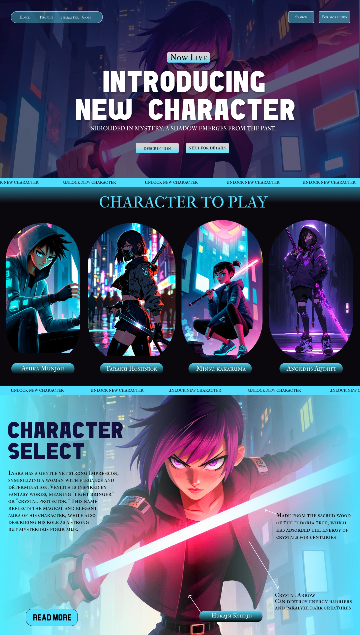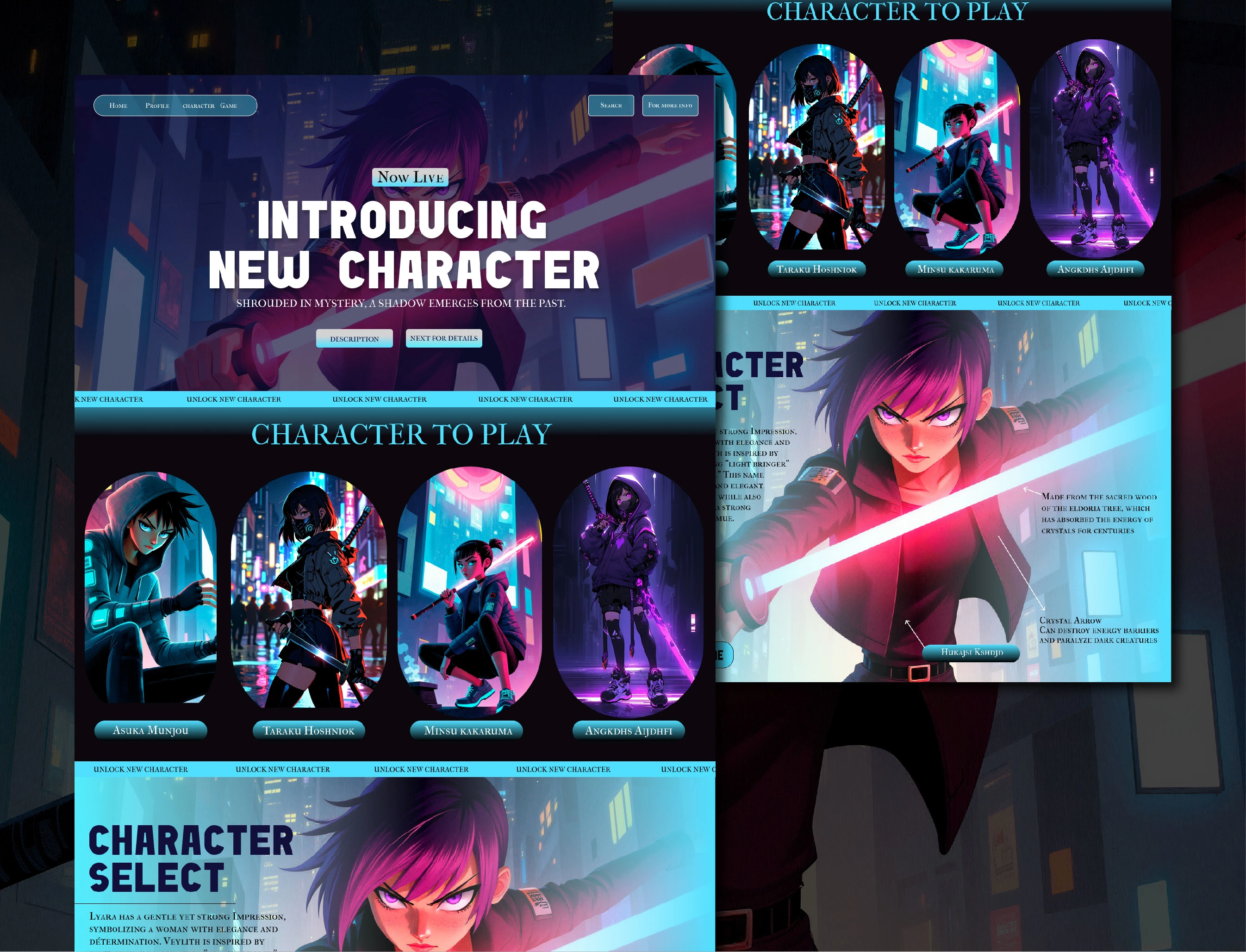 The design embraces a neon-lit cyber world aesthetic — inspired by anime and sci-fi environments. The interface merges bold typography, glowing gradients, and cinematic visuals to create a high-energy, immersive experience. Each section is crafted to capture the player’s attention while maintaining clarity and balance.