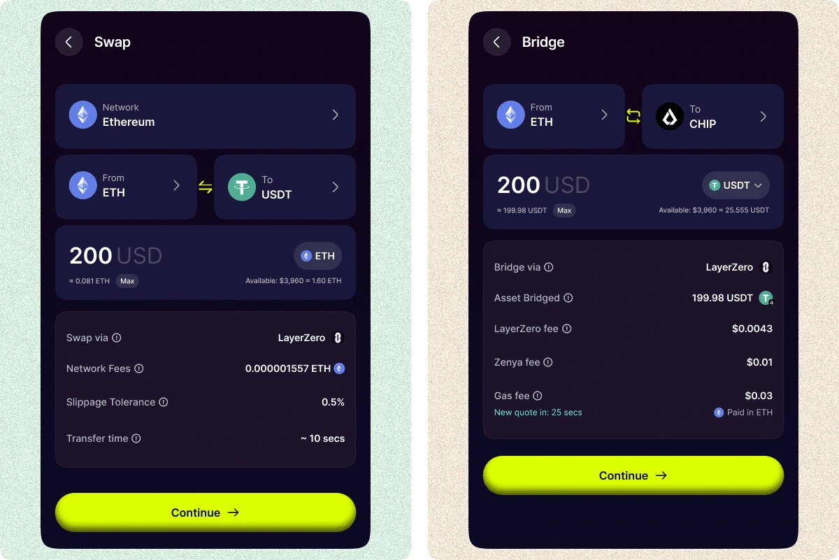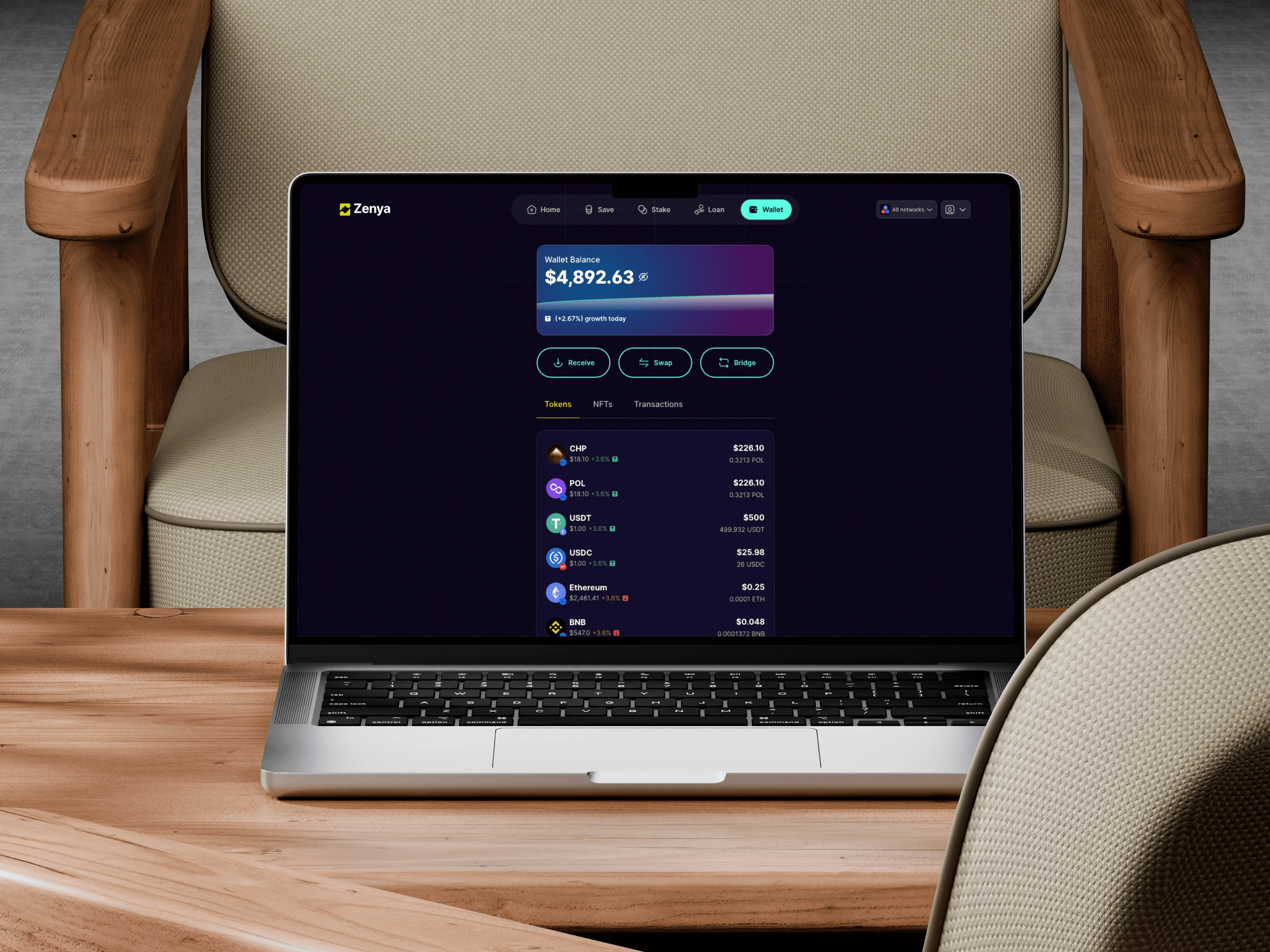 Most crypto wallets feel sterile and intimidating. Zenya's wallet was built for daily use: fund with fiat or crypto, swap and bridge without jargon, and track balances in human terms ("Sent ₦10,000 worth of USDT to John"). Instead of a dashboard, it became a familiar companion for financial actions.