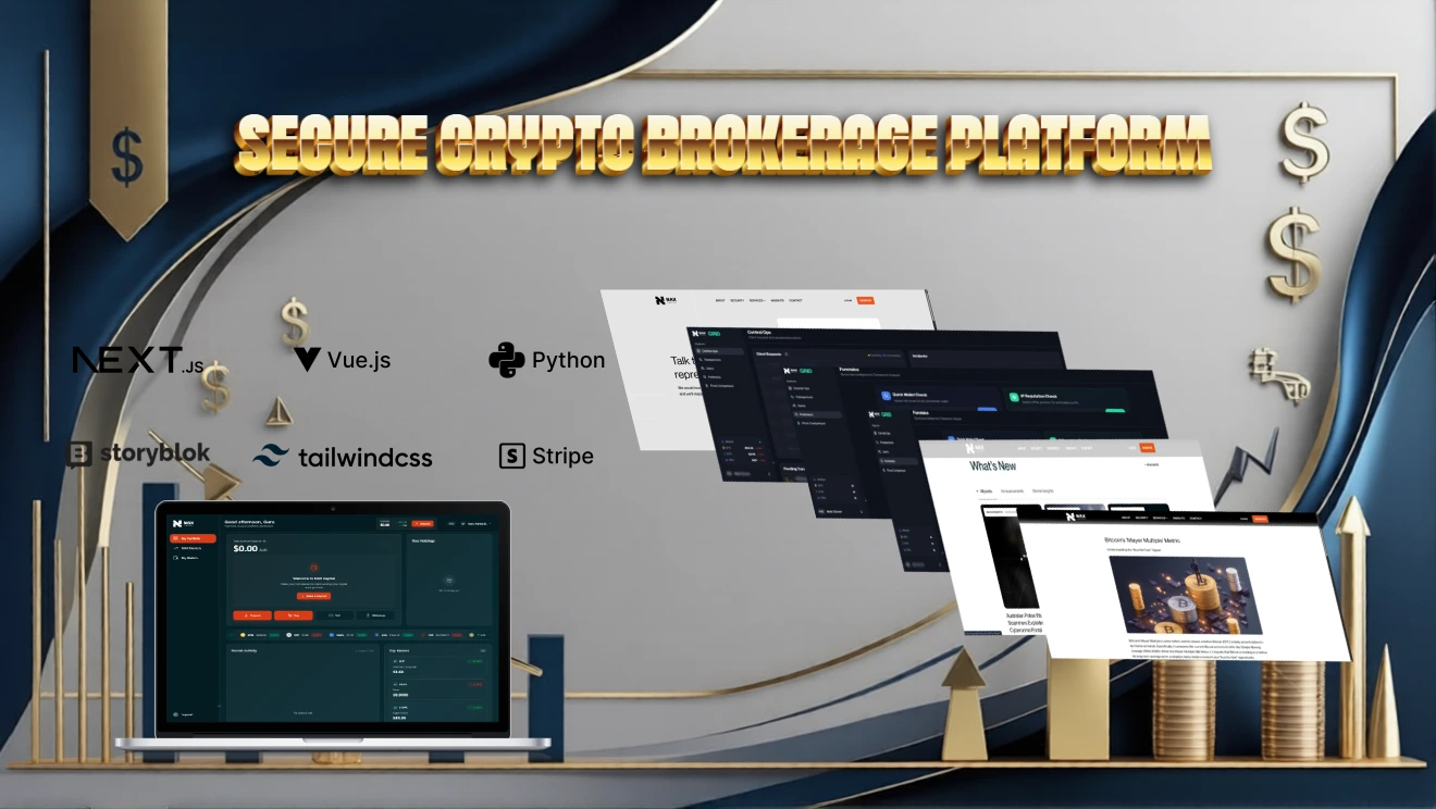 The company needed a high-trust, regulated crypto brokerage platform. The public site required marketing + SEO (Storyblok + Next.js), while the authenticated dashboard required a dynamic trading interface (Vue + Python backend).