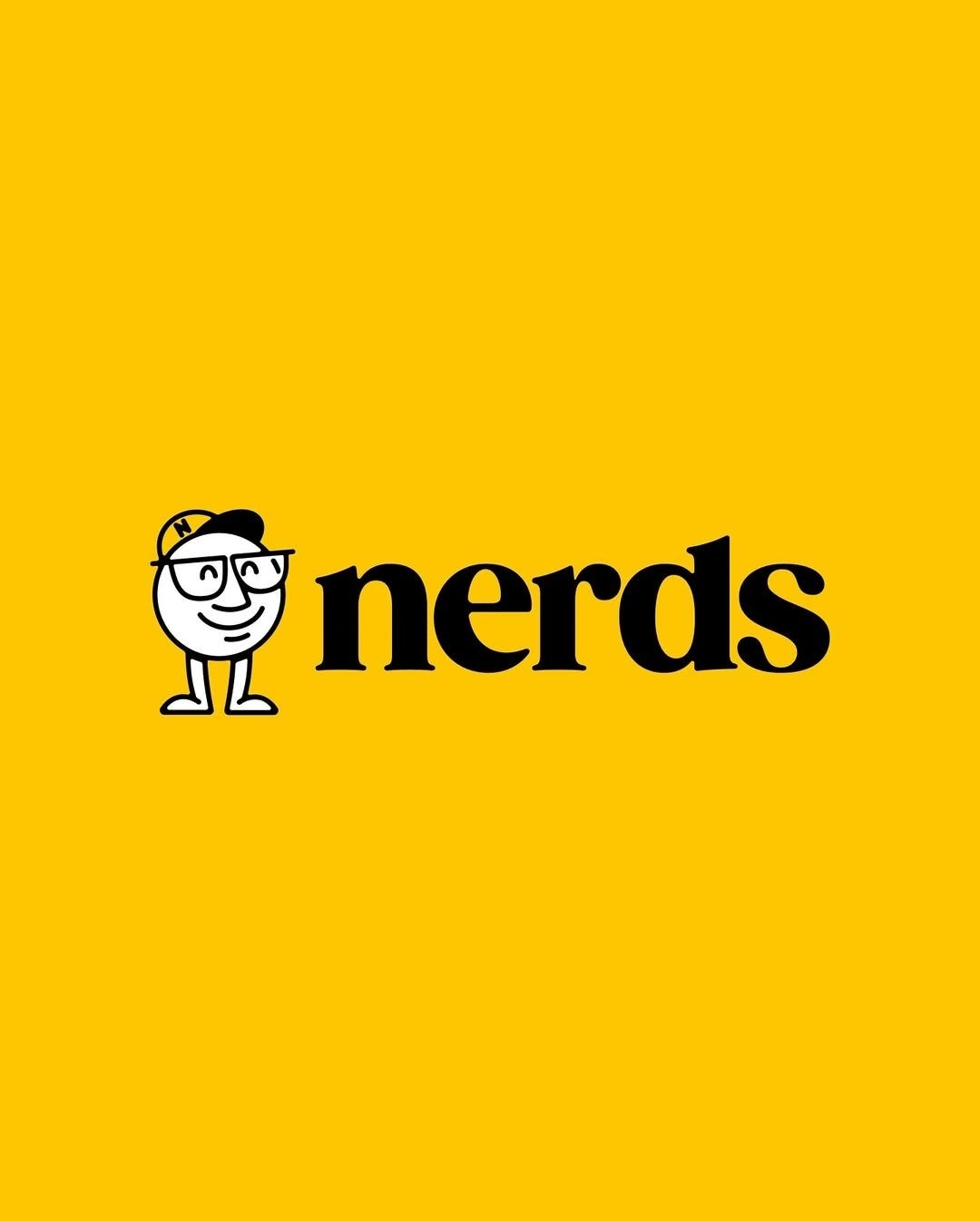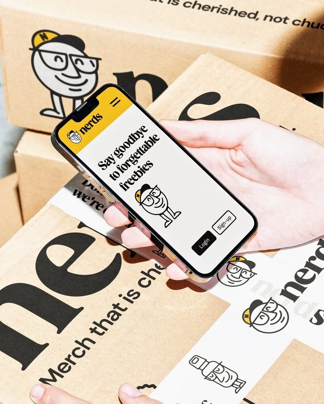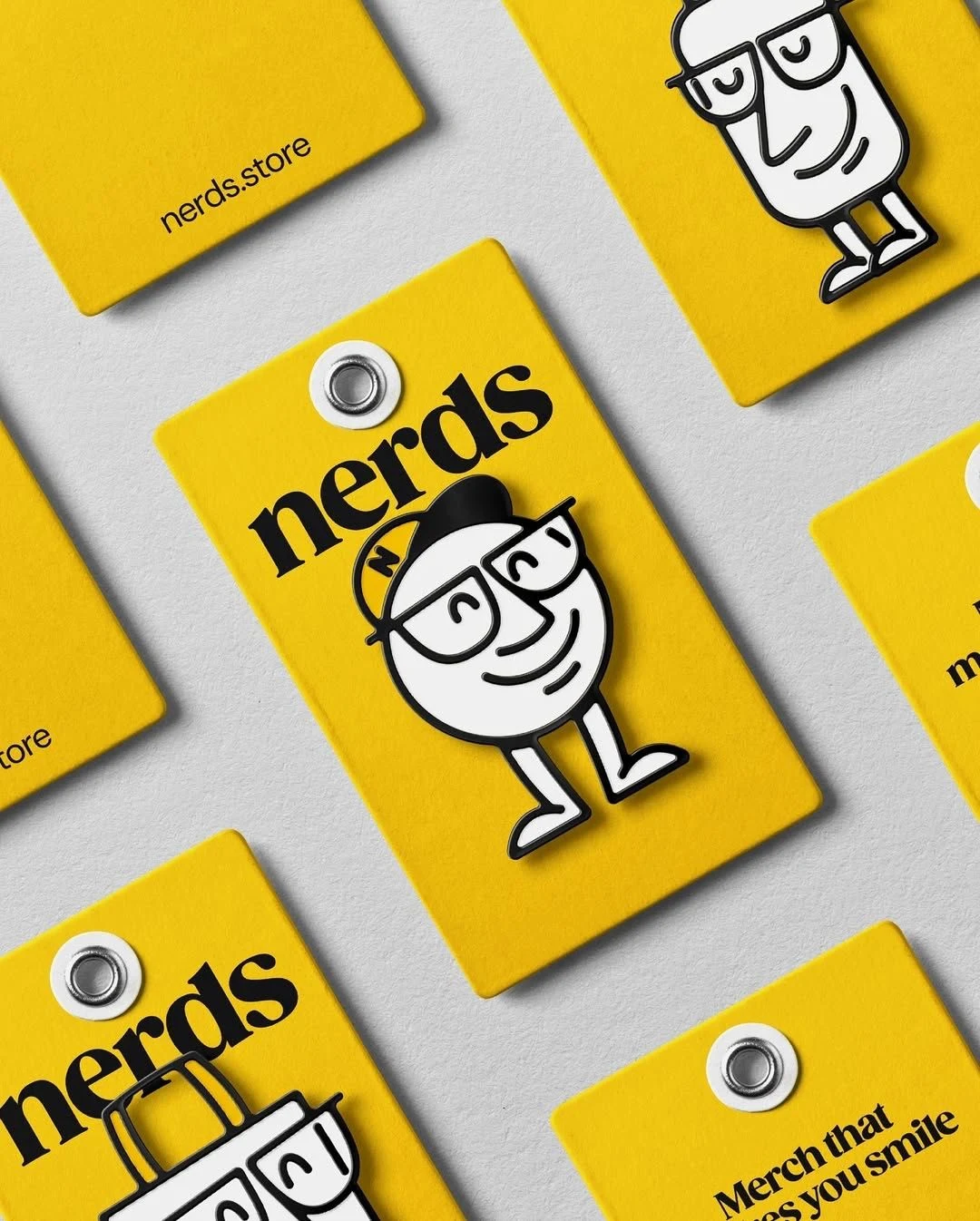 The product tags (shown in the images) carry the bold “nerds” typeface, creating an instantly recognizable branding element. The playful character and consistent use of yellow across all product lines help ensure the brand feels unified.