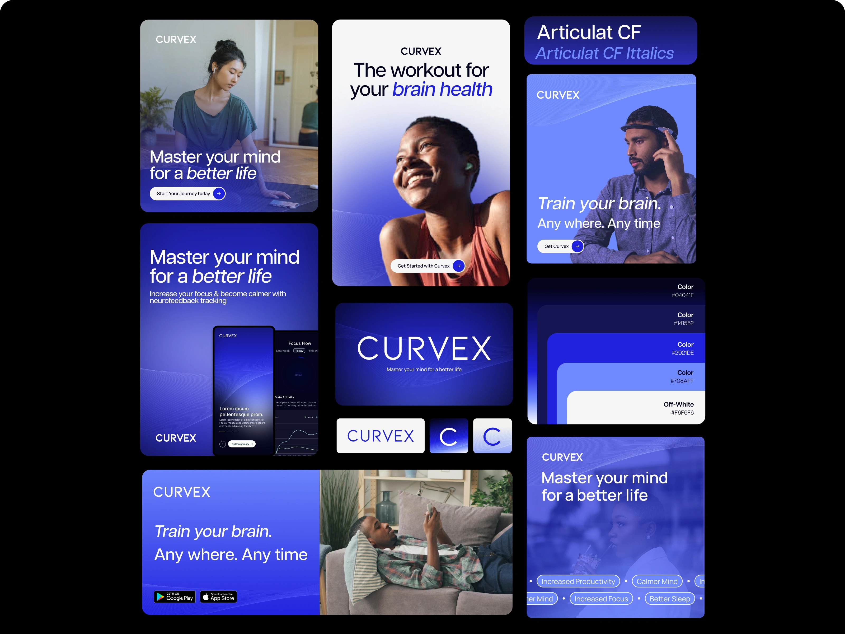 Brand identity for a neurofeedback wearable startup.Color system, typography, app UI direction, and marketing visuals based on the existing logo.