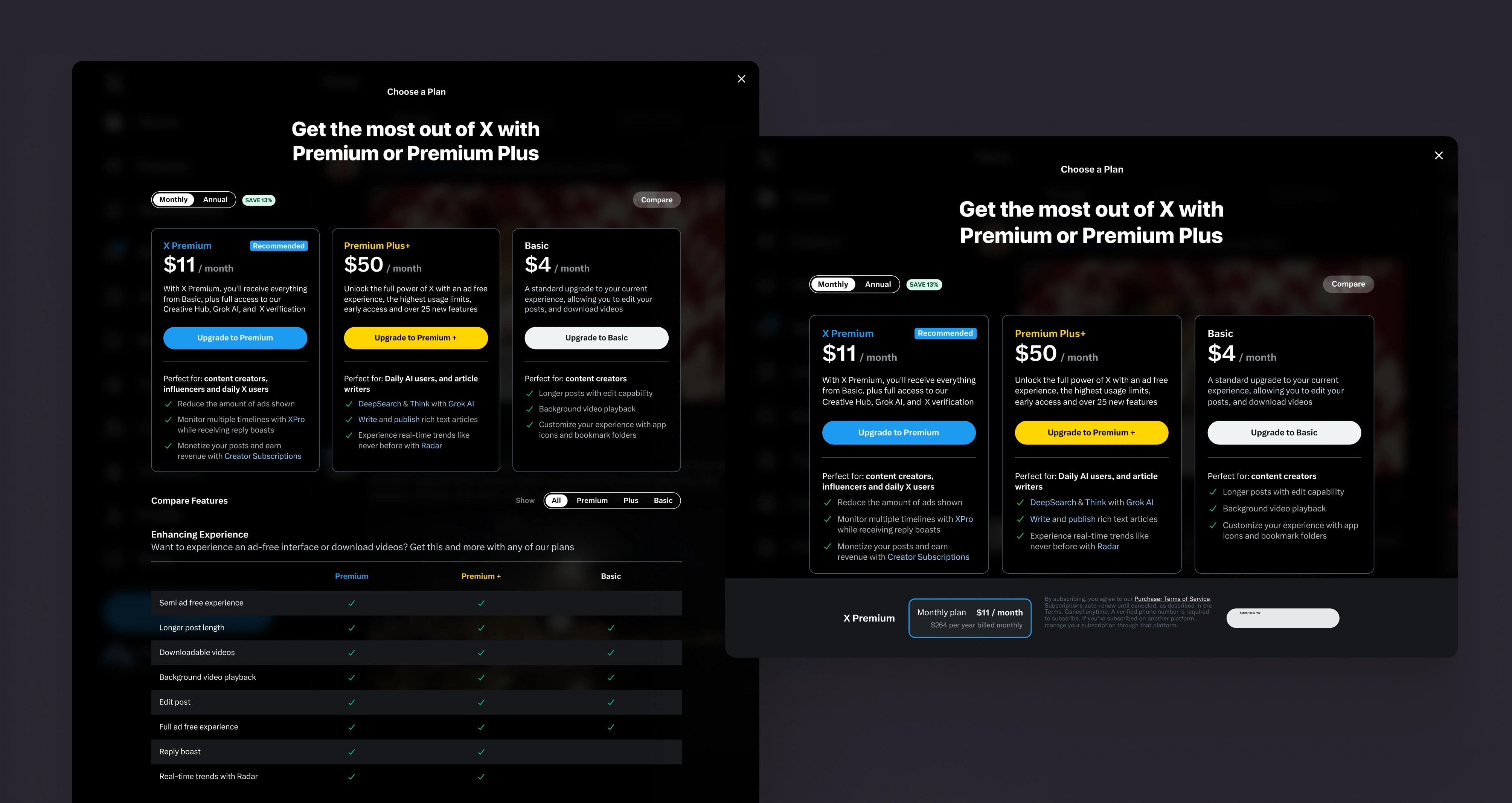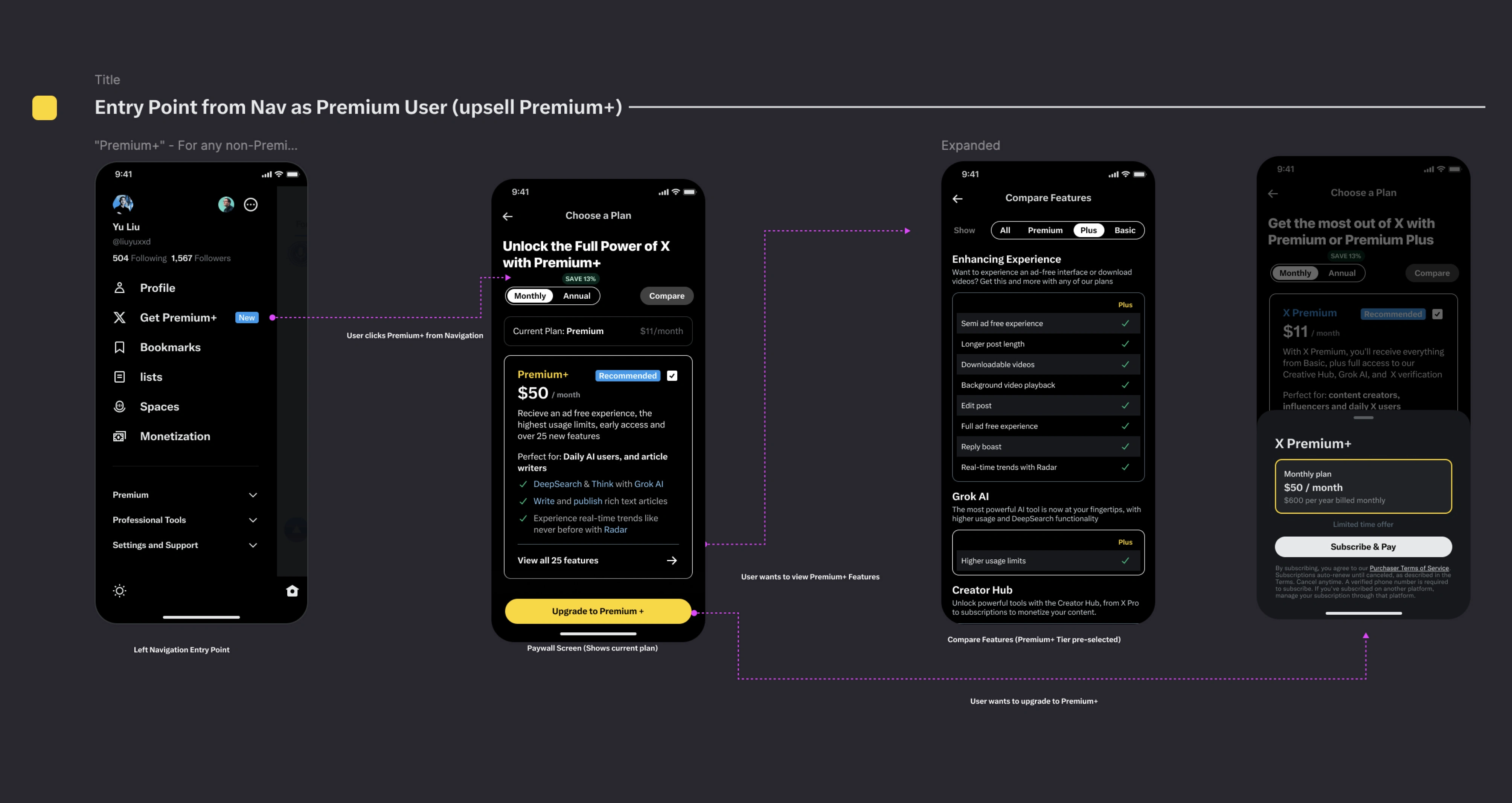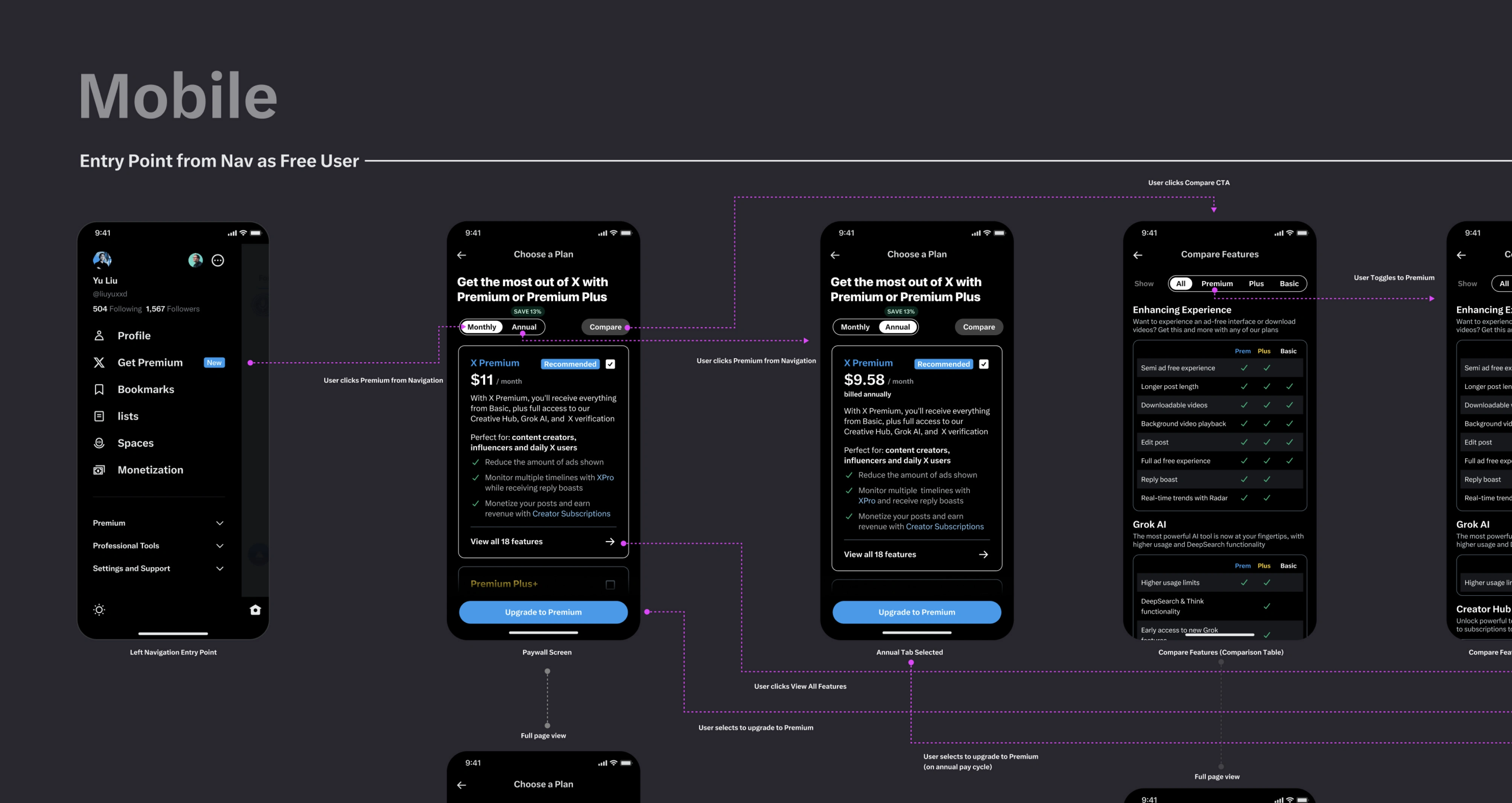 X.com with Premium Plus features. After taking a full UX audit of the current twitter workflows across responsive web and native mobile experiences, I also researched various high traffic paywall experiences, both directly and indirect competitors prior to conceptualizing a design.
